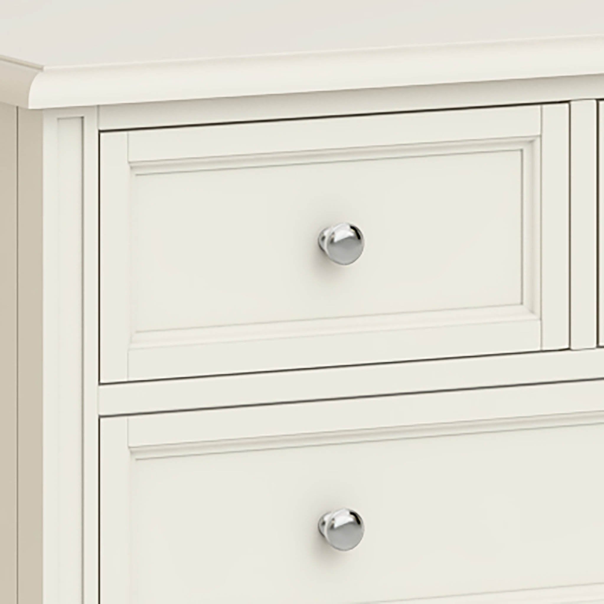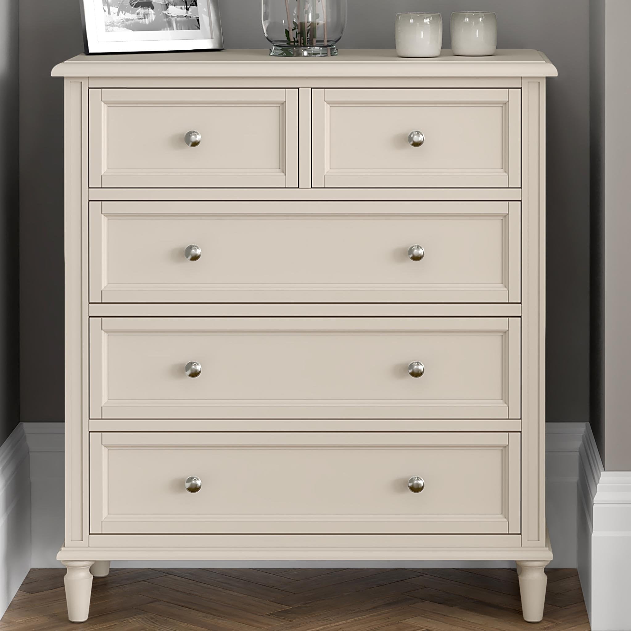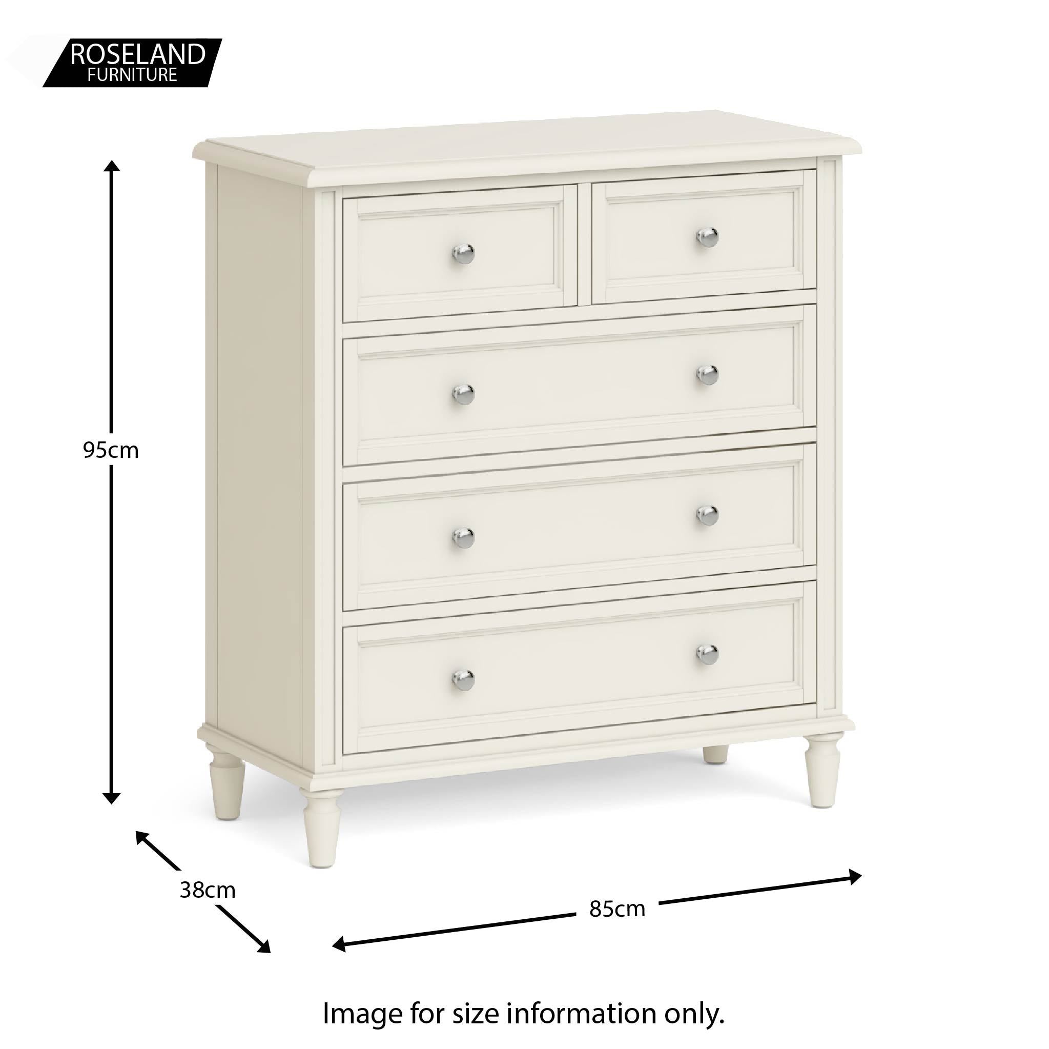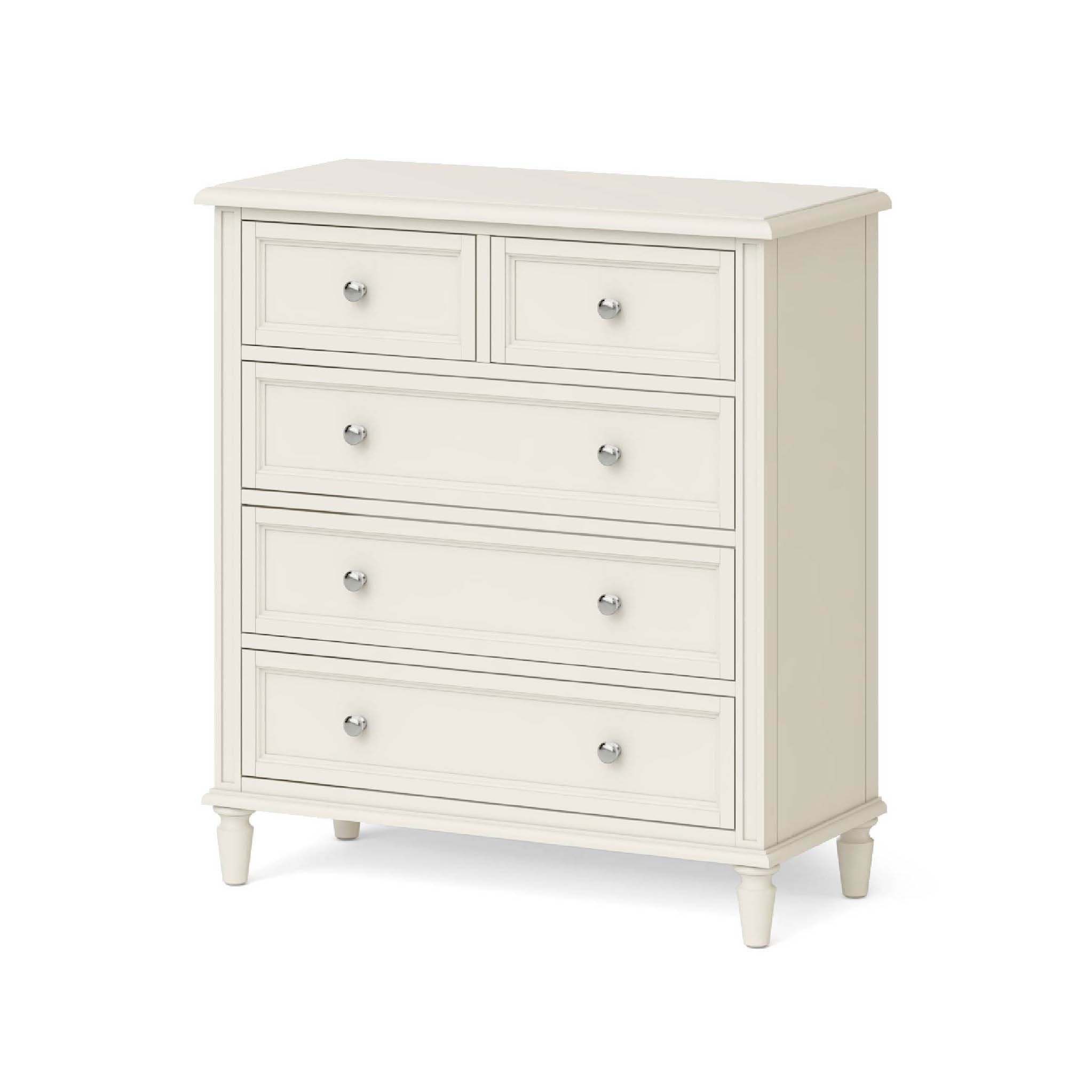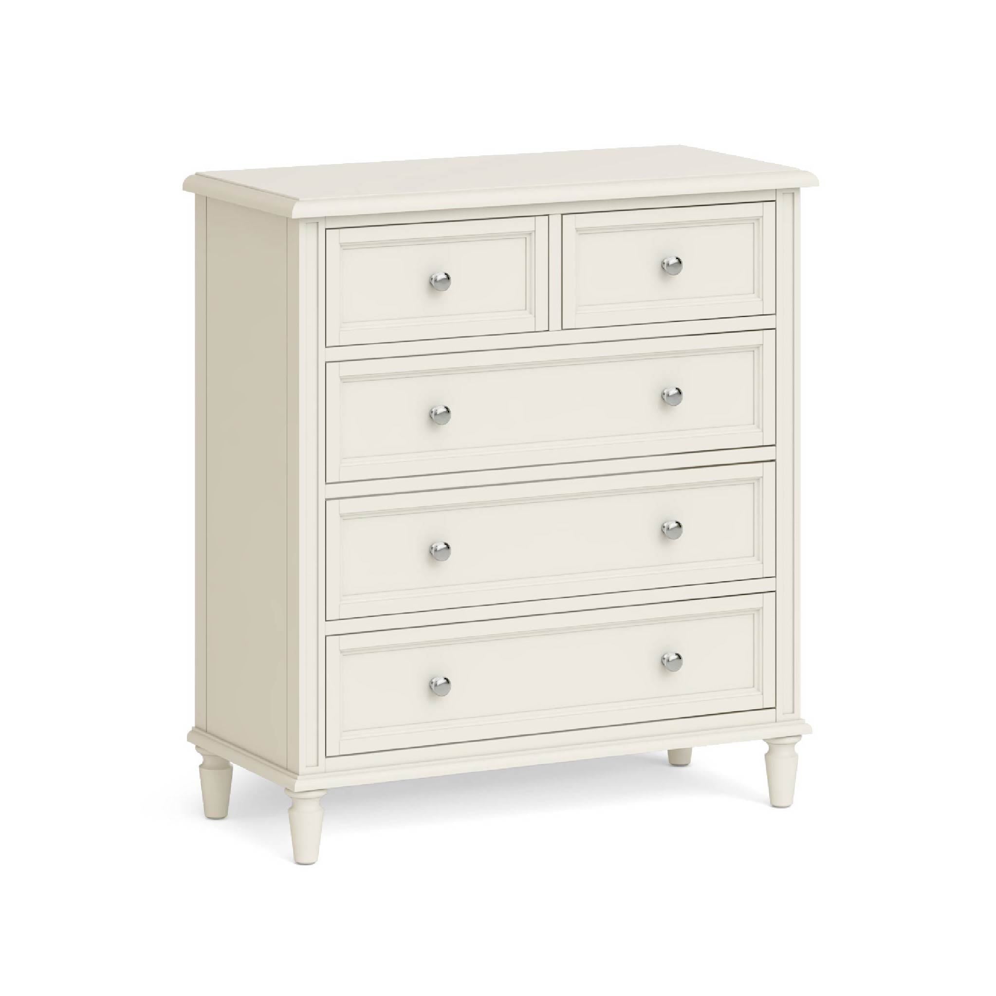 This stunning chest of drawers will bring a generous amount of storage to any room. It features three large drawers with a further two smaller drawers above. The cream painted hardwood frame and top, with turned legs and bevelled edges, give a real classic French feel to the piece.