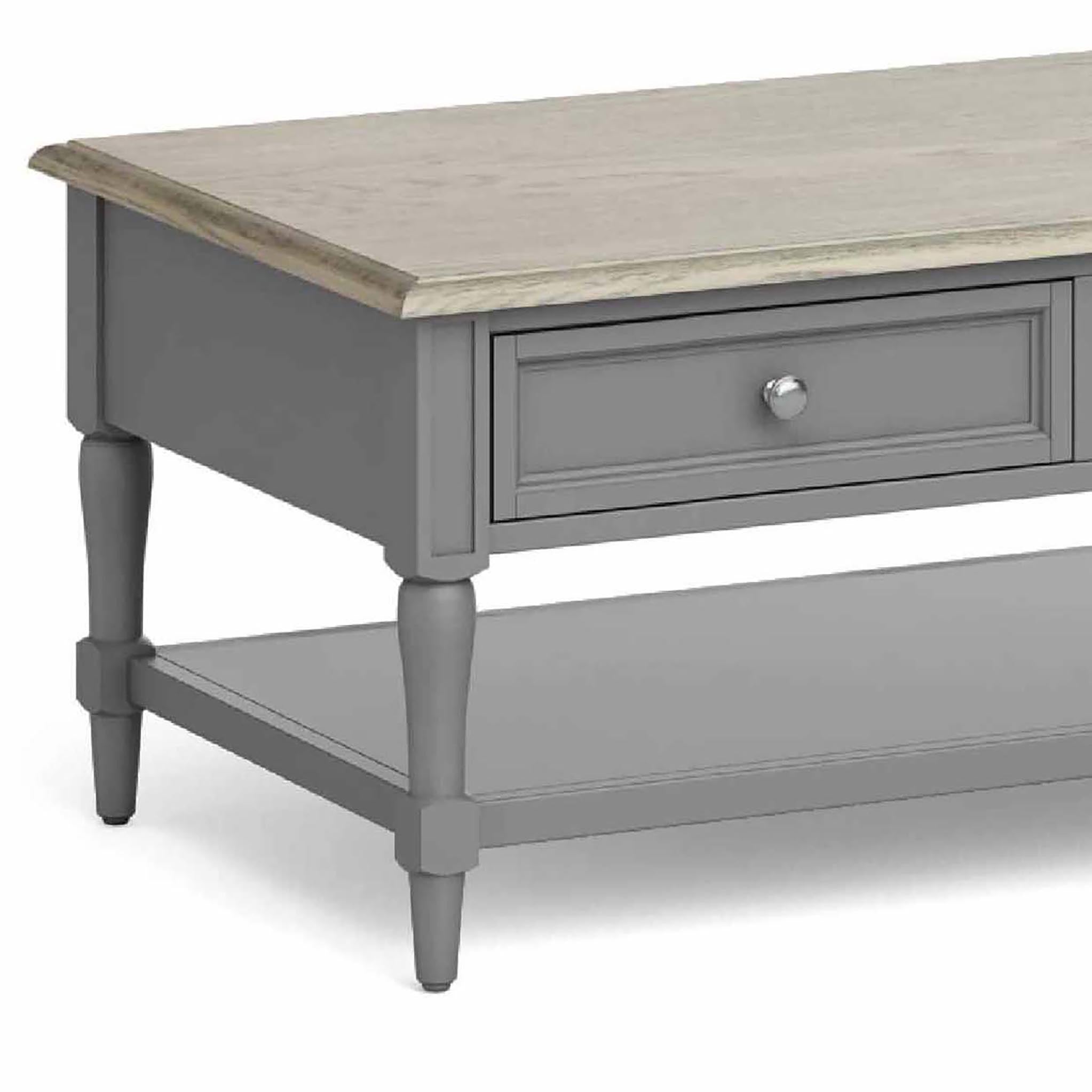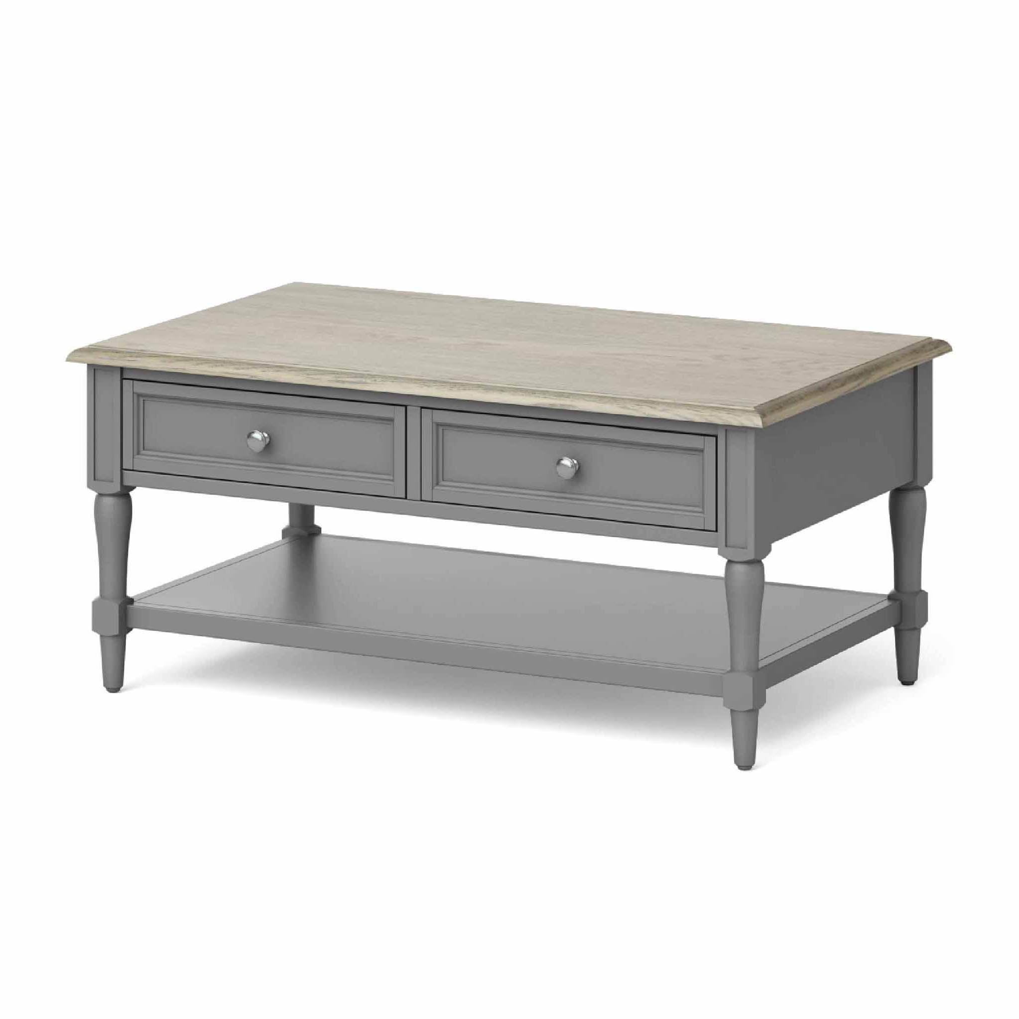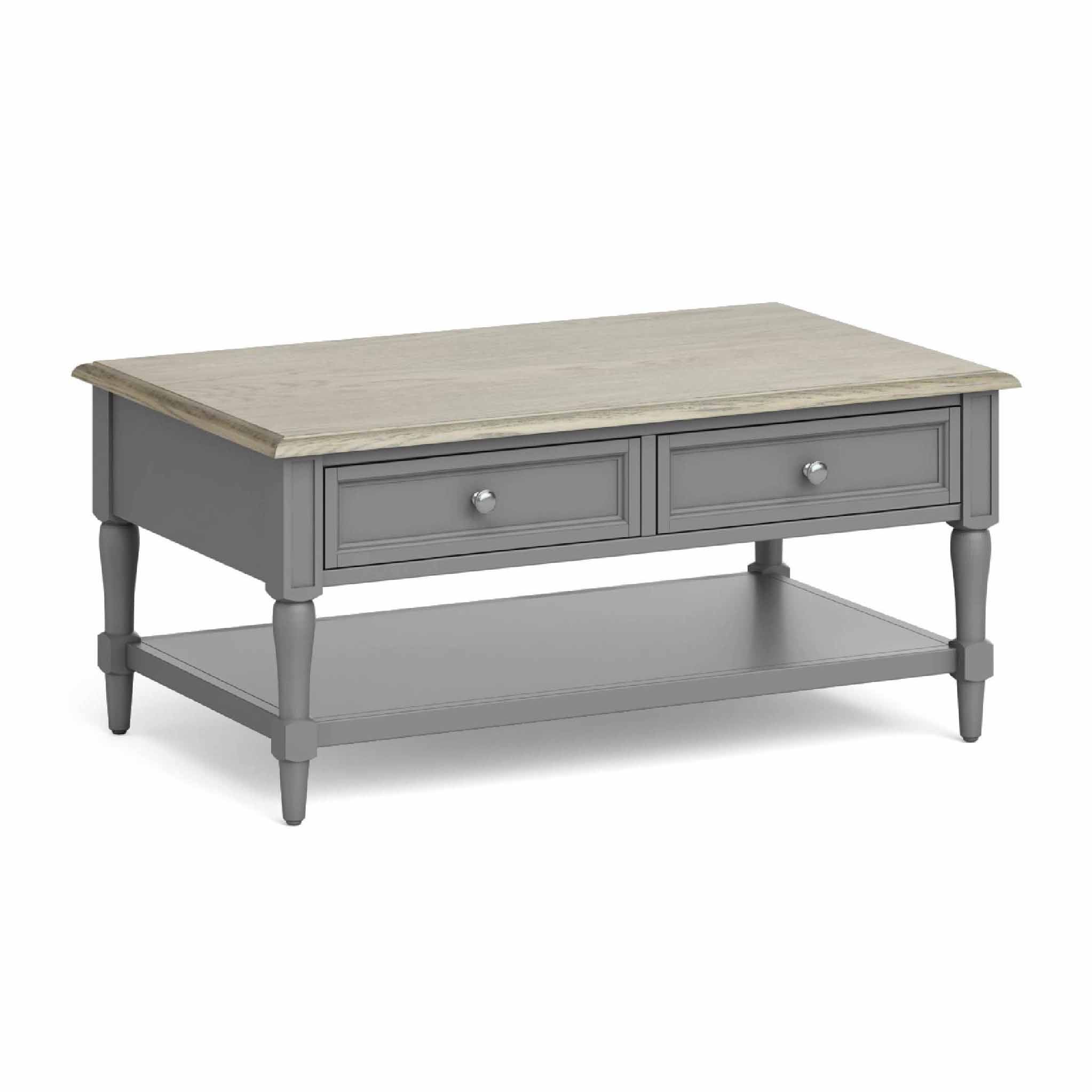 This Mulsanne Grey Oak Coffee Table has a graceful look and feel about it. The 4 turned legs are effortlessly carved to further its charming quality. The colour finish is a deep warm masculine grey painted satin which is easy to clean and is topped off with a whitewashed oak top to compliment the overall look and creating an air of quality and character to any room.