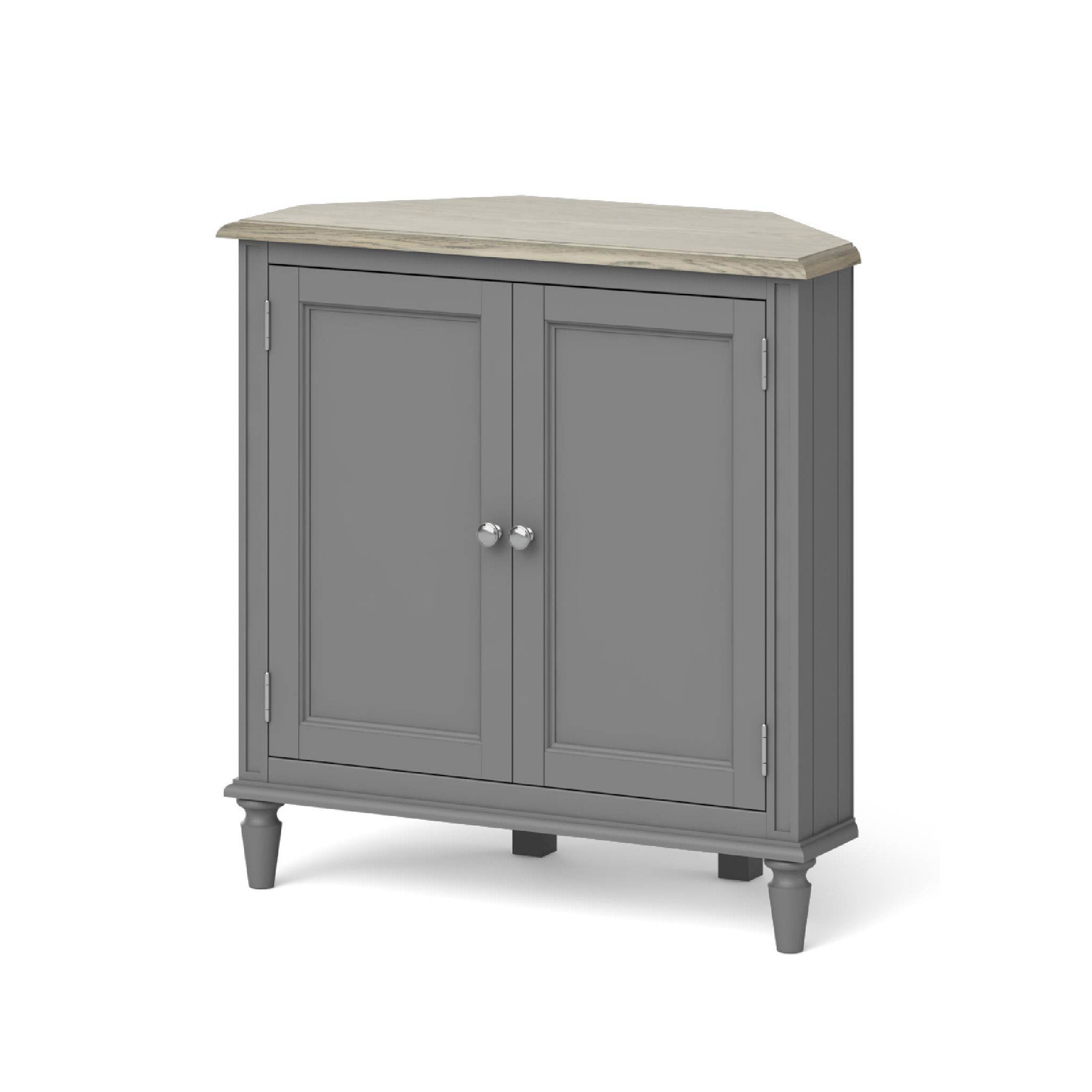 This Mulsanne Grey wooden corner cupboard has a graceful look and feel about it. The short turned legs are effortlessly carved to further its charming quality. The colour finish is a deep warm masculine grey painted satin that is easy to clean and is topped off with a whitewashed oak top to compliment the overall look, creating an air of quality and character to any room.