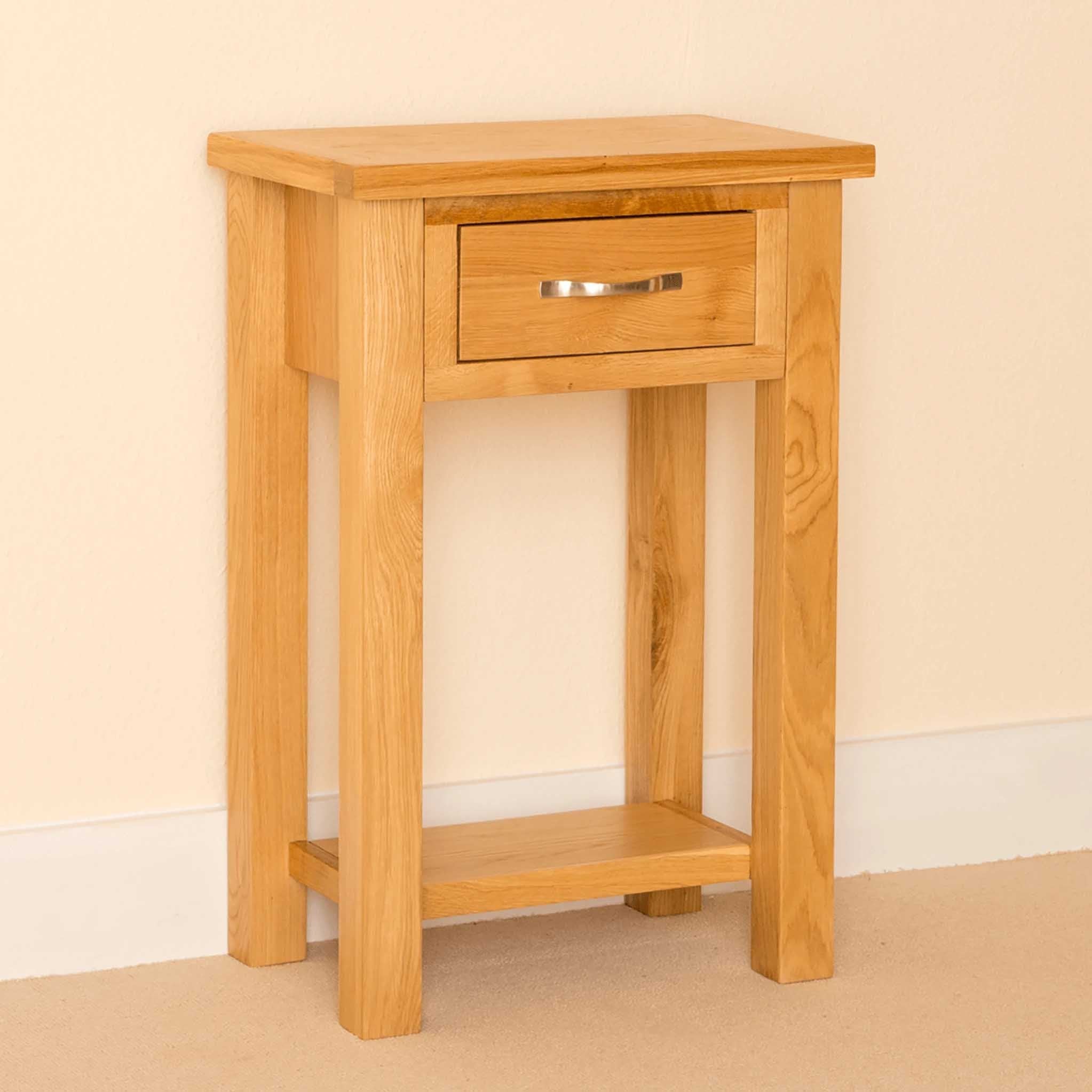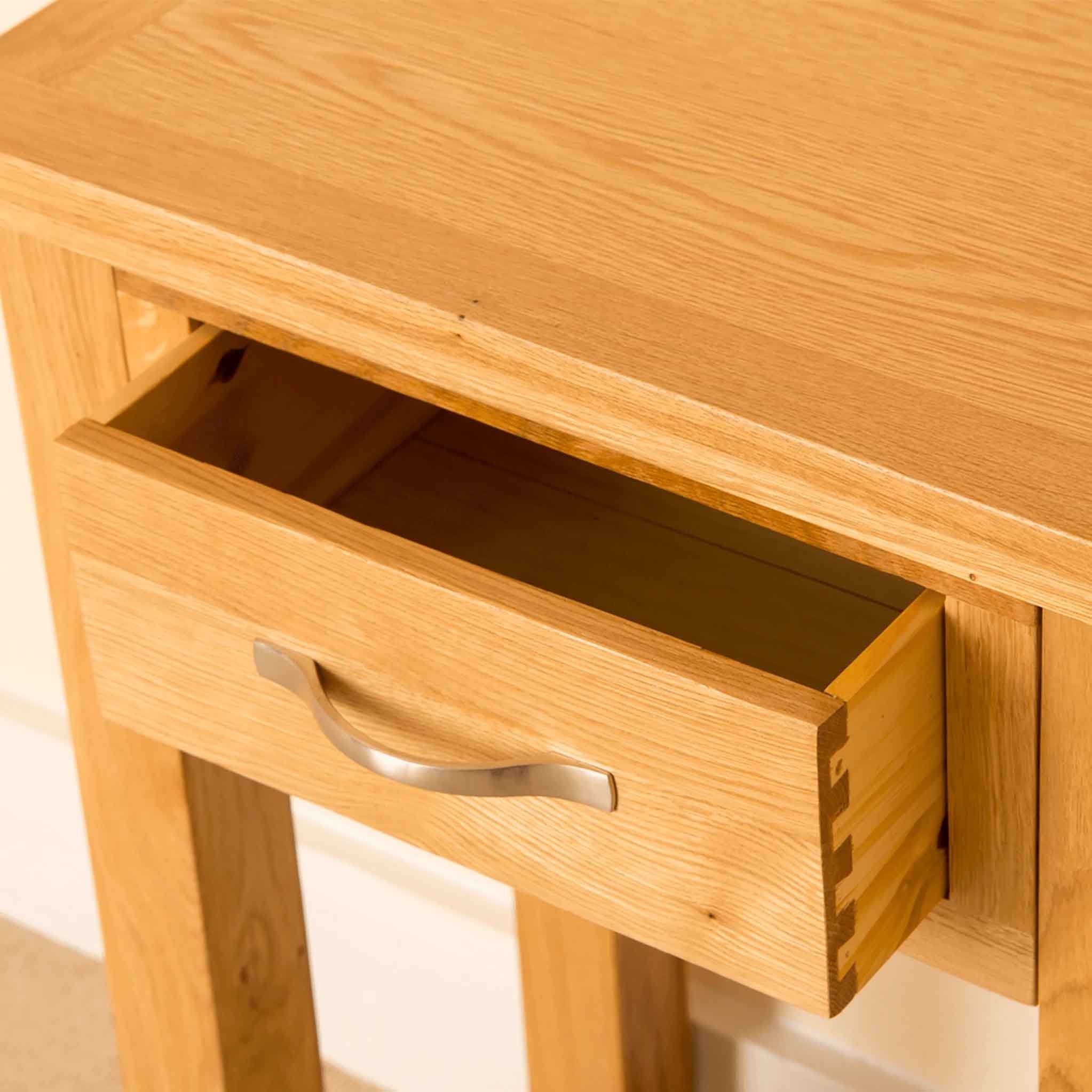 A truly versatile piece, this small table would make a useful, attractive addition to many rooms throughout the house. The drawer provides valuable storage space, always a premium in the modern home. The simple, contemporary design that echoes throughout the Newlyn range means that these pieces blend in with many interior design schemes. The drawer is constructed with dovetail joints and has a solid metal handle, great quality at a great price.