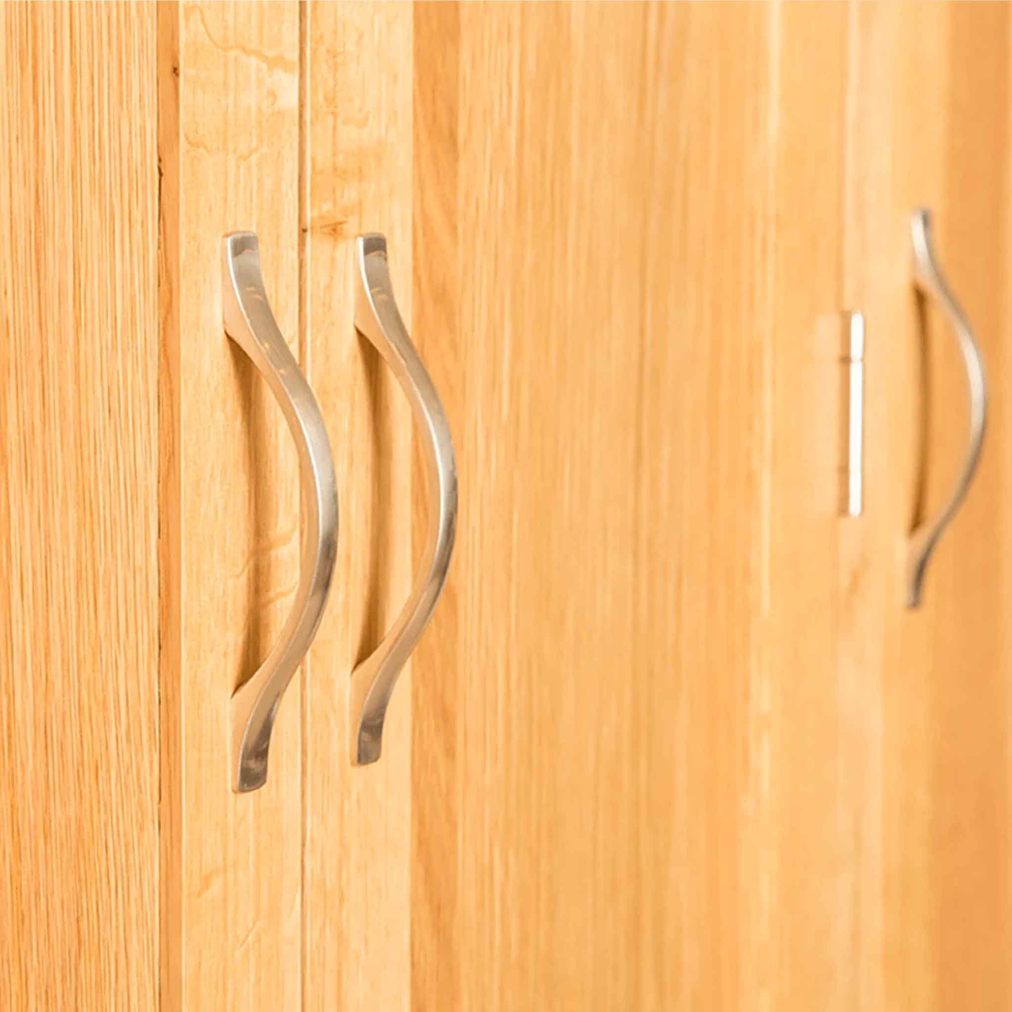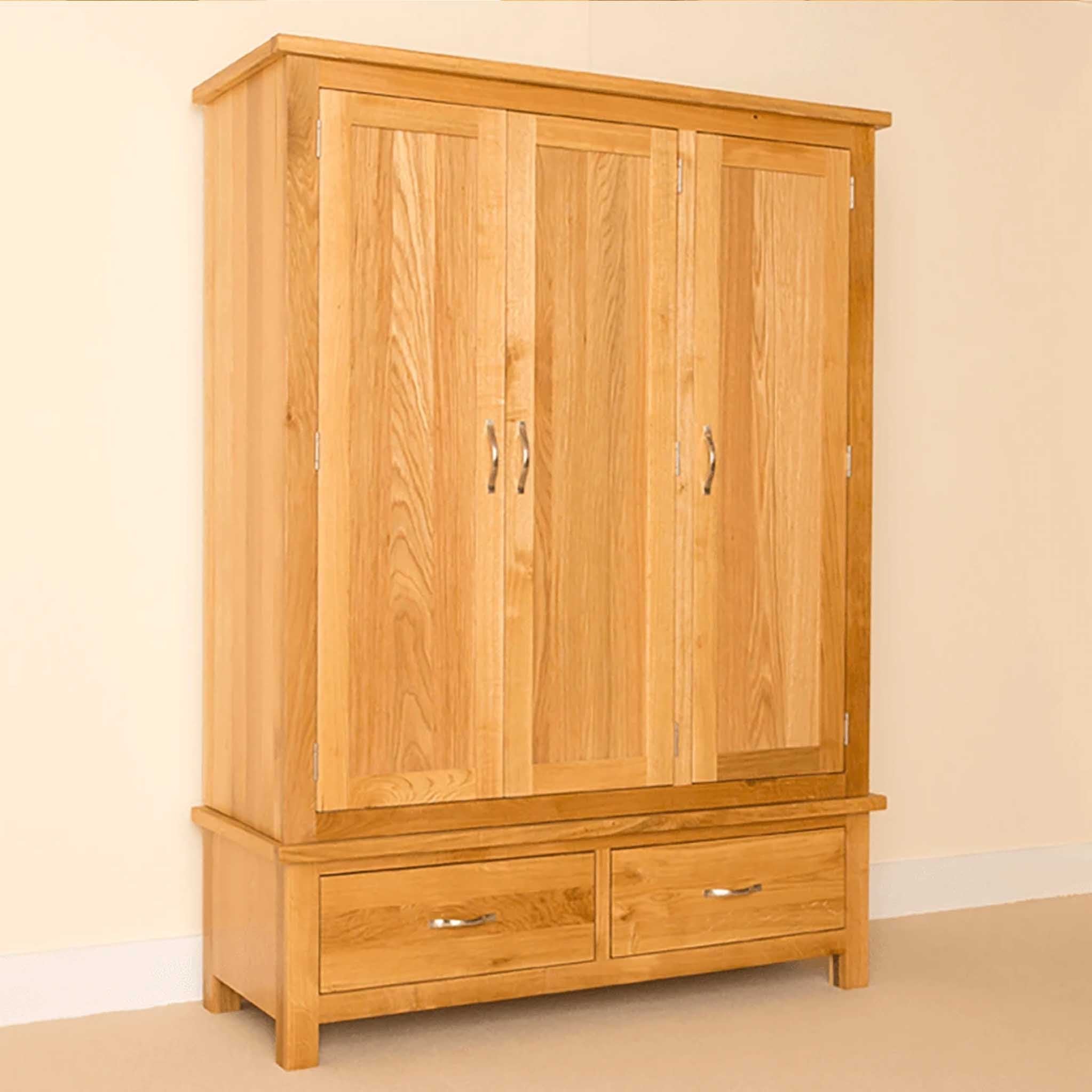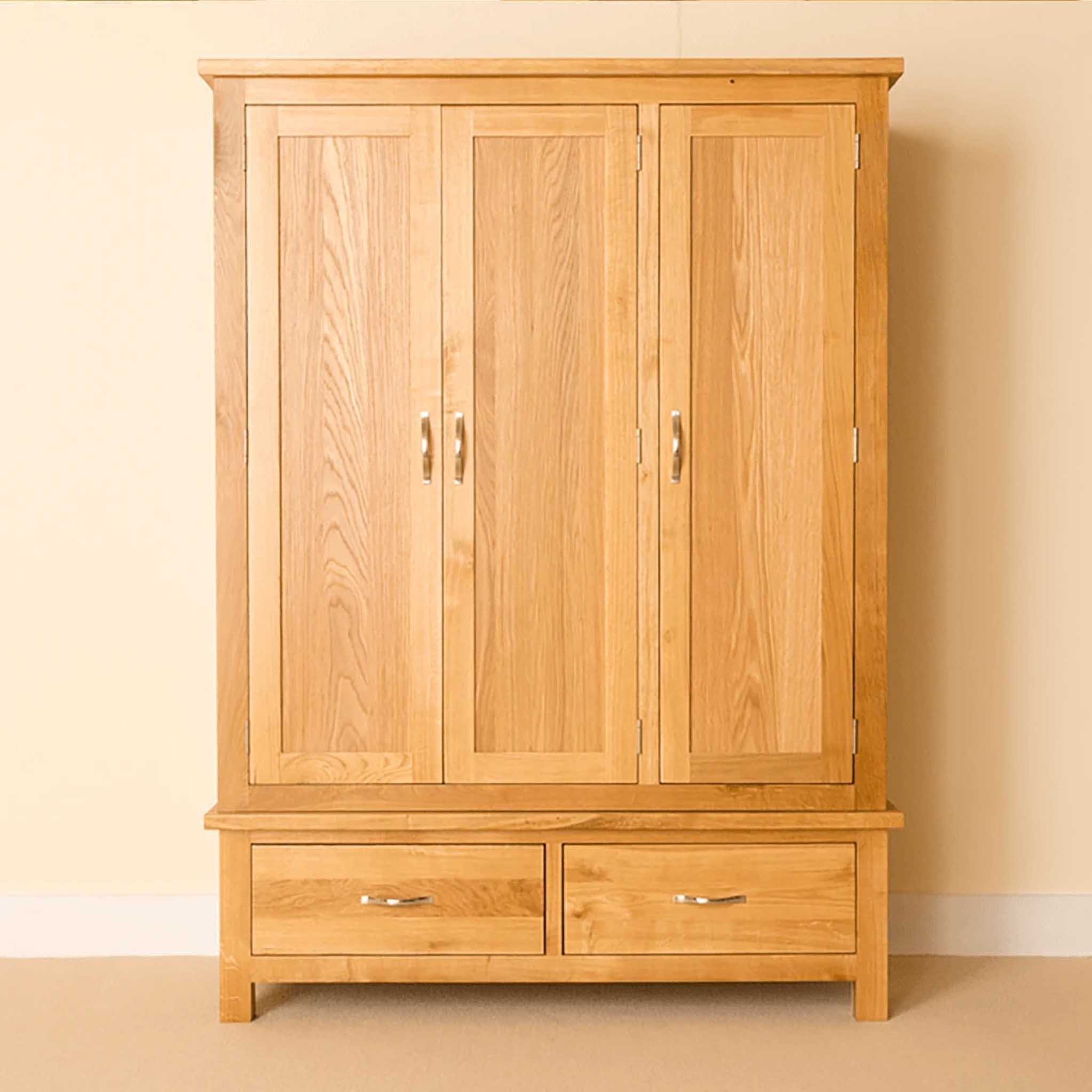 This large triple wardrobe with two large lower drawers becomes the focal point of any bedroom. With a large hanging space and useful additional drawer storage, it's the perfect solution for maximising bedroom storage. The drawers have dovetail joints and also feature solid metal handles. The light oak with clear lacquer finish is easy to maintain and works well with items from many of the other ranges. It's easy to see why the Newlyn has become one of our best-selling ranges.