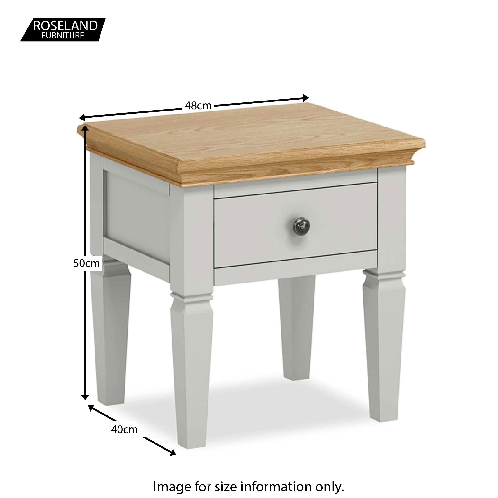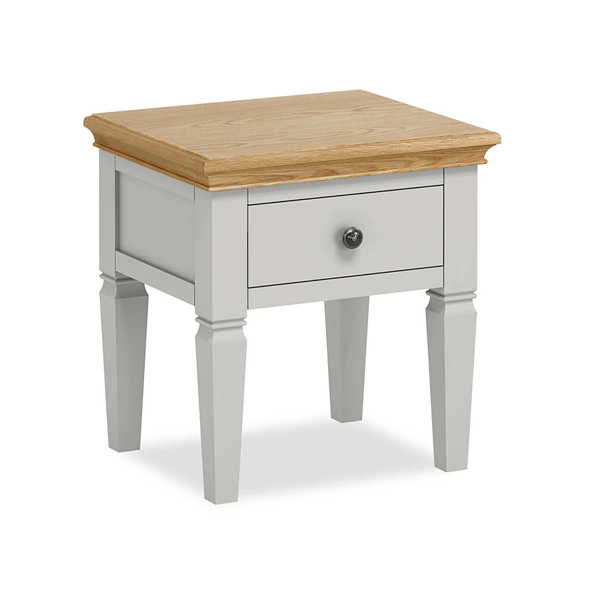 An elegant, simple lamp table that would make a super addition to your home. With a single drawer providing some extra hiding space for those items you don't want out on display; it has a beautiful oak top that perfectly contrasts the soft grey base. Add a lamp and you'll create a fab feature in your home.