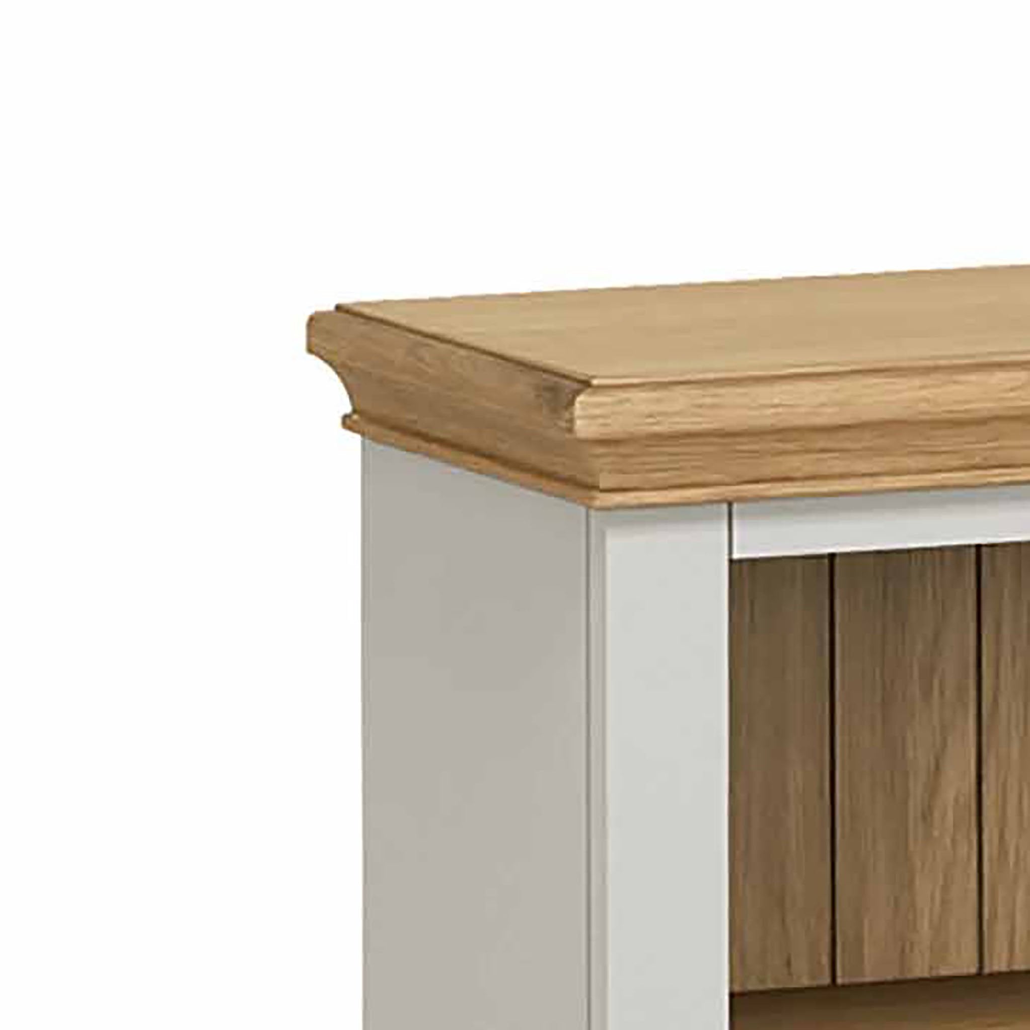 • The stone grey painted solid wood contrasts beautifully with the warm oak of the top, shelves and back.