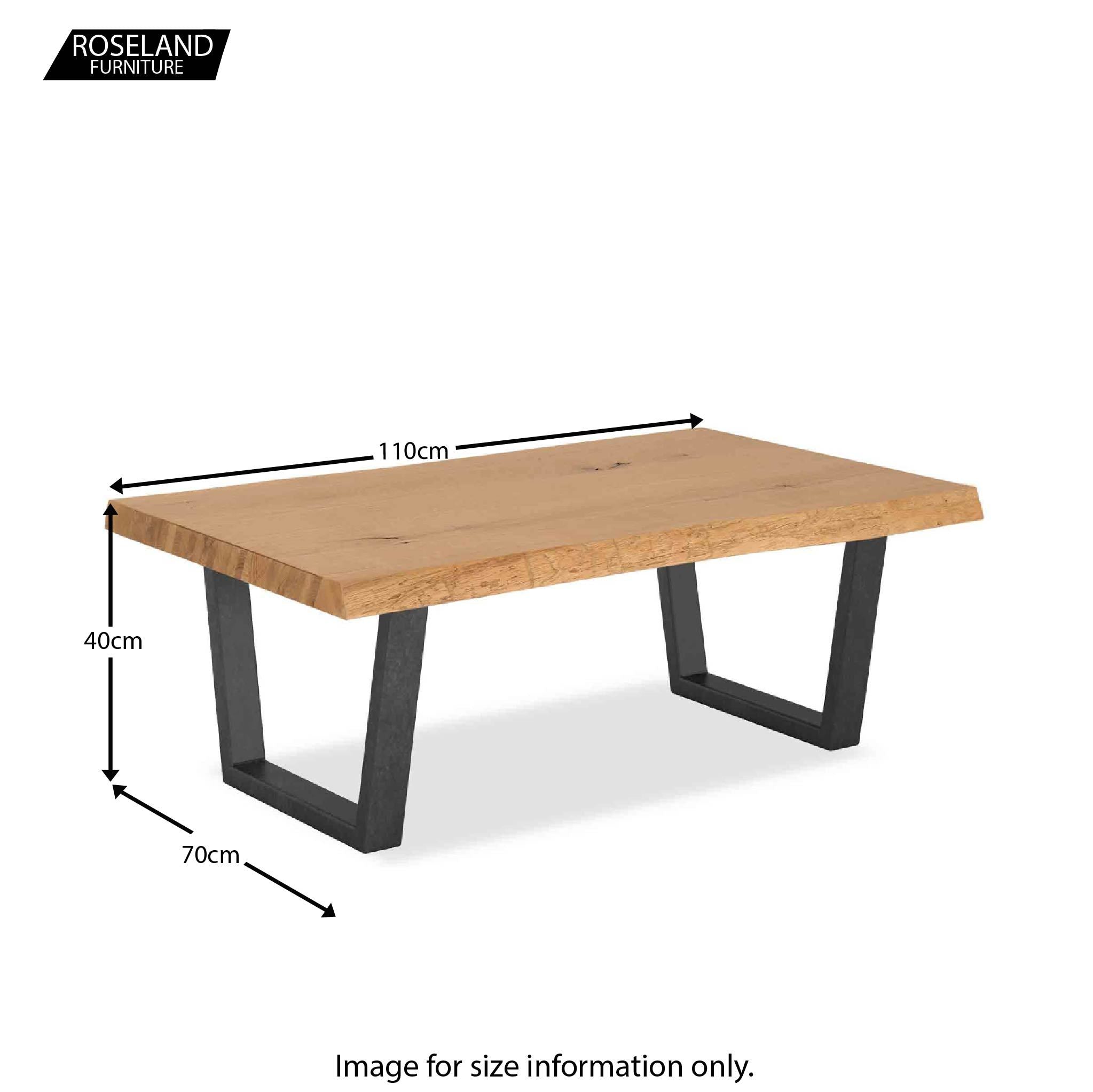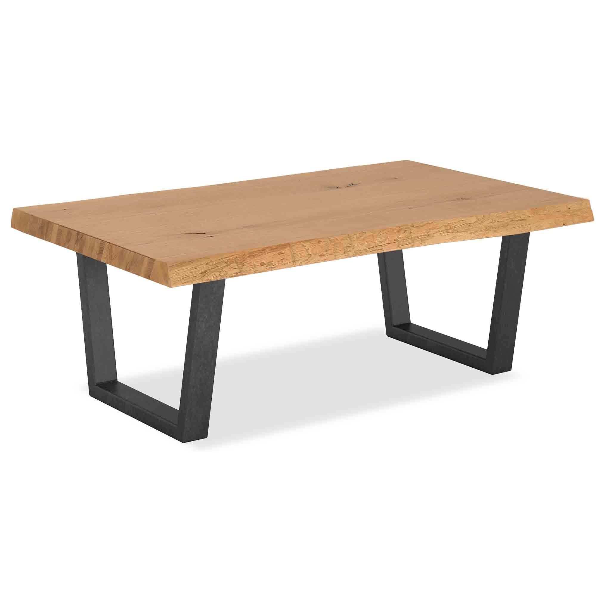 - The live edge oak top provides a natural complement to the industrial metal base.