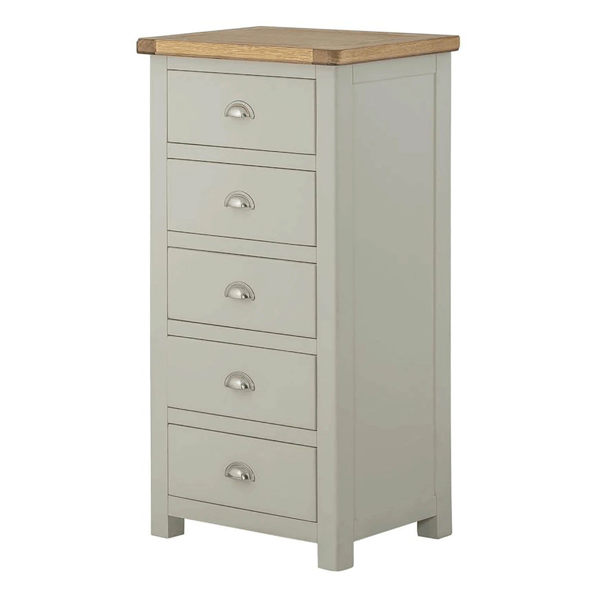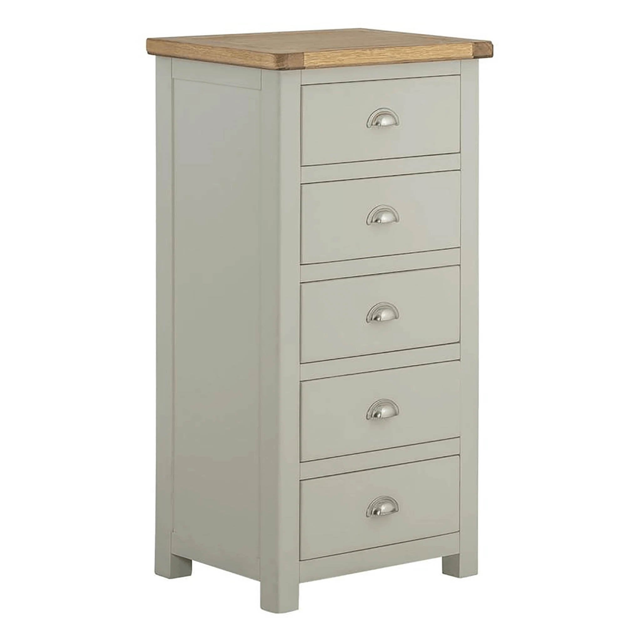 This 5 drawer tallboy/wellington chest is finished in either a grey, white, or cream painted finish. The hard-wearing paint finish means this item is simple to maintain and adds valuable storage space to the home. Perfect for rooms where space is at a premium, offering a great balance between footprint and storage space