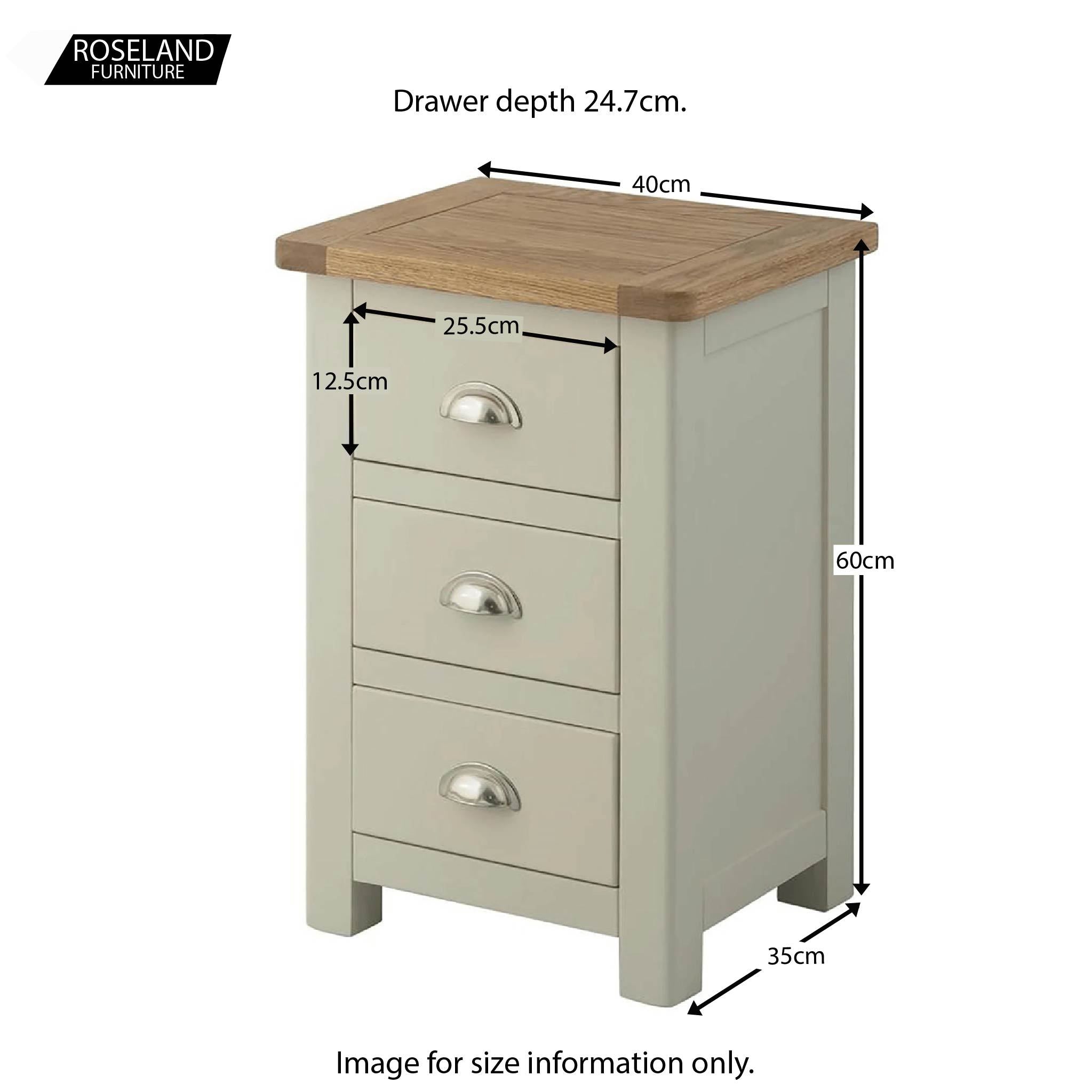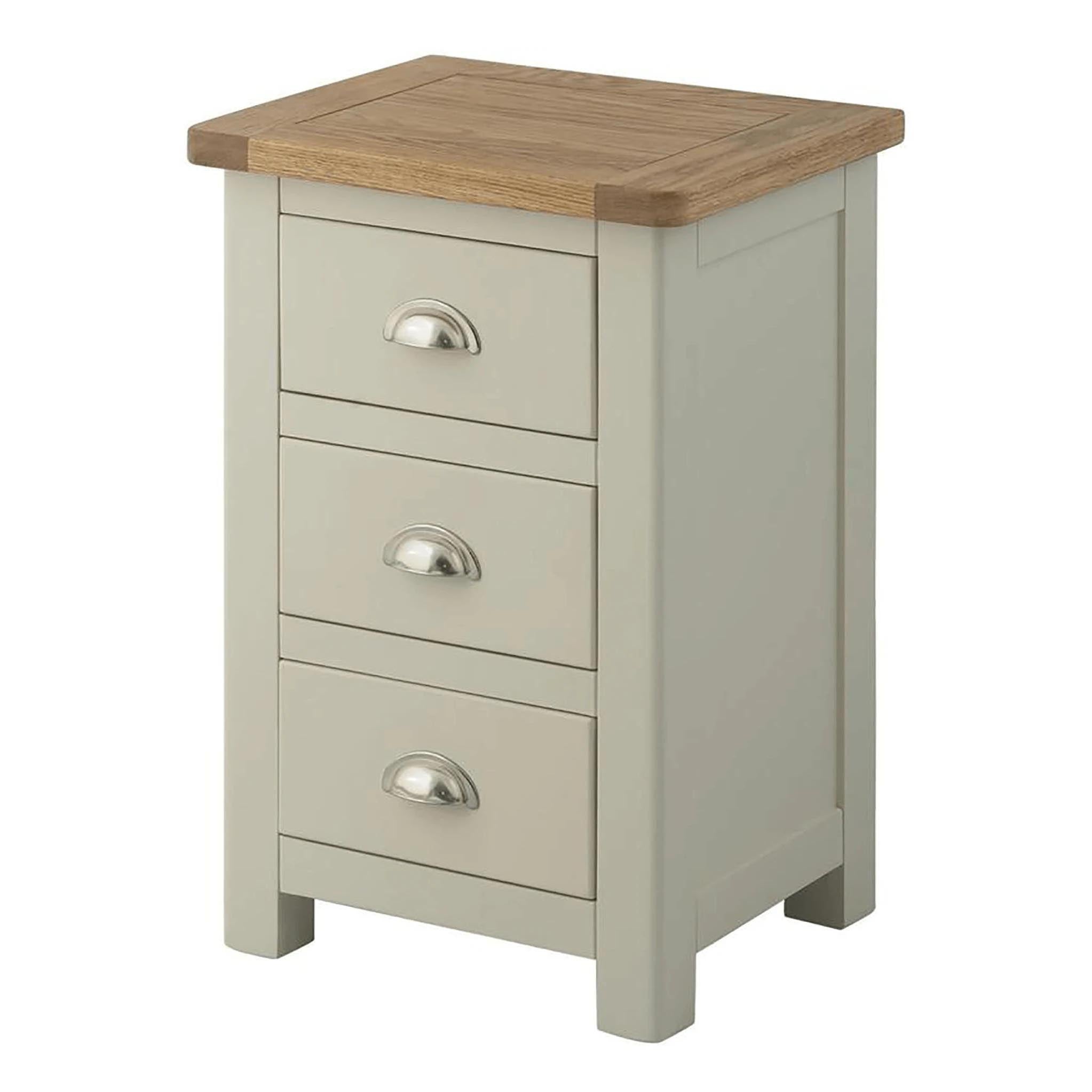 Fantastic value, combined with great quality. This three drawer bedside, with classic metal handles and oak top is a beautiful addition to your home. Check out the other items in the Padstow Painted range to create your perfect bedroom set.