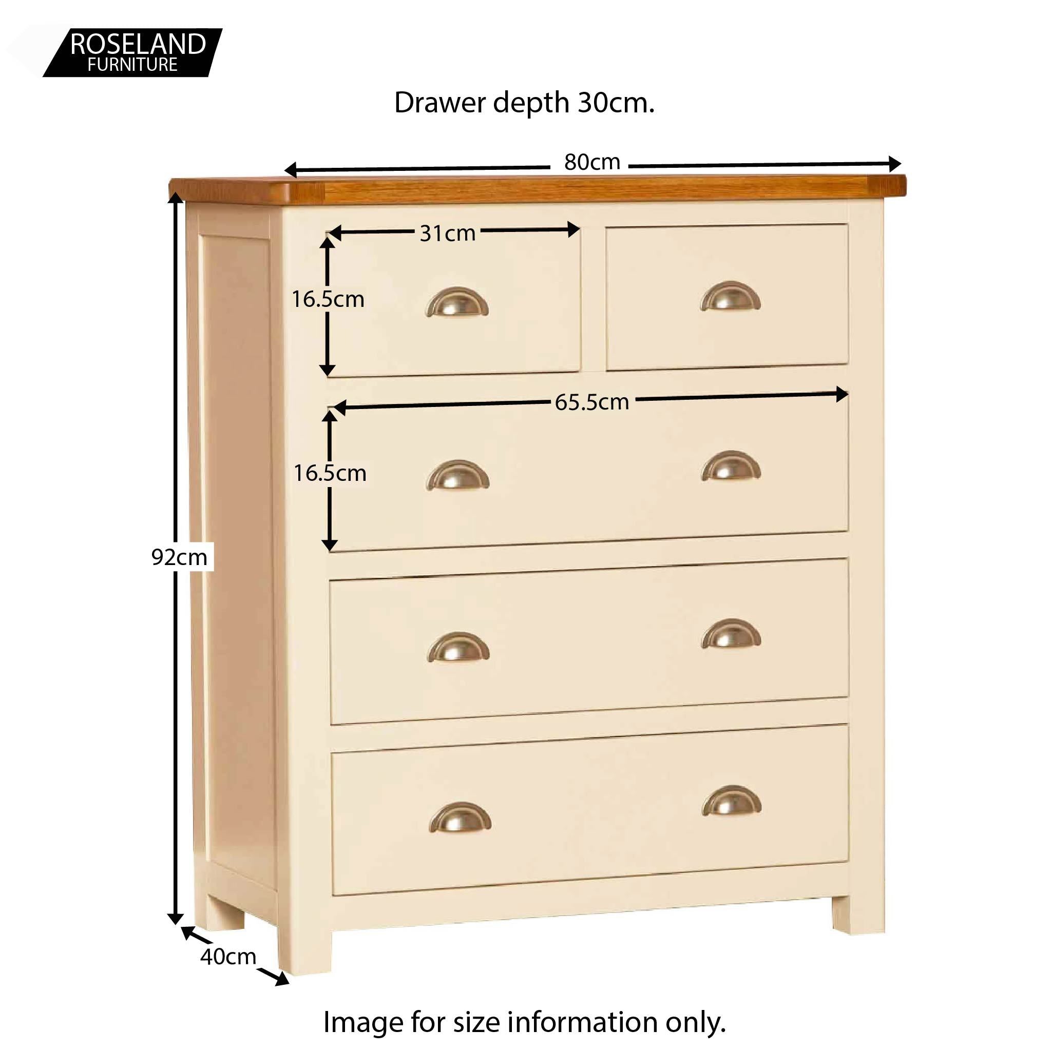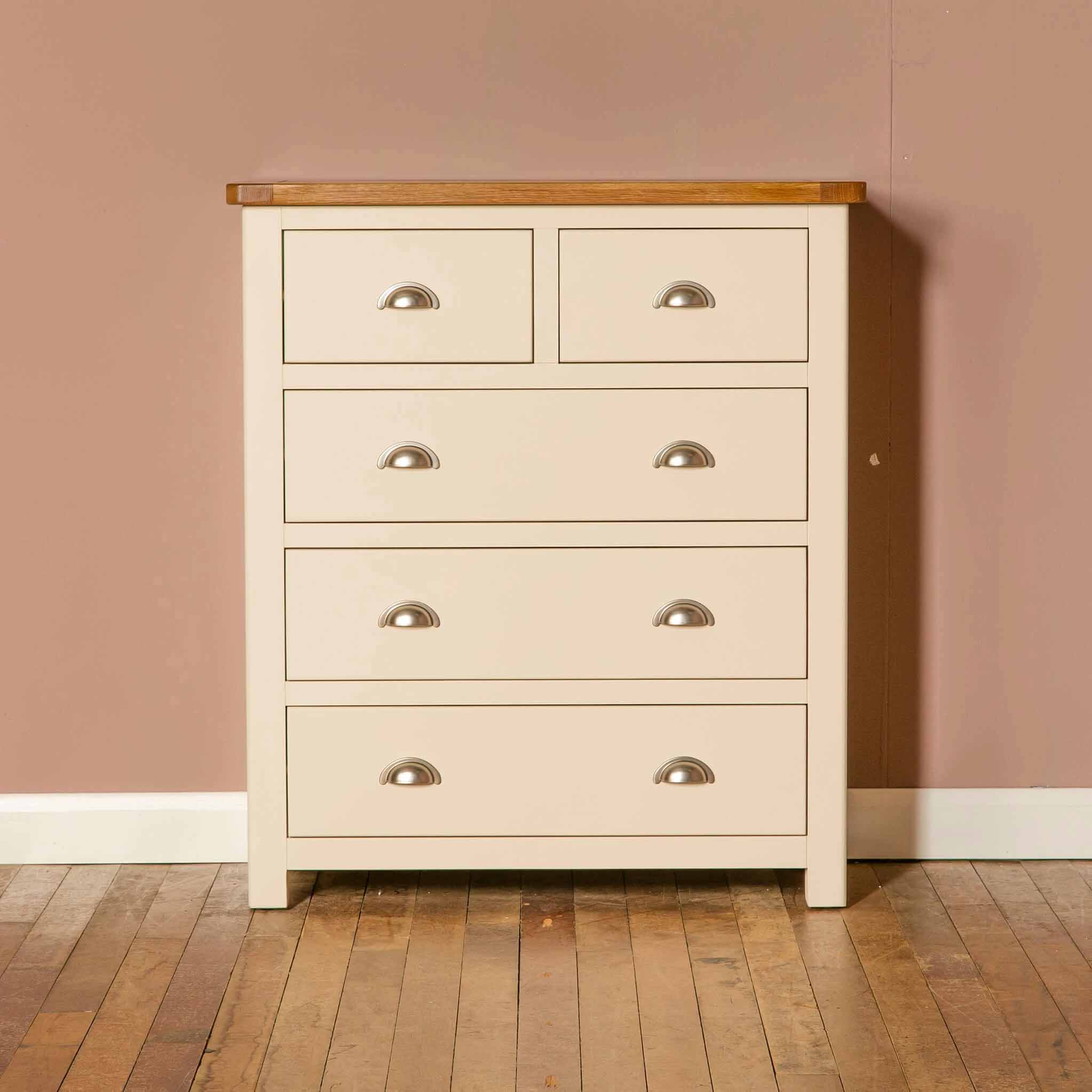 One of three chest of drawers available in the Padstow Cream range of bedroom furniture, this version has three large lower drawers - perfect for jumpers, jeans etc. and two smaller top drawers, making this a versatile addition to any bedroom. Finished in a cream painted finish, it's low maintenance and sure to add quality to any home.