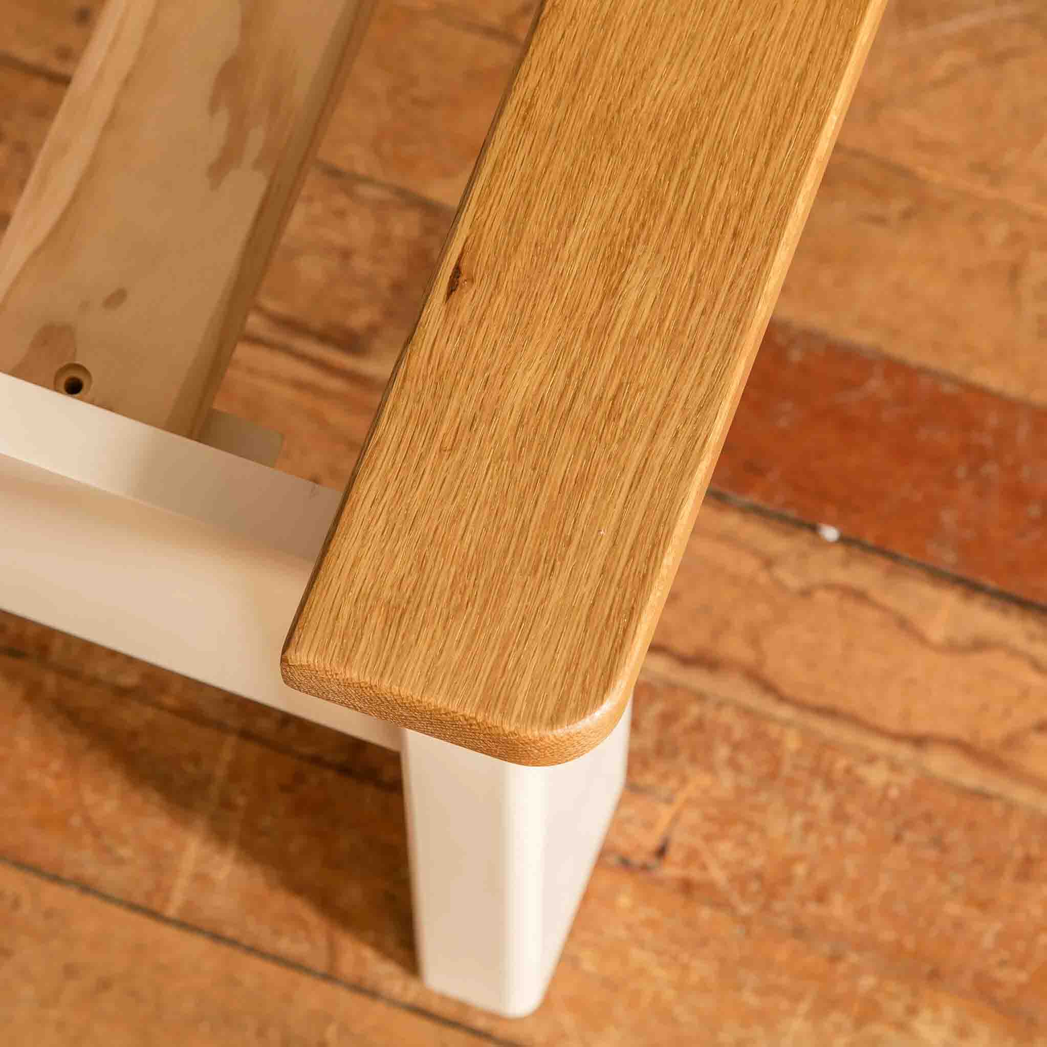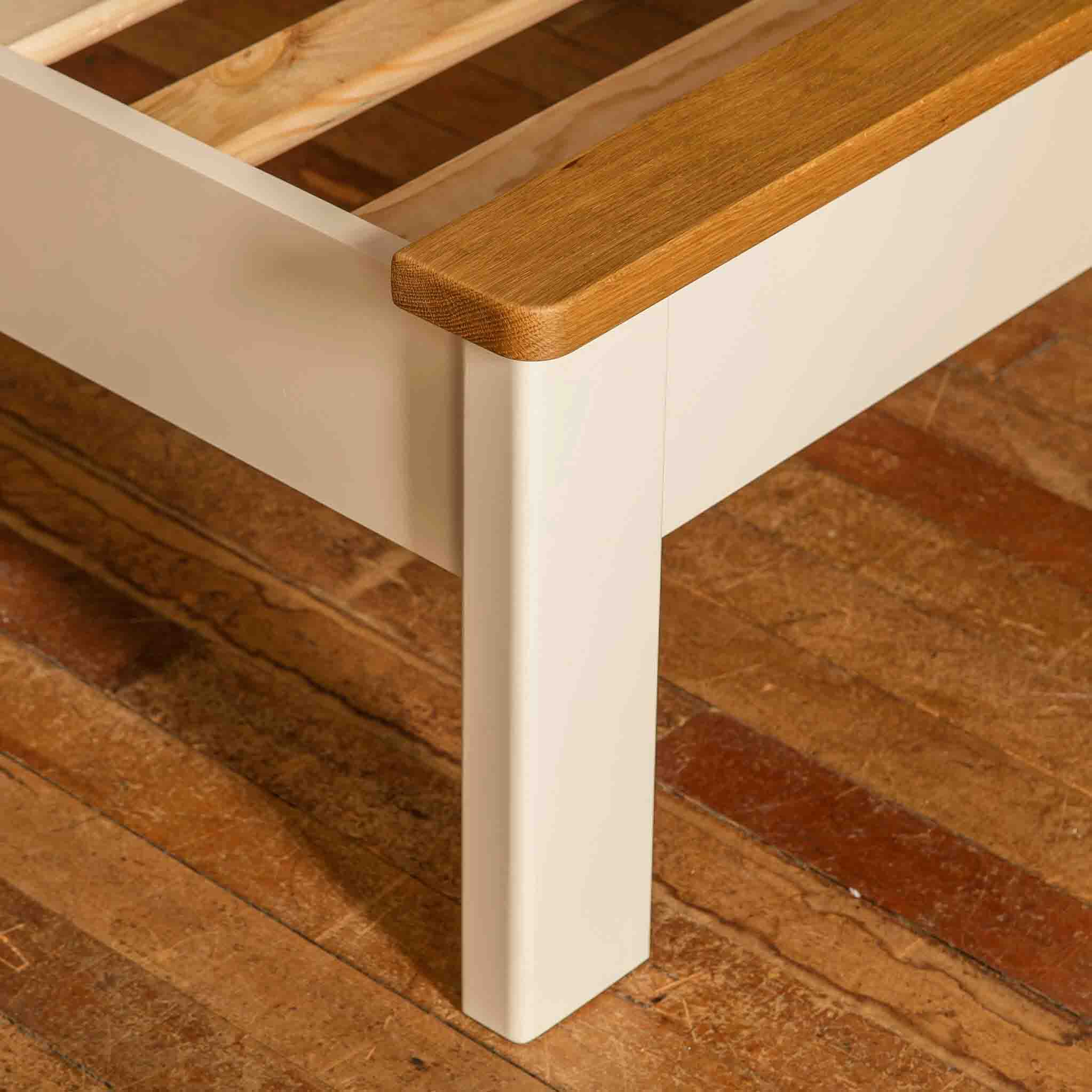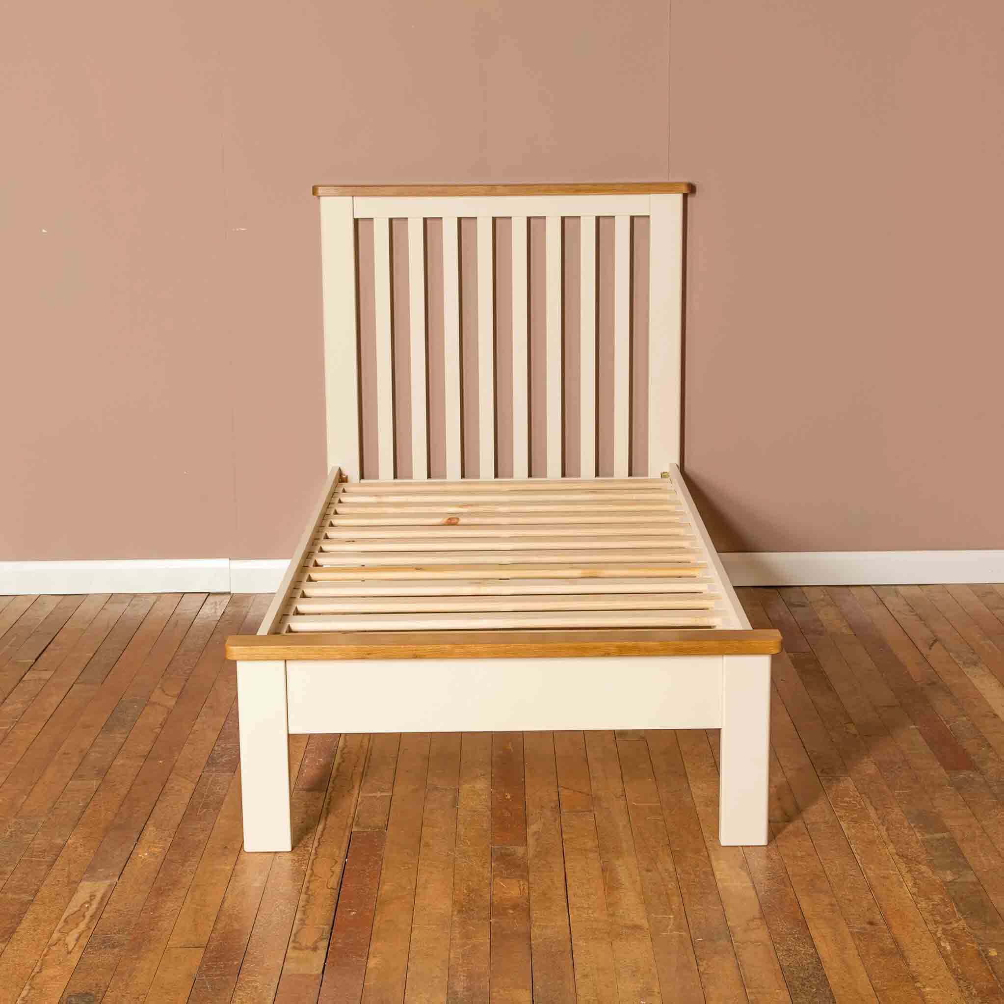 The Padstow Cream 3ft bed frame is beautifully crafted from painted solid pine with a contrasting solid oak top. The Cream finish adds a country charm to your bedroom and its sturdy heavy slatted design is designed to last.