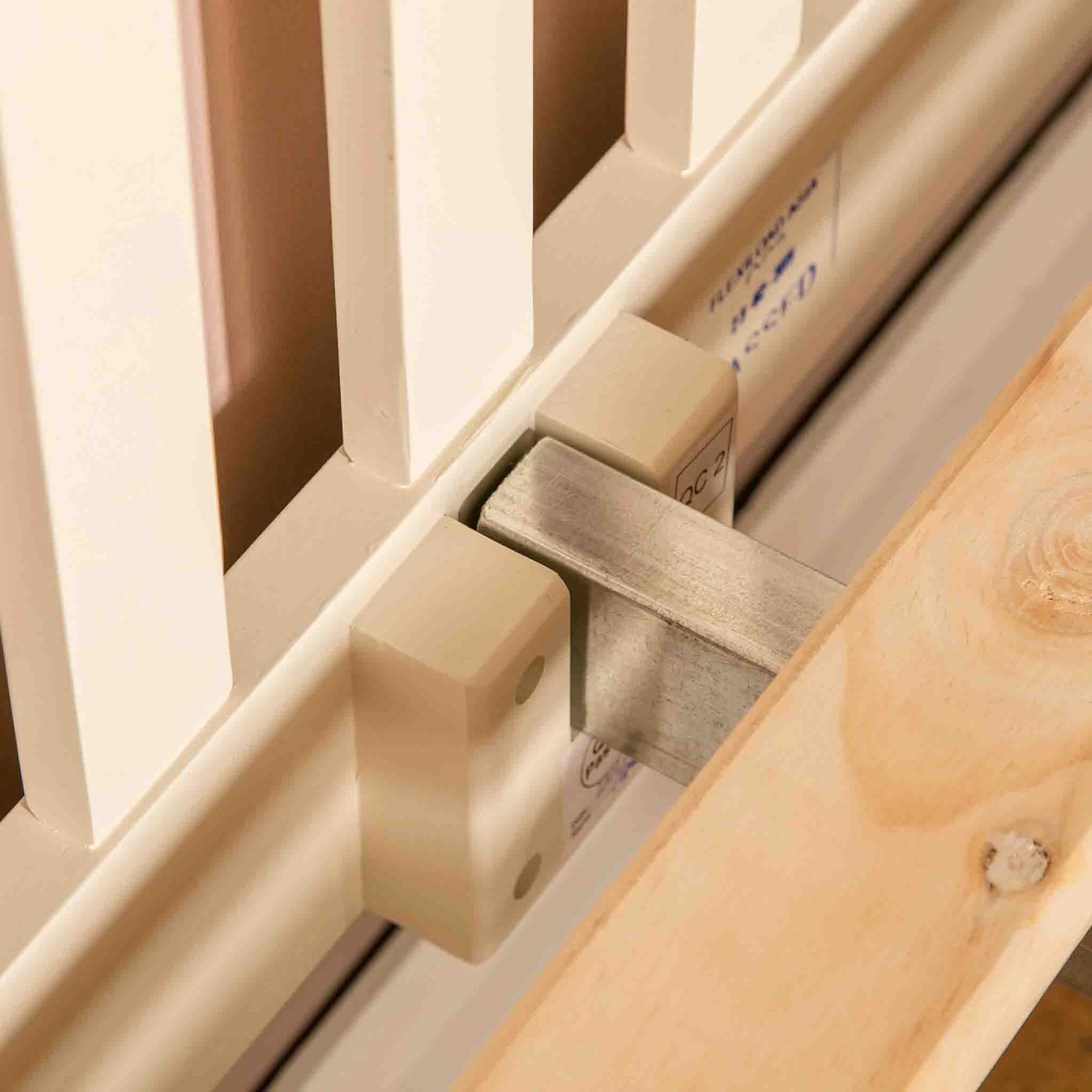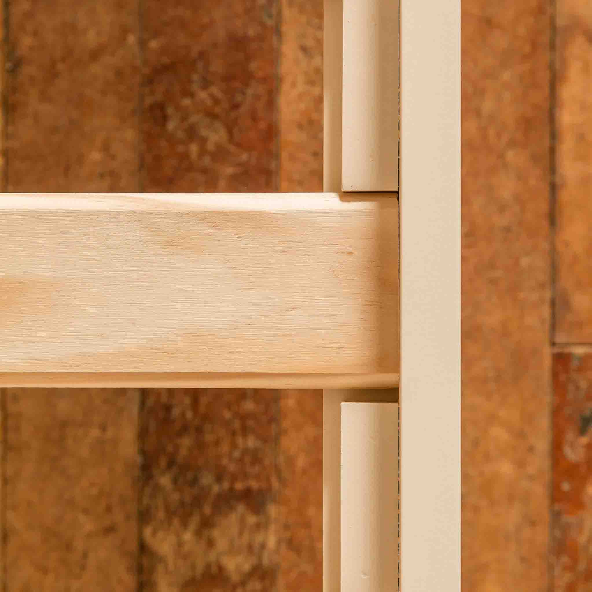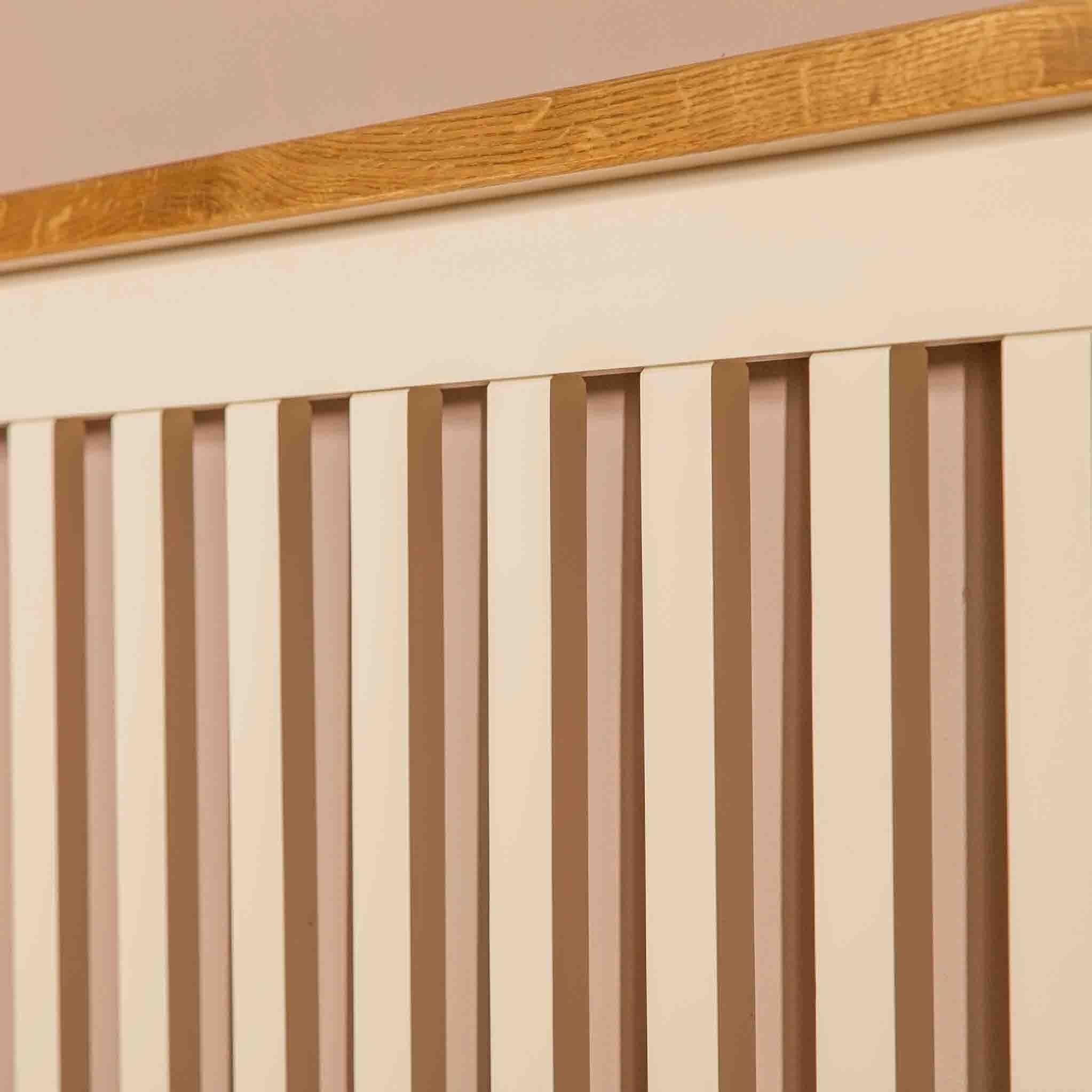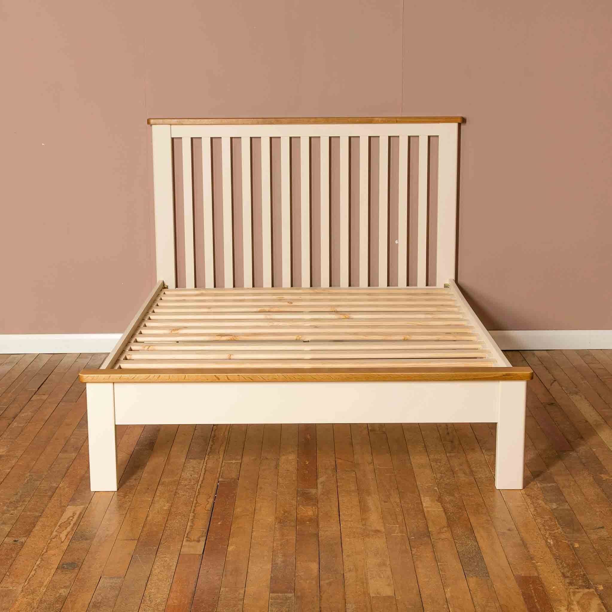 The smaller of the two double sized beds in the Padstow Cream range of bedroom furniture. This wood frame takes a standard 4'6" mattress and combines with the cream finish with contrasting oak tops. Create your ideal bedroom, and combine this bed-frame with a chest and wardrobe from the Padstow range.