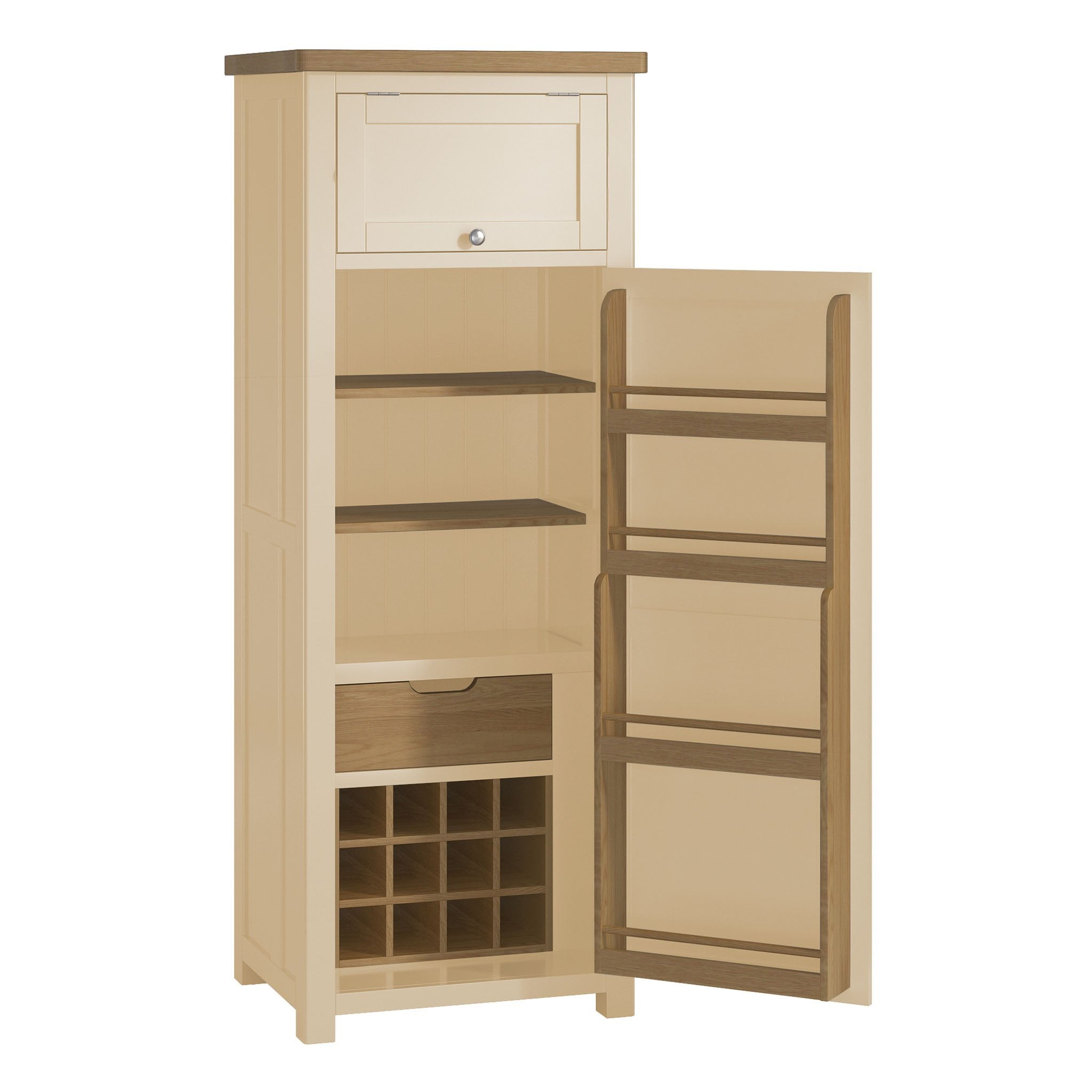 A deceptively spacious larder unit that provides plenty of storage in its slim profile. The large cupboard features 3 fixed shelves, a wine rack, and an internal drawer while multiple shelving sections along the inside of the door are ideal for jars, bottles, condiments, etc. An upper cupboard also offers a great place for pots and pans, or hiding away those less used bits of kitchen equipment that we all have!