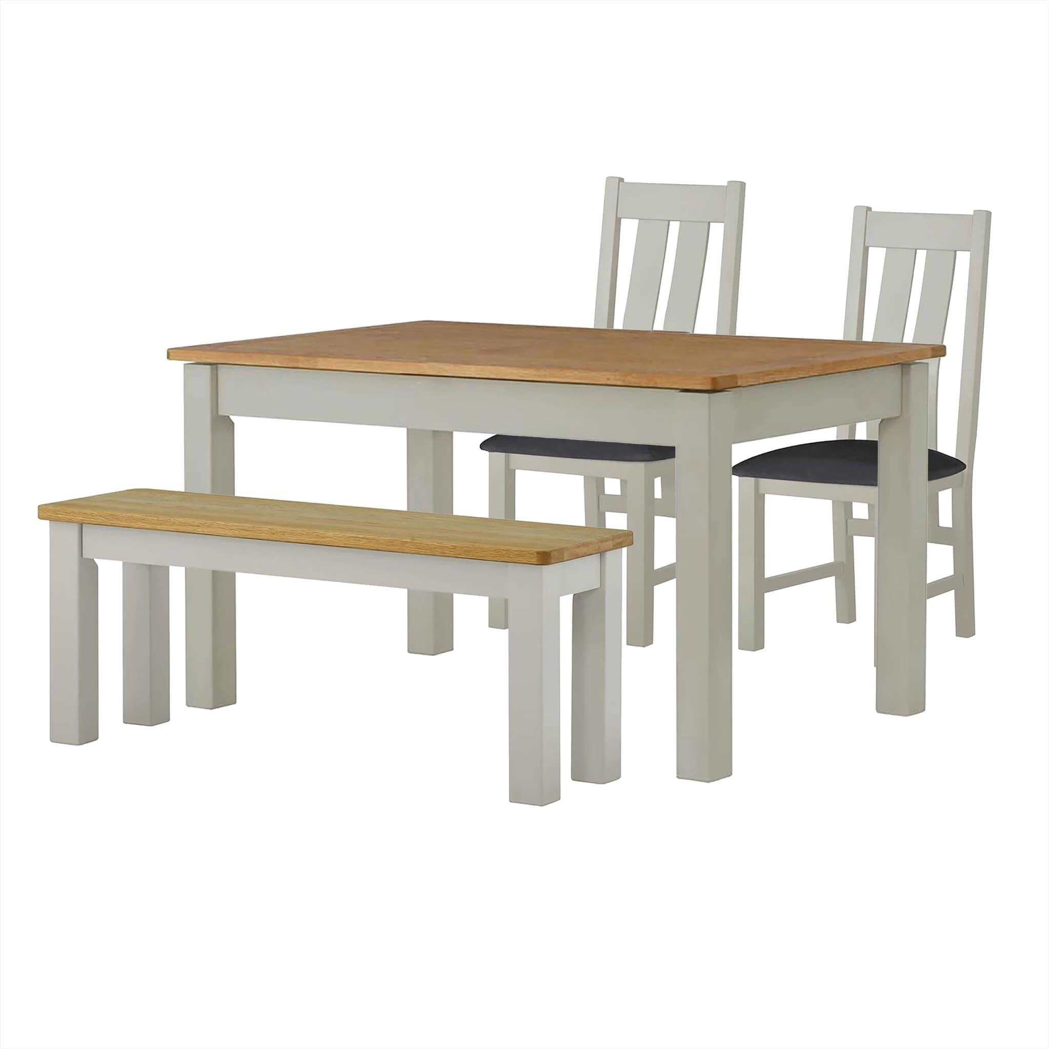 This beautifully crafted Padstow Grey 120cm Dining Set, with simple clean lines finished in attractive stone grey. The beautiful oak top contrasts with the grey legs .