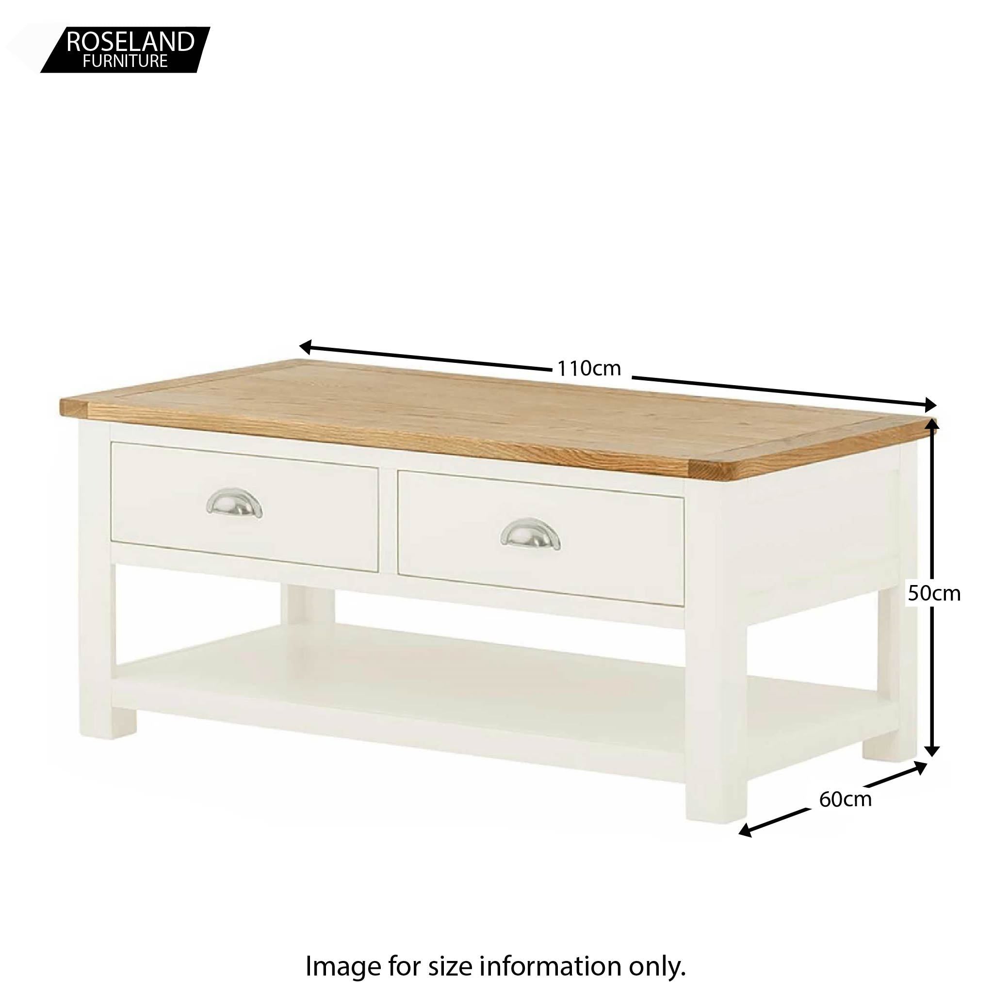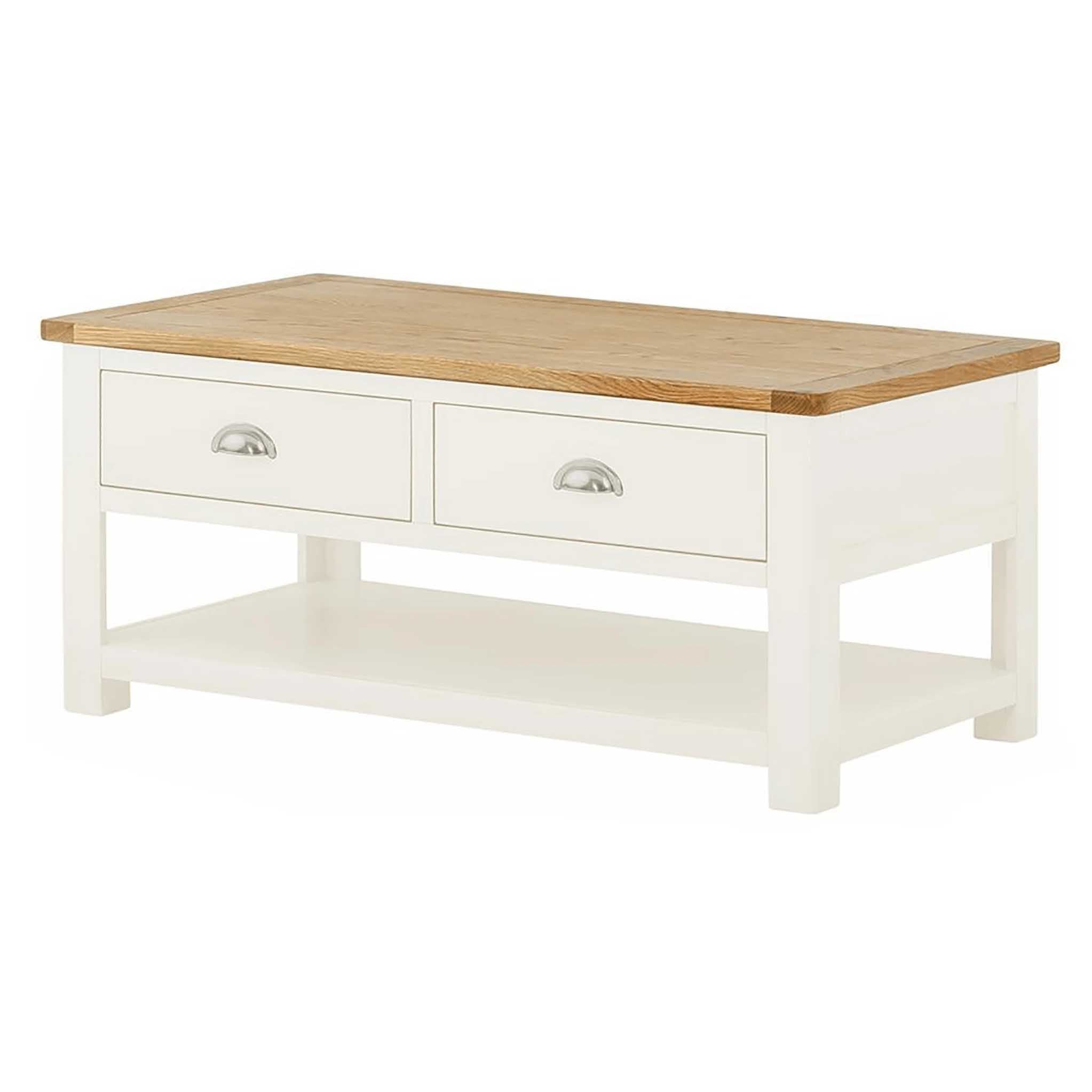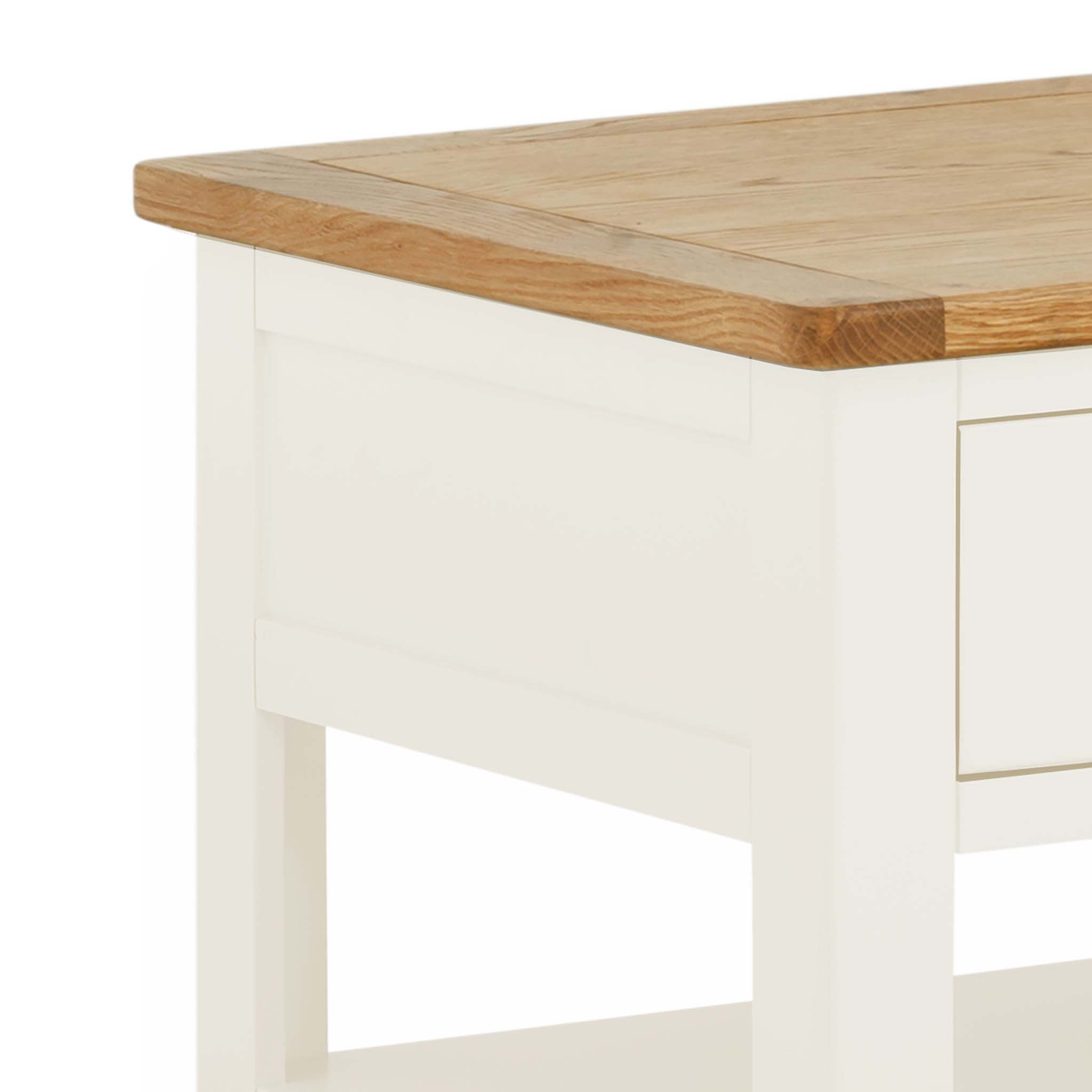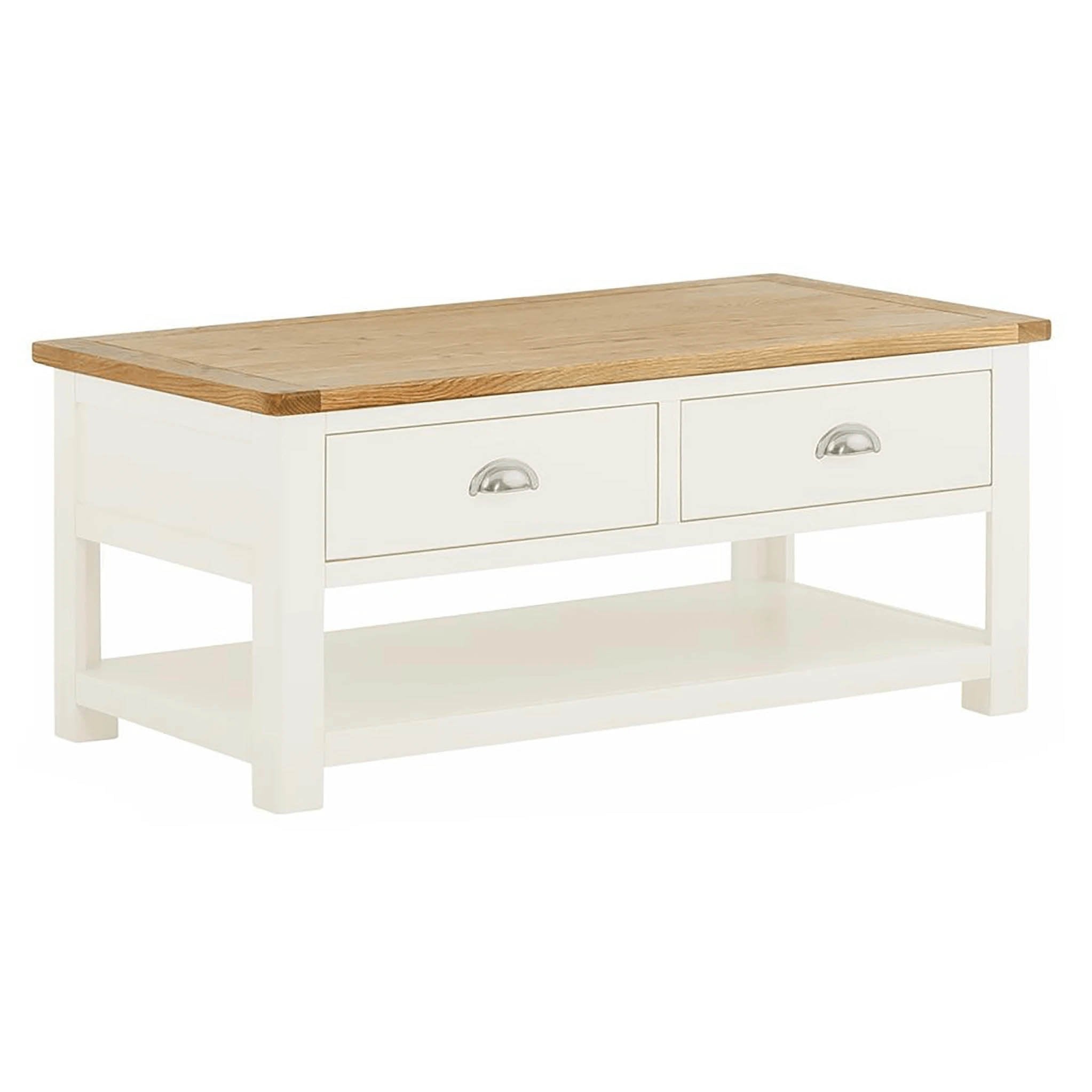 Simple classic lines combined with the attractive cotton white colour and oak top, make this coffee table a must buy. The Padstow two drawer coffee table features two spacious drawers that are accessible from either side of the table, providing plenty of storage space, and a practical lower shelf for keeping magazines, books etc. The oak top is a warm honey colour and adds a touch of warmth to this beautiful item. Add a touch of classic modernity to your home, at a fantastic price.