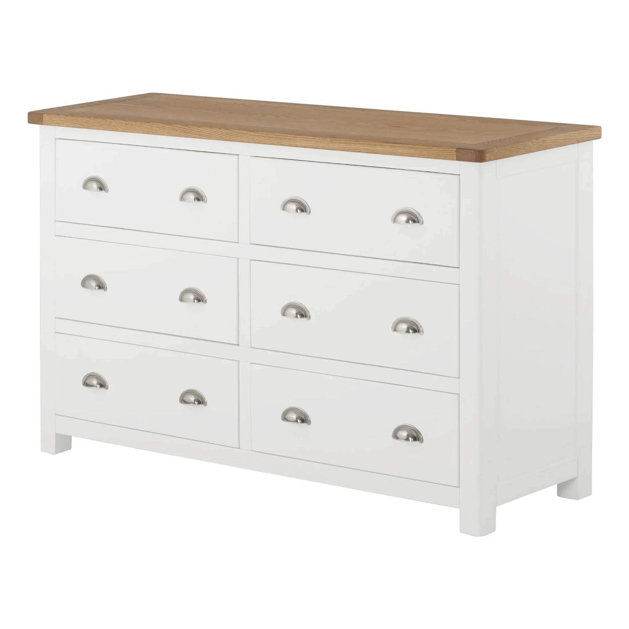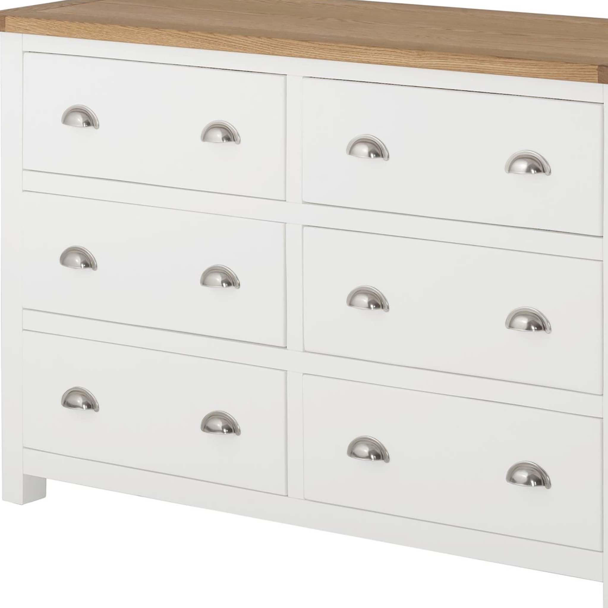 This stunning design provides 6 large drawers of great storage space. One of three chest options available in the Padstow White range, the low height of this version means you have a great top space for fragrance, make-up, jewelry, TV, etc. This item would look great anywhere throughout the home where you need attractive, well-built drawers.