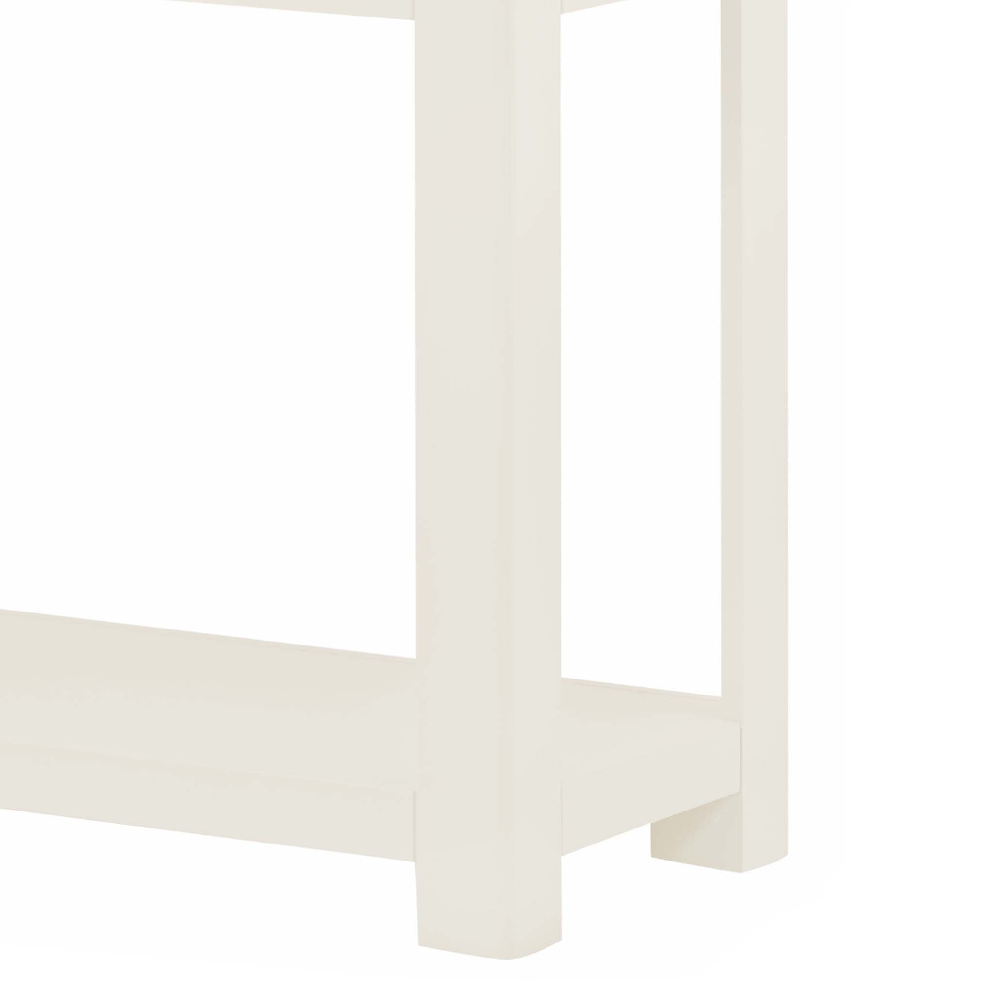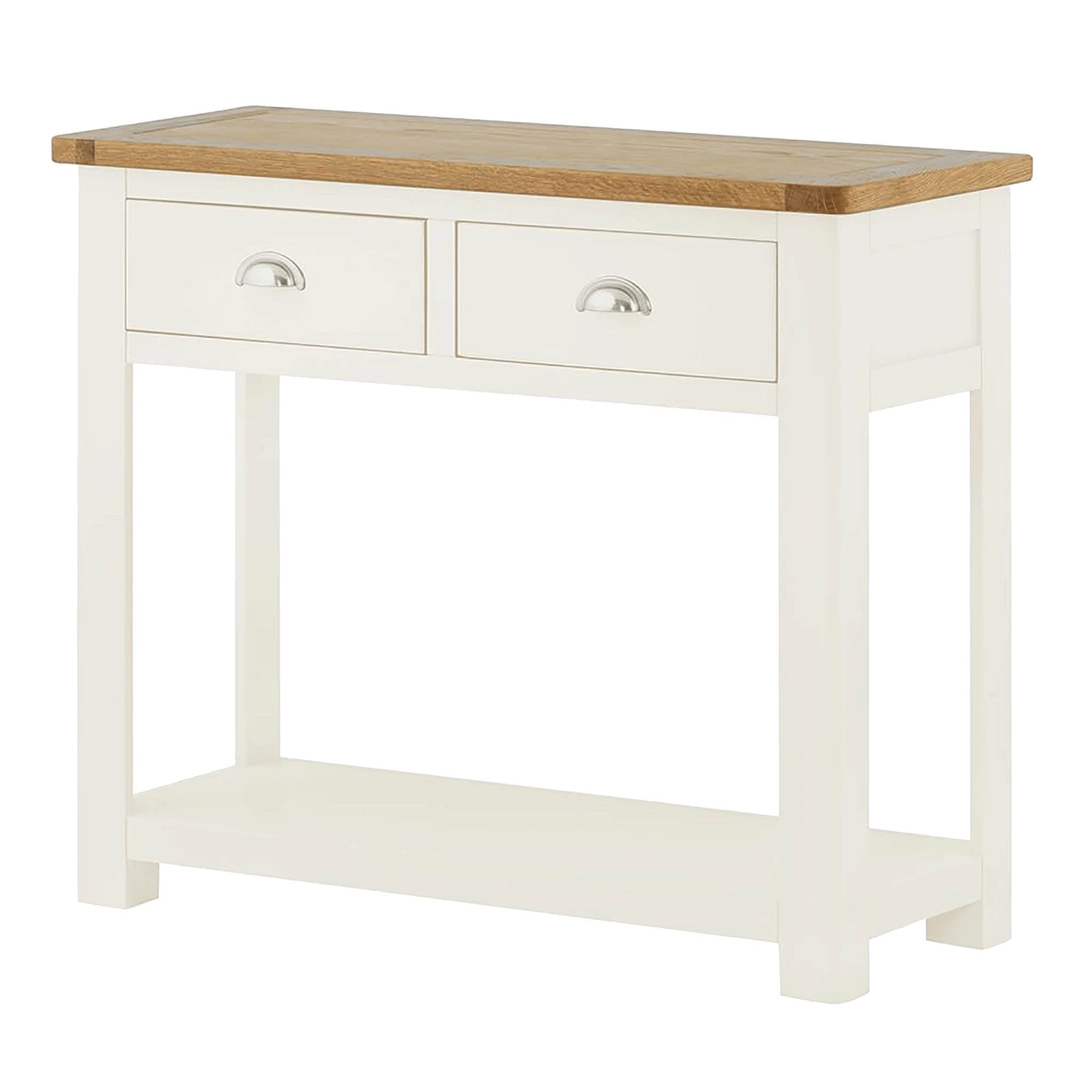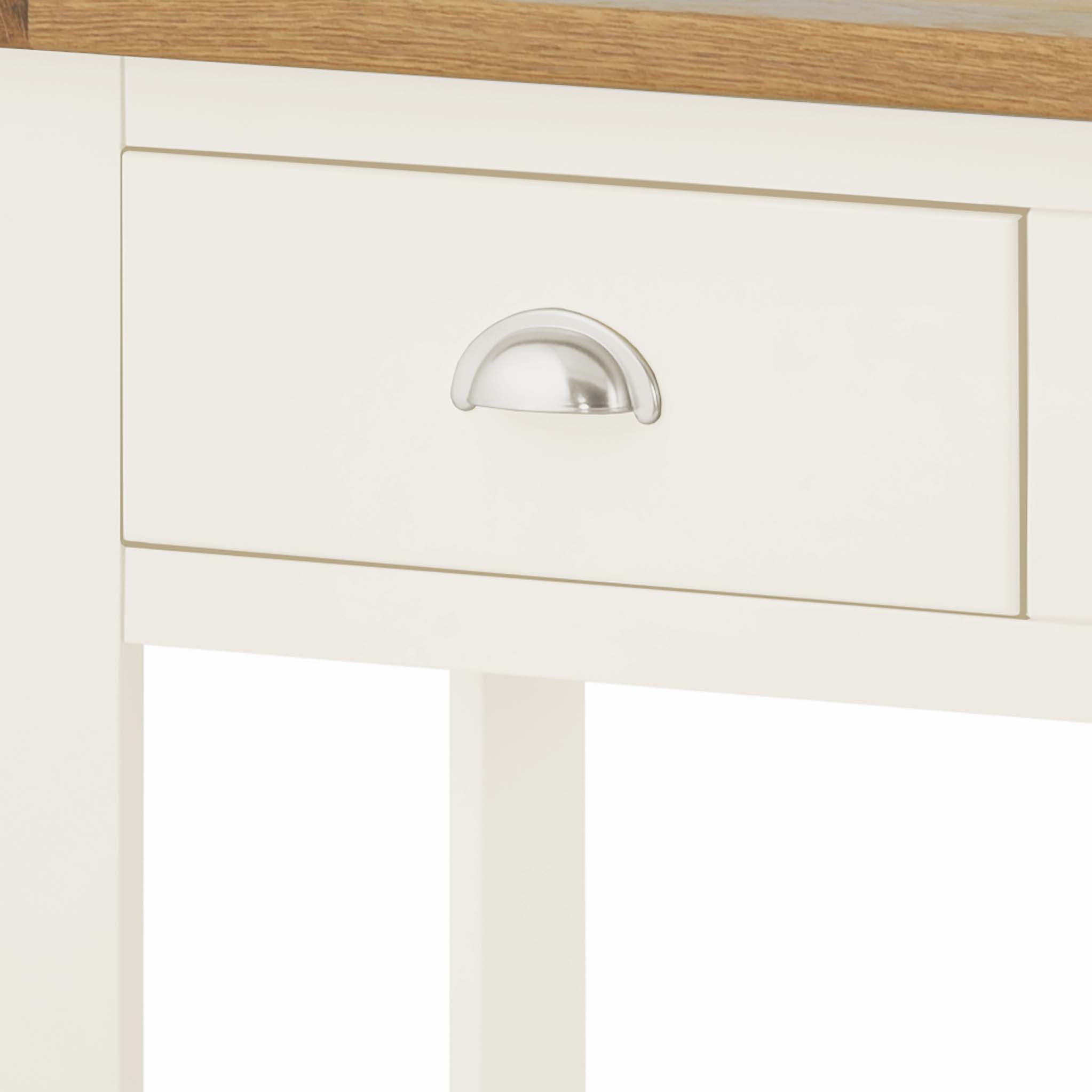 Add some style to your hallway with the Padstow painted console table. With two spacious drawers and a beautiful oak top, its the perfect place for photos, a vase of flowers or somewhere to drop the post on the way through the door. Equally suited as a lamp table in a living room, where the extra storage provided by the drawers and lower shelf is sure to come in handy! Delivered fully built and with attractive half-cup handles, its a lovely piece for your home.