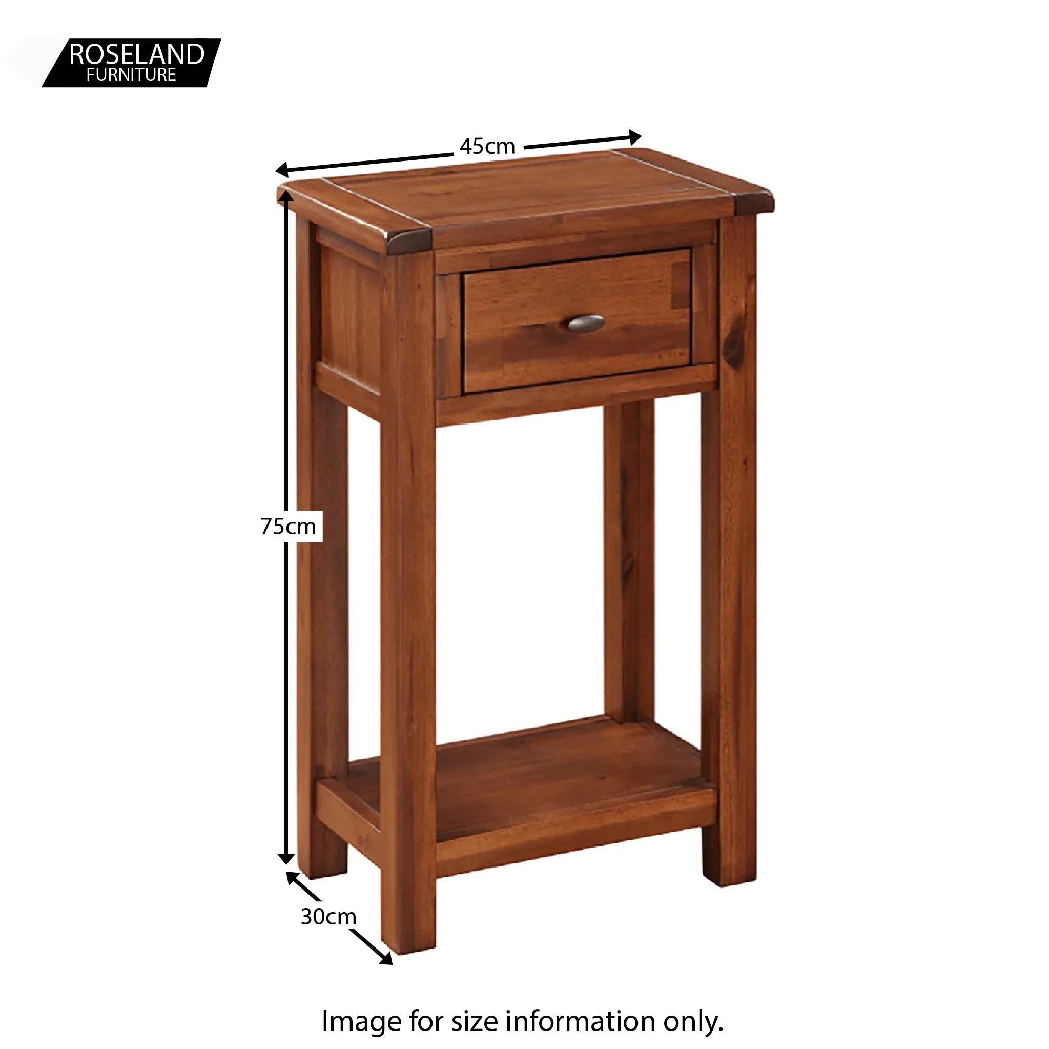 The Prussia Acacia Medium Console Table is a great hallway storage solution, enabling you to store keys or gloves whilst displaying a treasured photo frame or vase of flowers to create a sense of welcome as guests enter and leave the house. This console table, the smaller of the two offered in the Prussia Acacia range, features one drawer over one lower shelf. It has a small footprint, ideal for when space is at a premium and it's dark colour mean that it will blend well into most colour schemes.