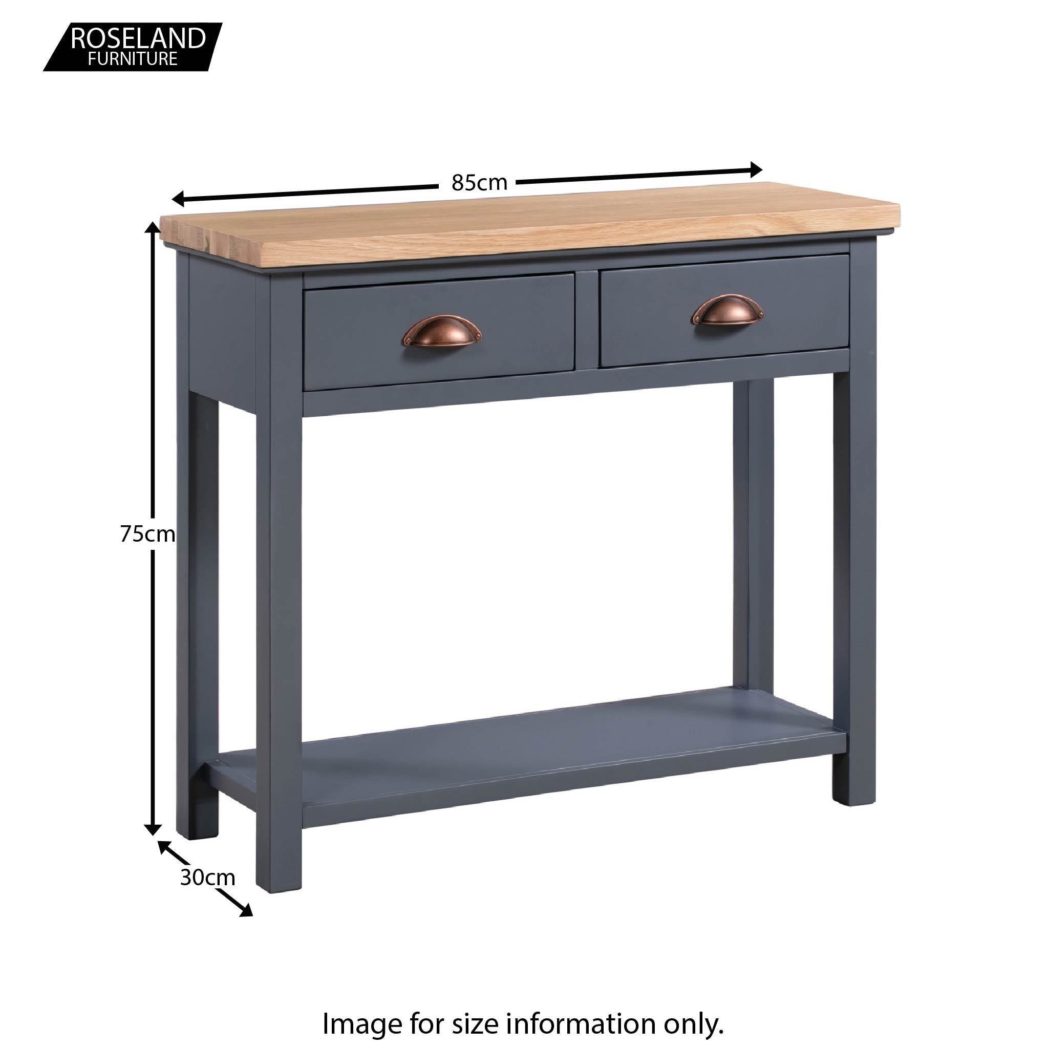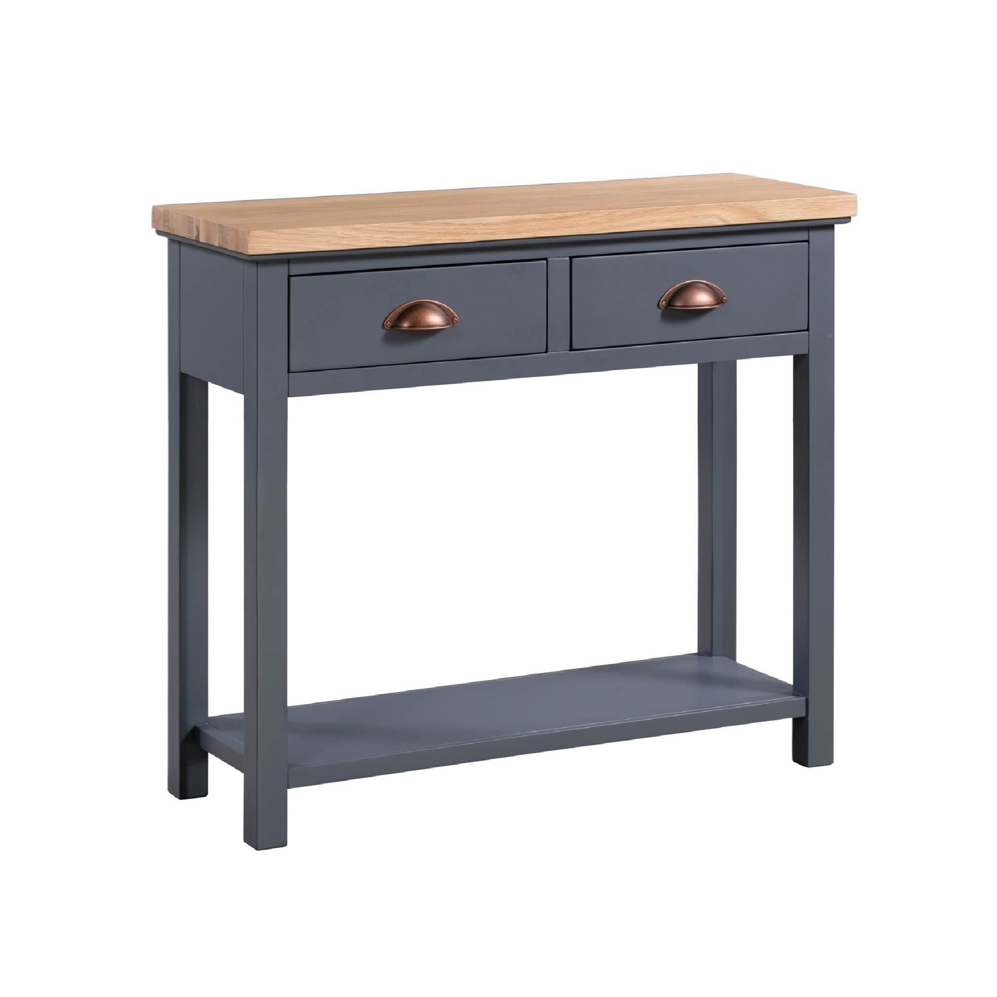 - Sleek and modern console table, which contrasts the blue-grey painted frame with the natural solid oak top beautifully.