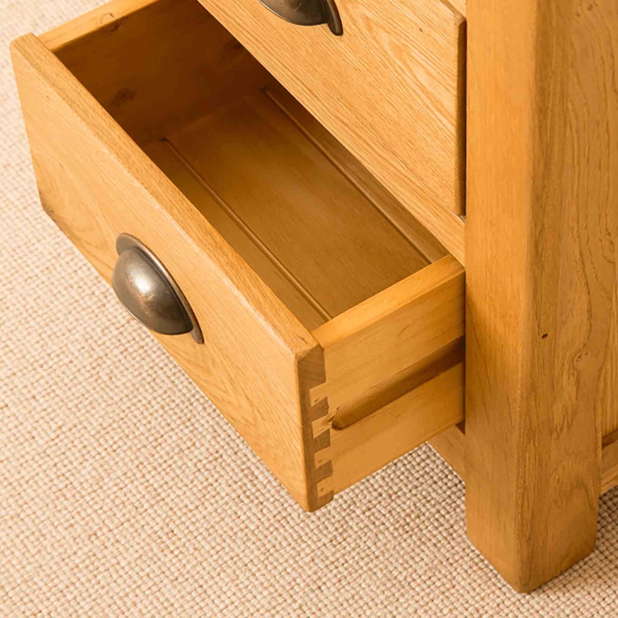 Our Roseland Oak range is an exciting new range for us here at Roseland Furniture. Manufactured for us exclusively, we are pleased to be able to offer the range in both living and bedroom furniture. The pieces are crafted from solid oak and oak veneer with the edges of each item beautifully rounded before being finished in a medium wax to really emphasise the grain of the wood. The shell handles offer a modern twist to the otherwise rustic look. All drawers are crafted with dovetail joints with all drawer boxes made from solid pine.