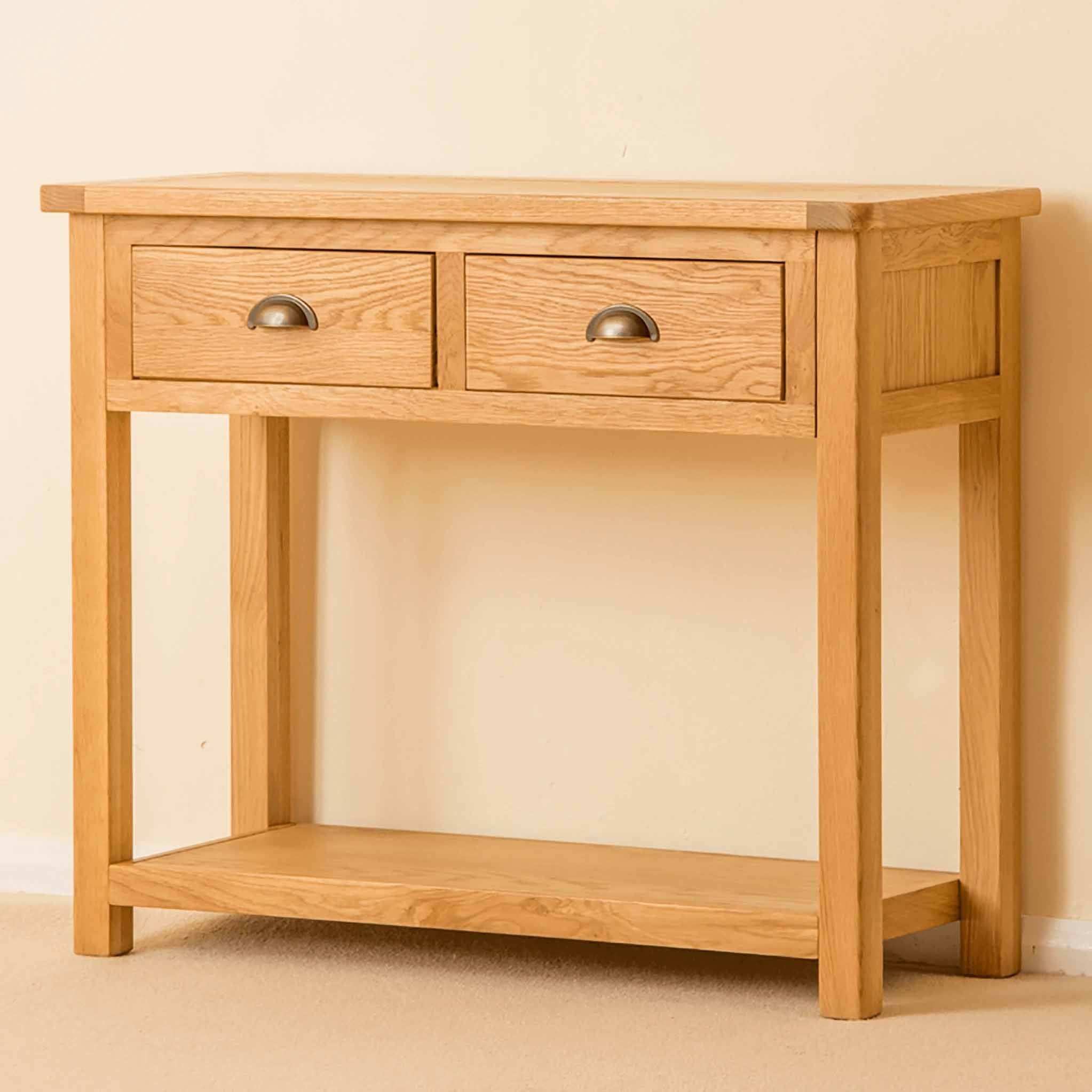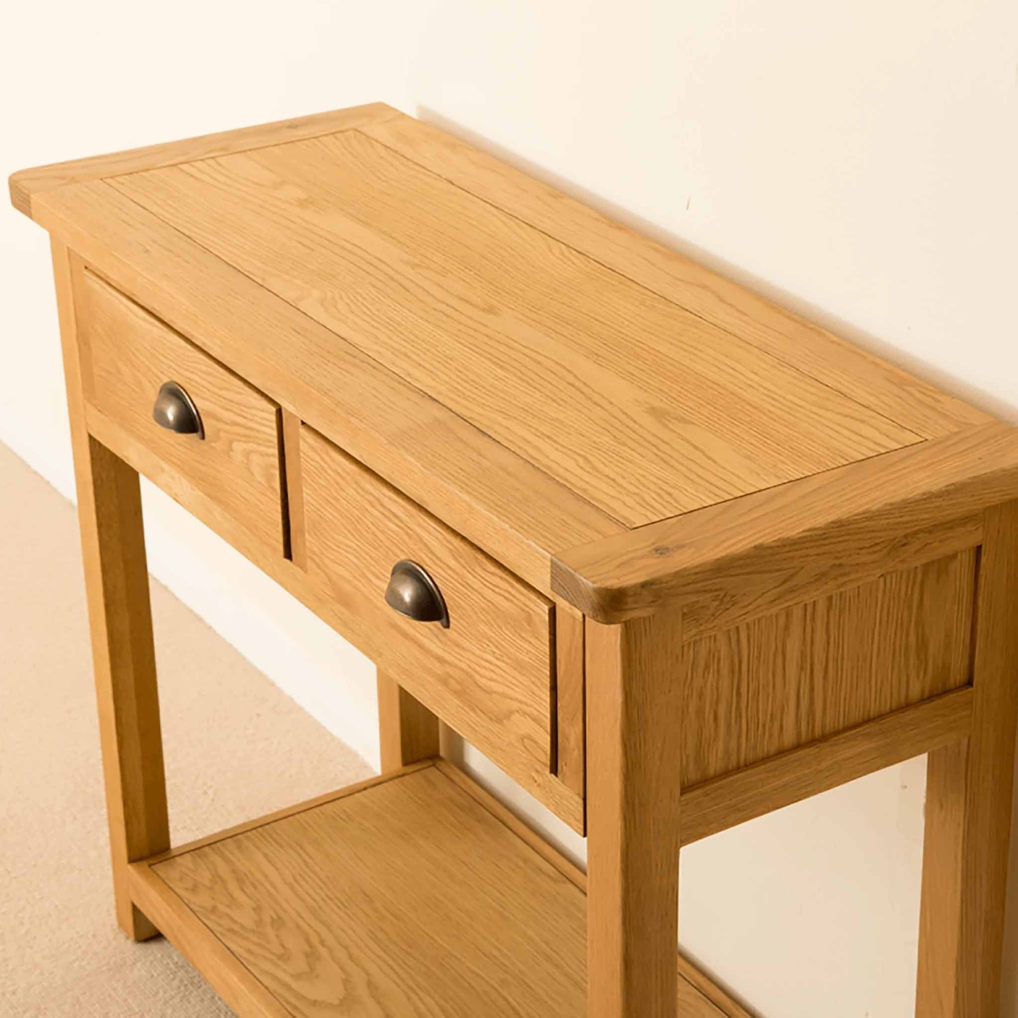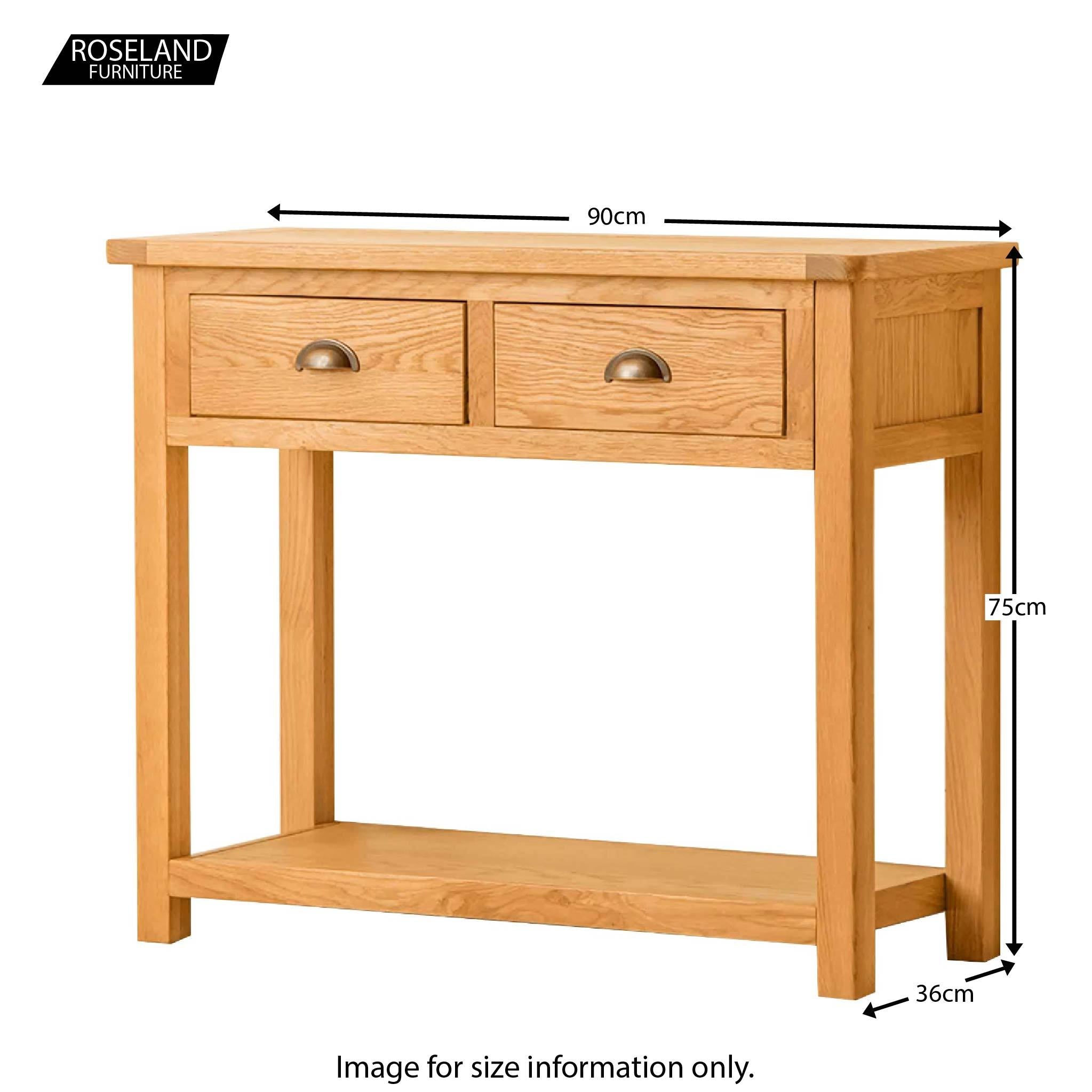 The larger of the two hall tables in the Roseland Oak range. Featuring two spacious drawers - perfect for hiding all those bits of unwanted post, and odds & ends- and a practical lower shelf, make this item perfect for any room in the home. Display photos on the spacious top, or its a great place to drop your keys on the way in the door after a long day-or night.
