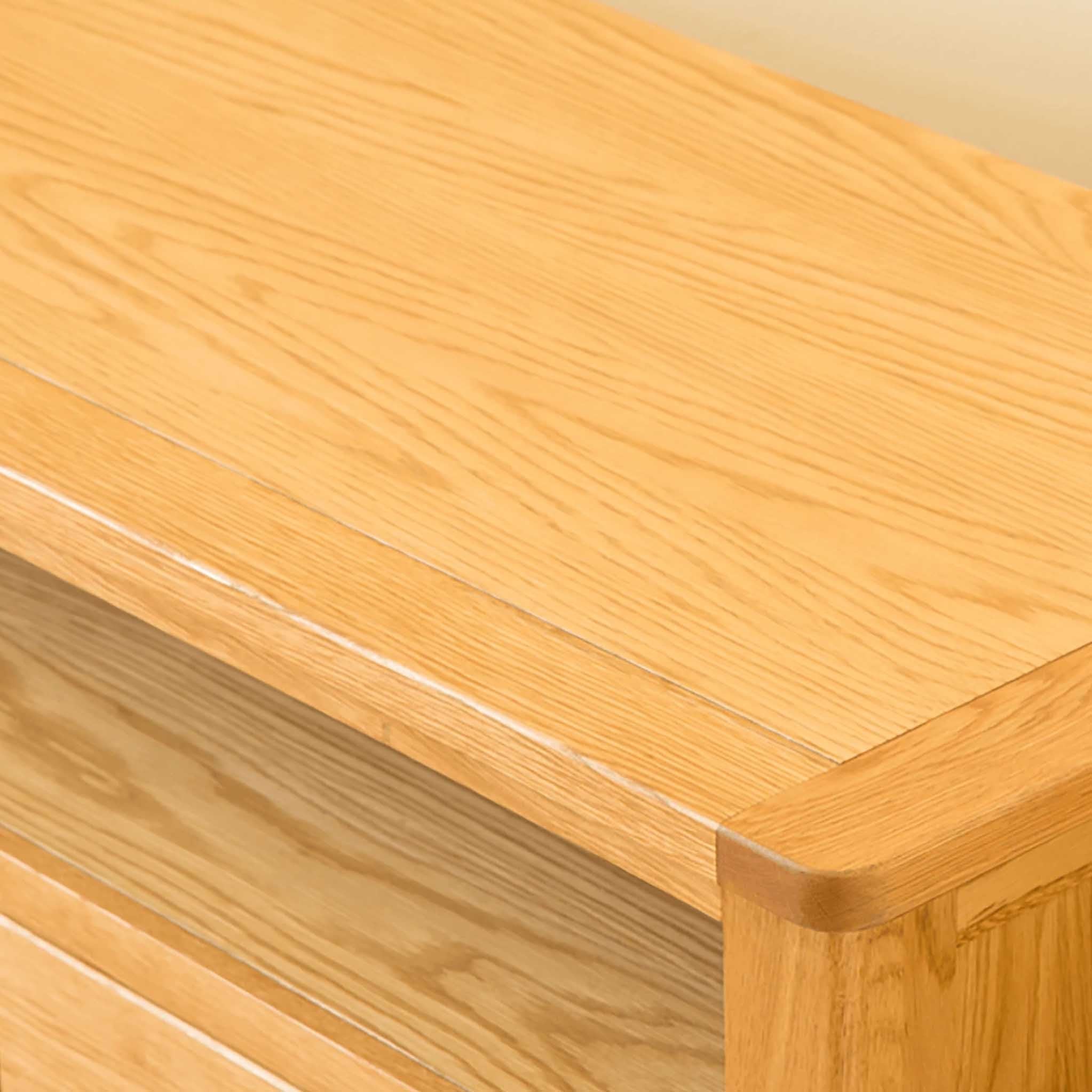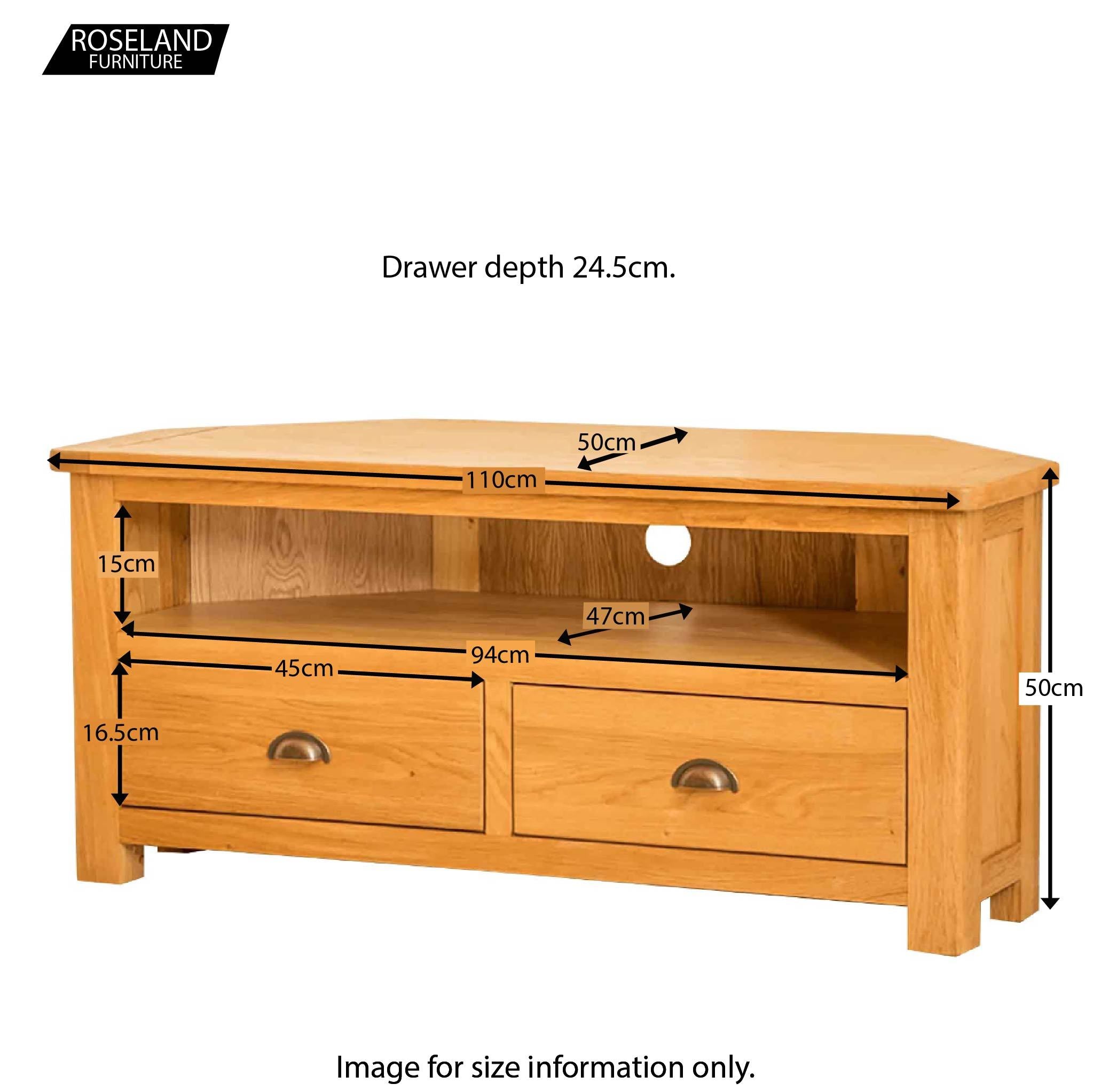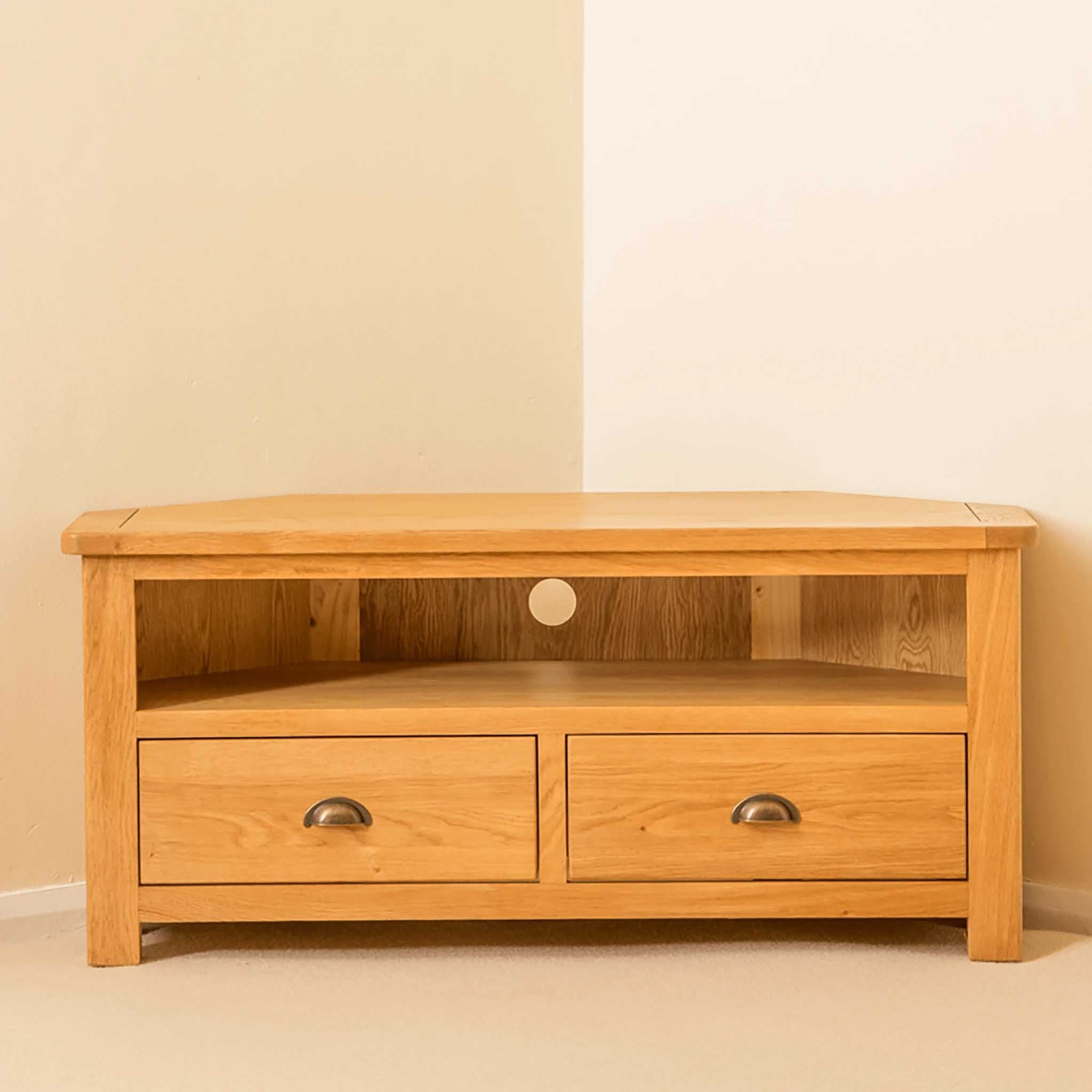 The unit is designed to be able to support some of the bigger TV's and is built with practicality in mind as well as being a solid oak sturdy unit. It provides useful storage in the form two spacious drawers below a large open shelf. The shelf has holes cut into the back to allow cables to pass through.