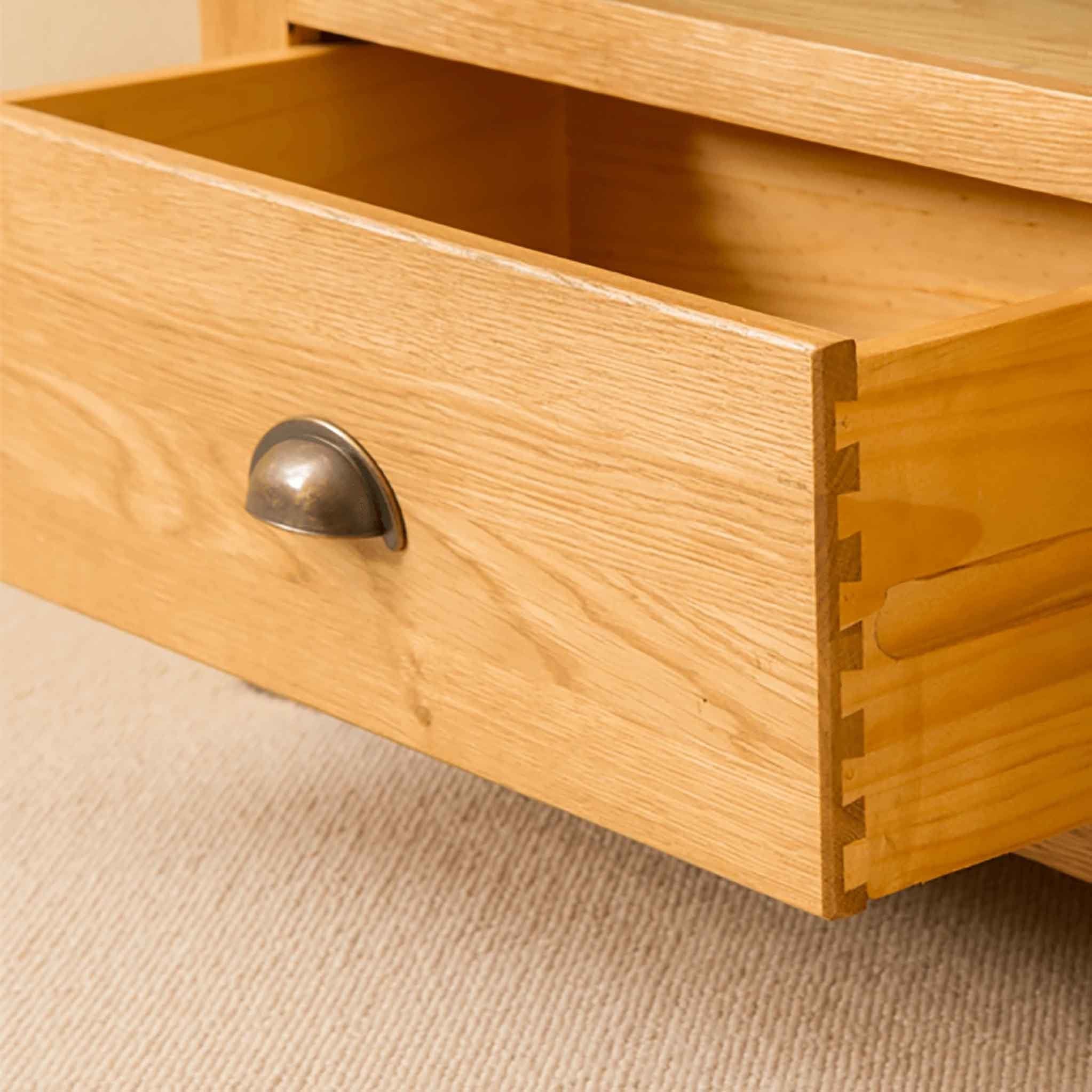 Our Roseland Oak range is an exciting new range for us here at Roseland Furniture. Manufactured for us exclusively, we are pleased to be able to offer the range in both living and bedroom furniture. The pieces are crafted from solid oak and oak veneer with the edges of each item beautifully rounded before being finished in a medium wax to really emphasise the grain of the wood. The shell handles offer a modern twist to the otherwise rustic look. All drawers are crafted with dovetail joints with all drawer boxes made from solid pine.