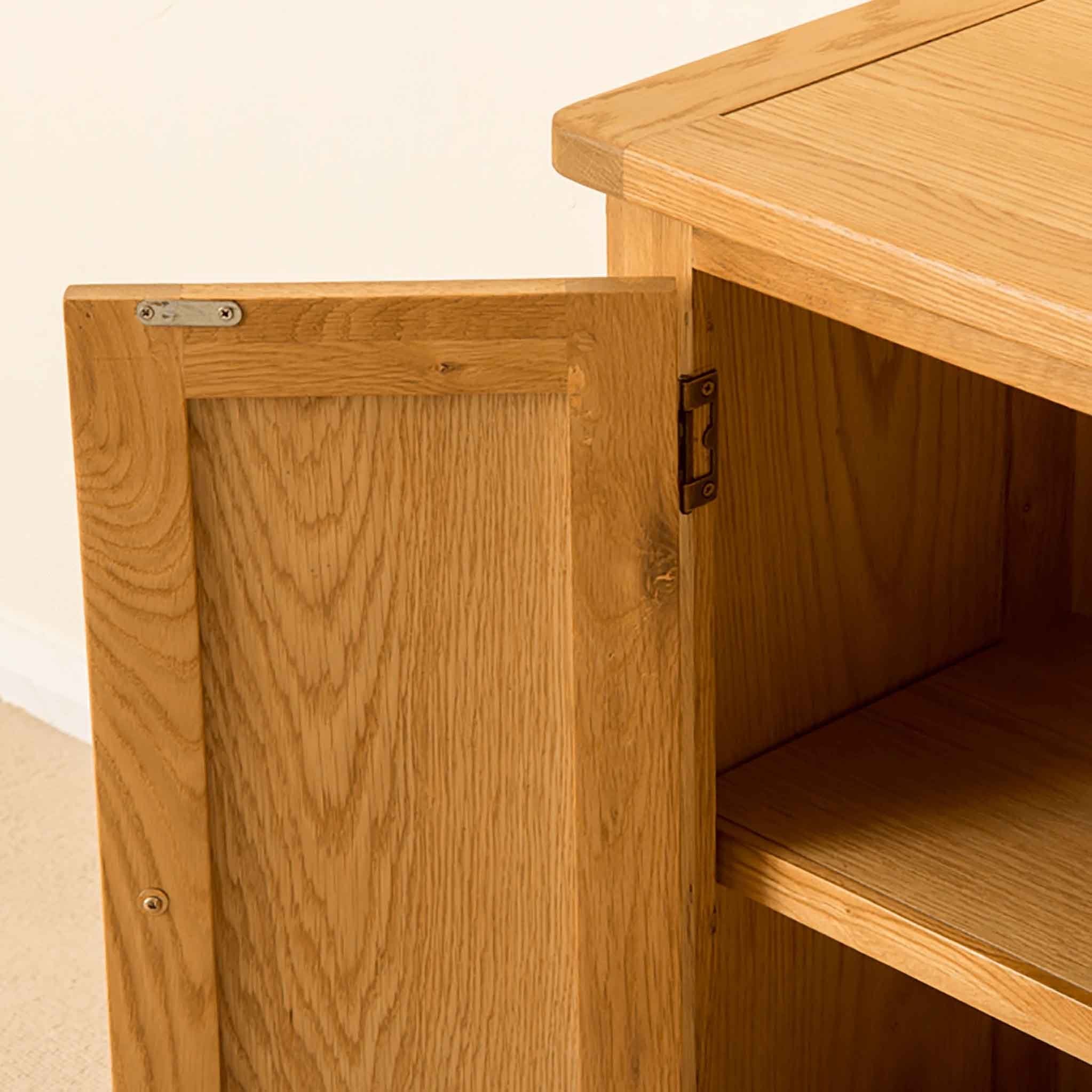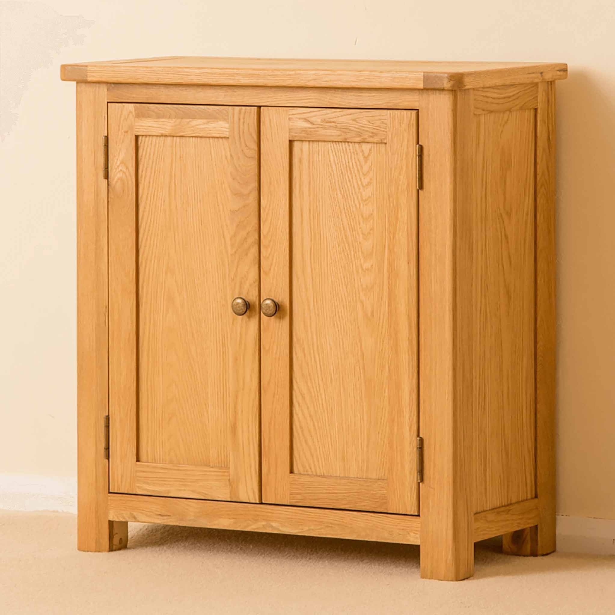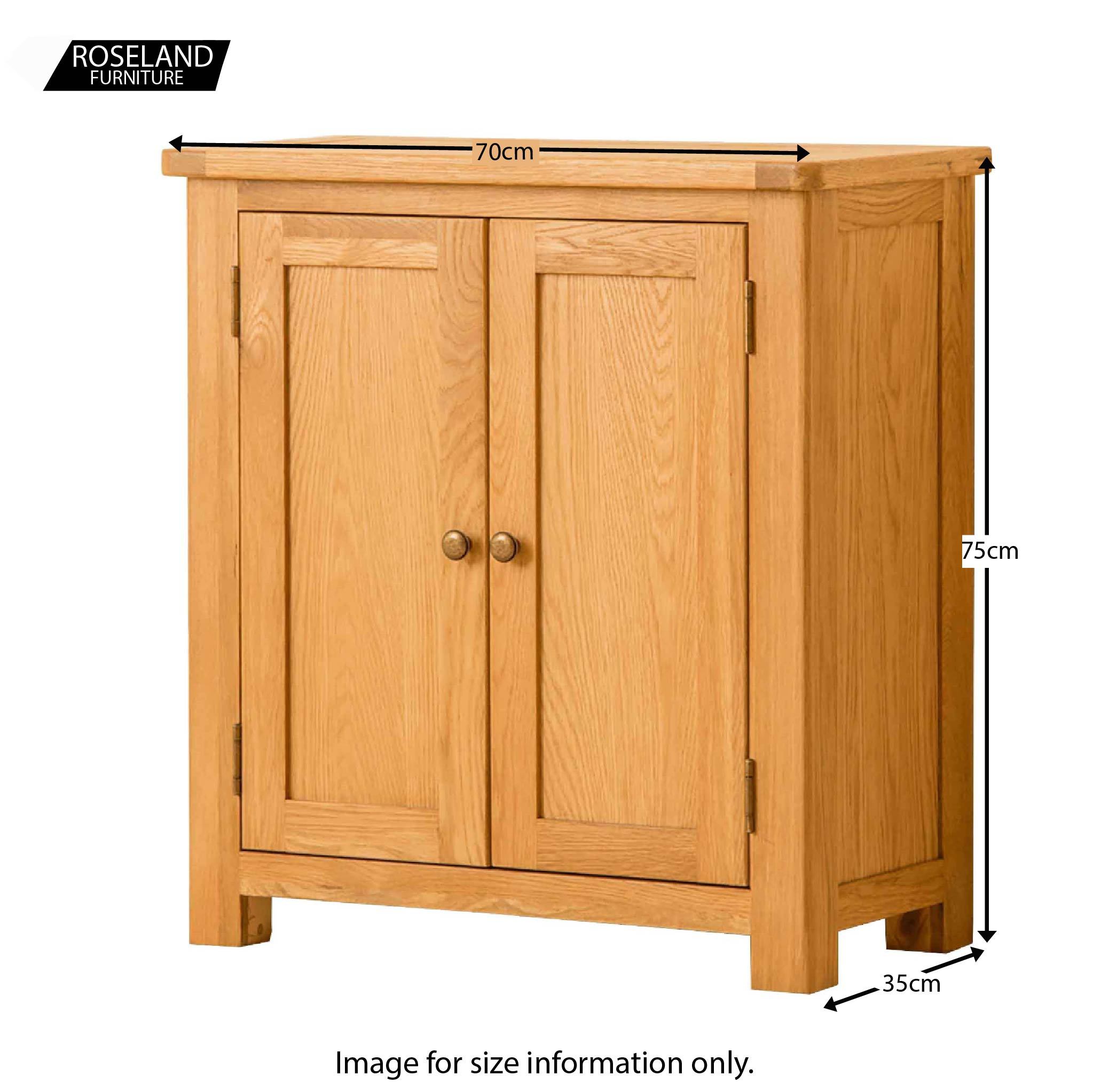 This small oak cupboard is part of our exclusive Roseland Oak range. Designed to be a practical design for any living space it provides useful storage and has a shelf mounted half way up in the cupboard which is fixed and non adjustable. The perfect addition for the hallway, living or dining room; it adds a touch of classic modernity to your home.