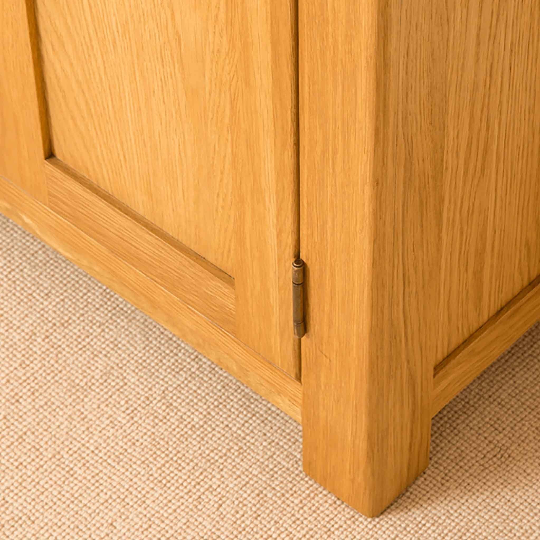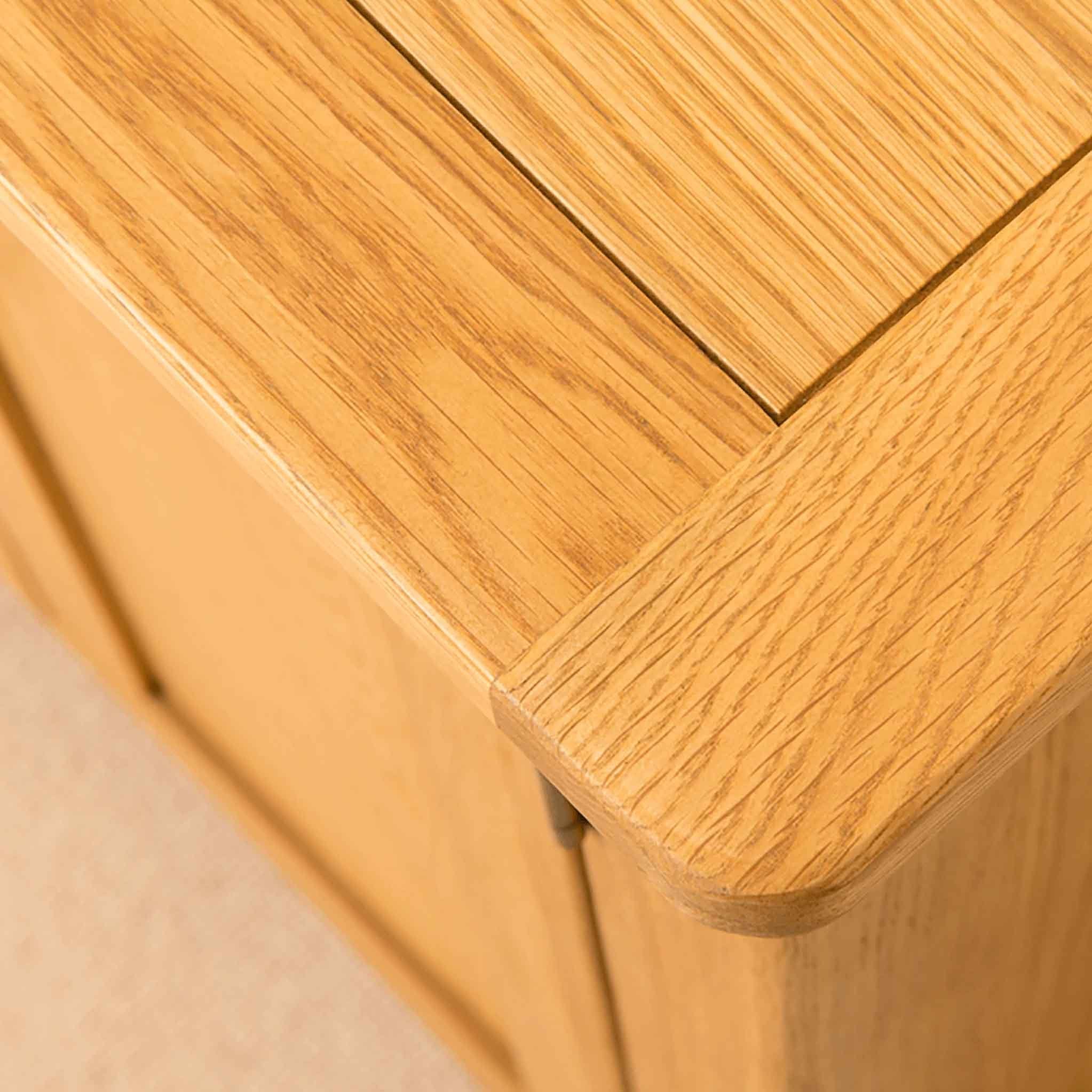 Our Roseland Oak range is an exciting new range for us here at Roseland Furniture. Manufactured for us exclusively, we are pleased to be able to offer the range in both living and bedroom furniture. The pieces are crafted from solid oak and oak veneer with the edges of each item beautifully rounded before being finished in a medium wax to really emphasise the grain of the wood. The shell handles offer a modern twist to the otherwise rustic look. All drawers are crafted with dovetail joints with all drawer boxes made from solid pine.