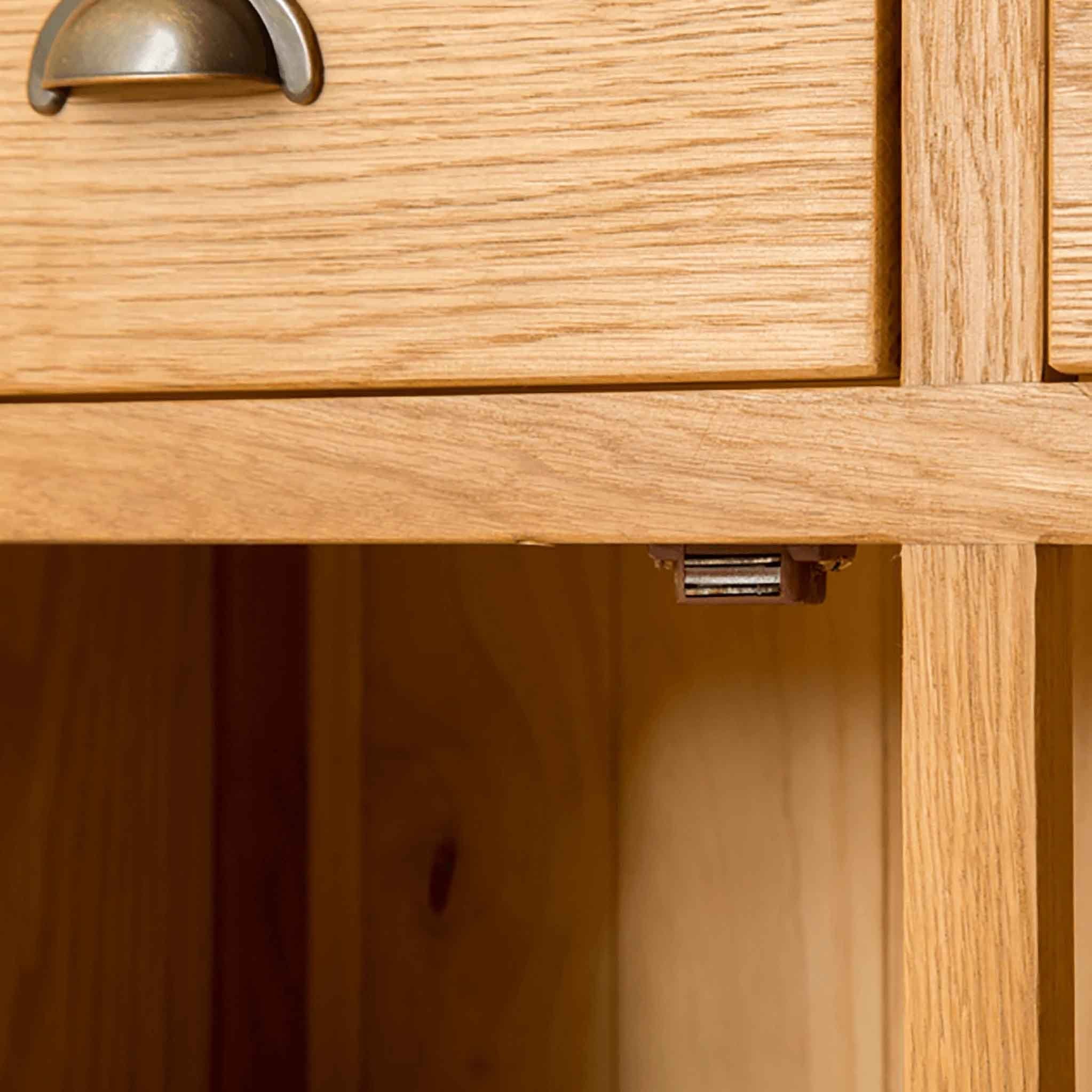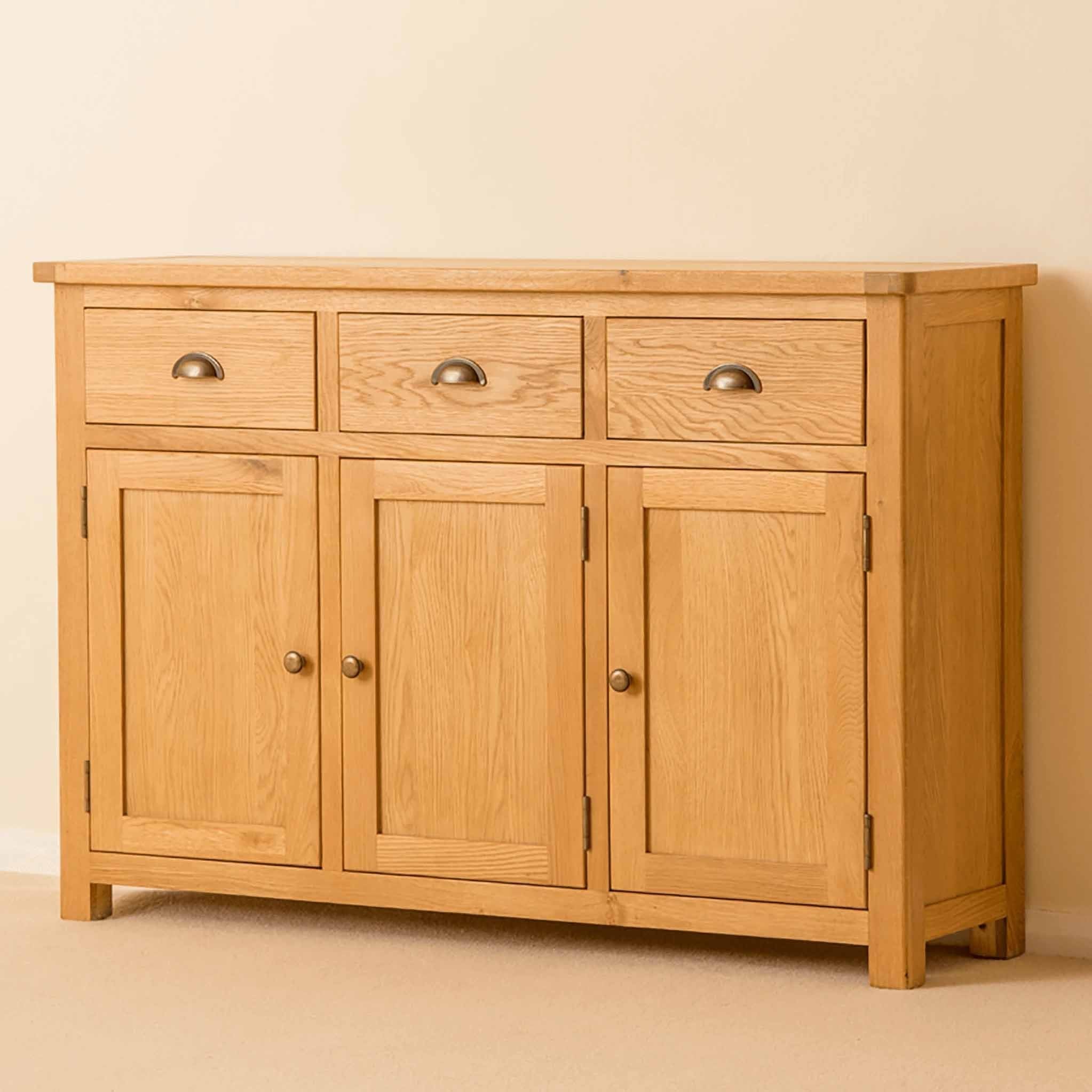 This oak sideboard is part of our exclusive Roseland Oak range. With its three door cupboard and three drawers above, its the largest of the sideboards within our Roseland Oak range. Designed to be a practical design for any living space it provides fantastic storage, the cupboard space is split into a two door & separate one door area. A shelf is mounted half way up in both of the cupboards and is fixed and non adjustable. This piece is sure to make a beautiful addition to your home, and is perfect for any living space.