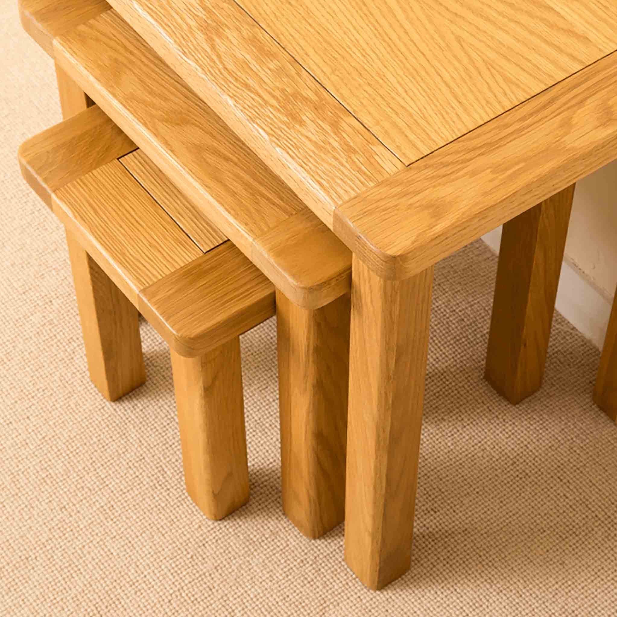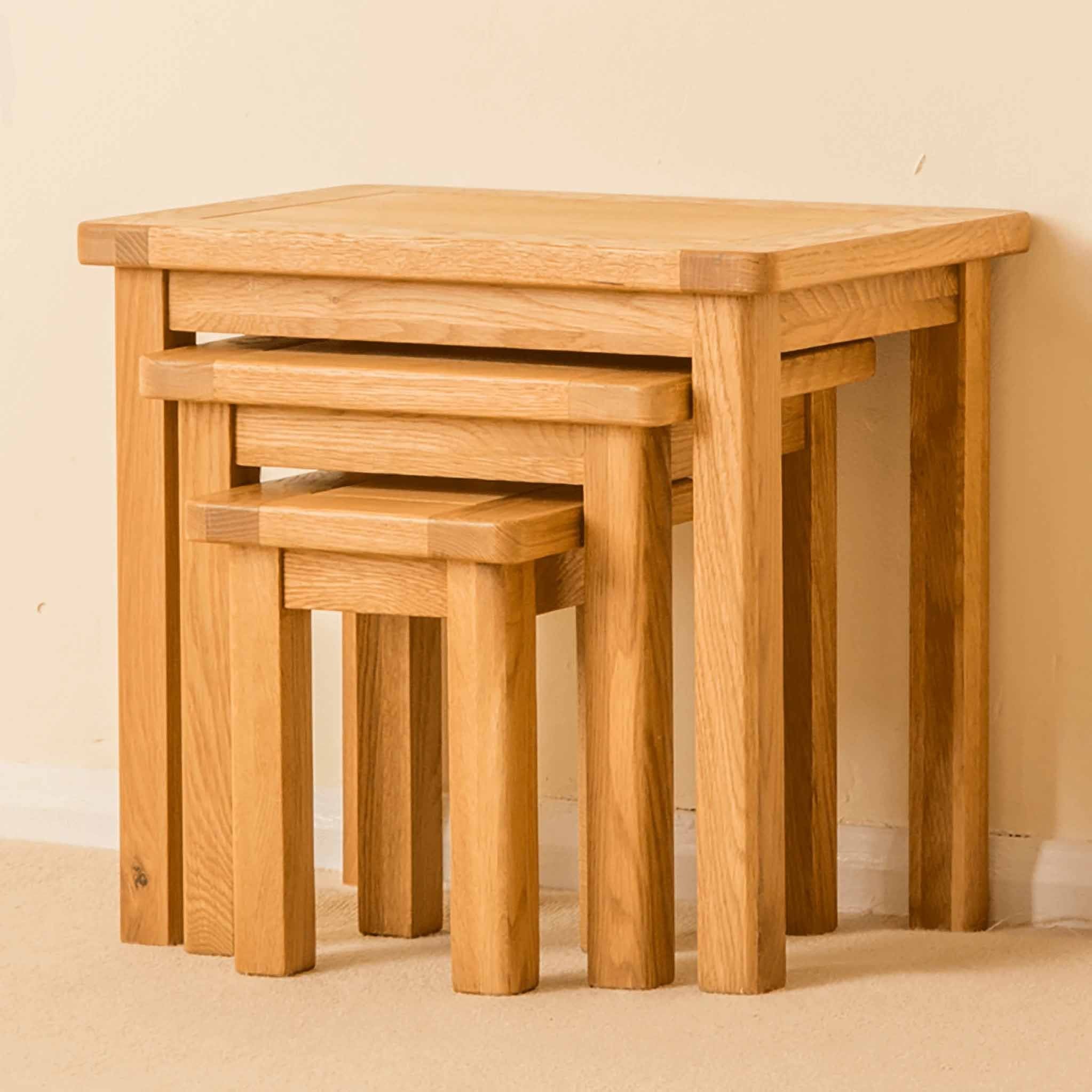 This oak nest of tables is part of our exclusive Roseland Oak range. The design features three tables, that have been beautifully crafted to provide practical solution for any living area. Add a touch of classic modernity to your home, these tables are perfect for when you require that extra table space for guests etc.