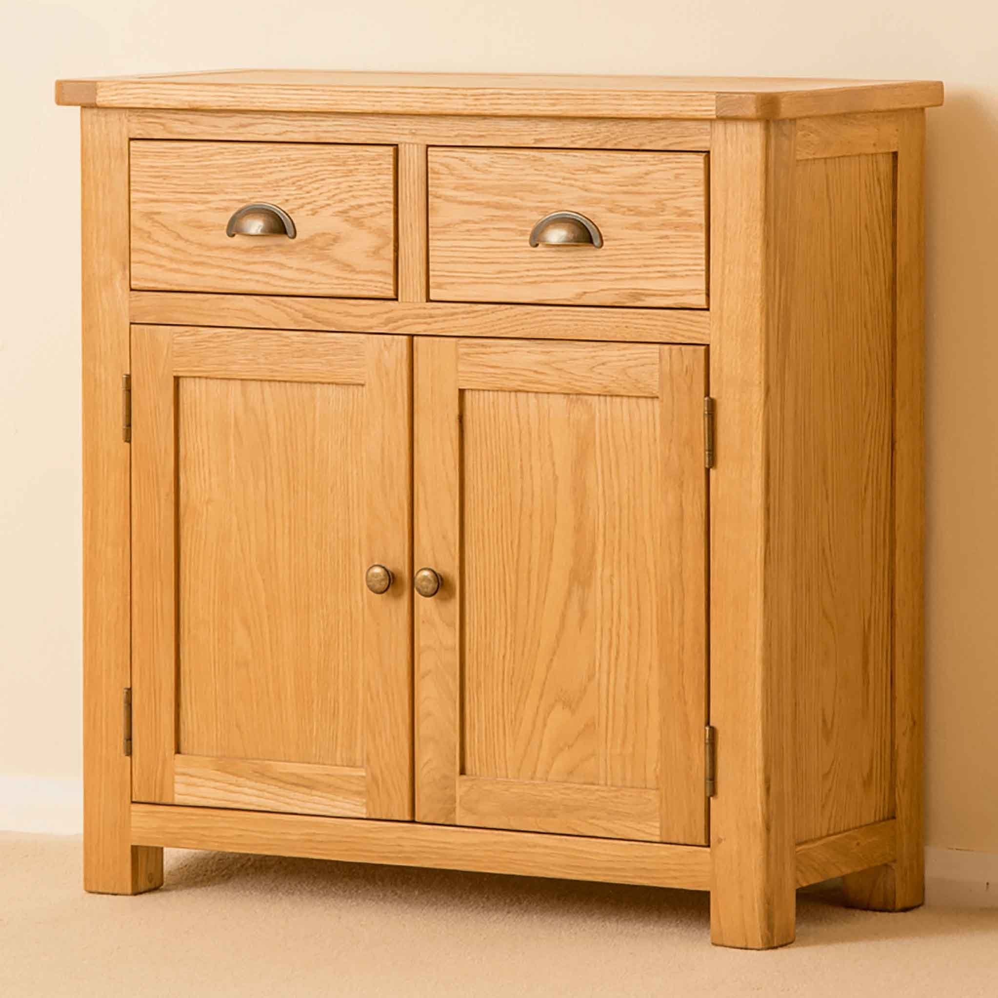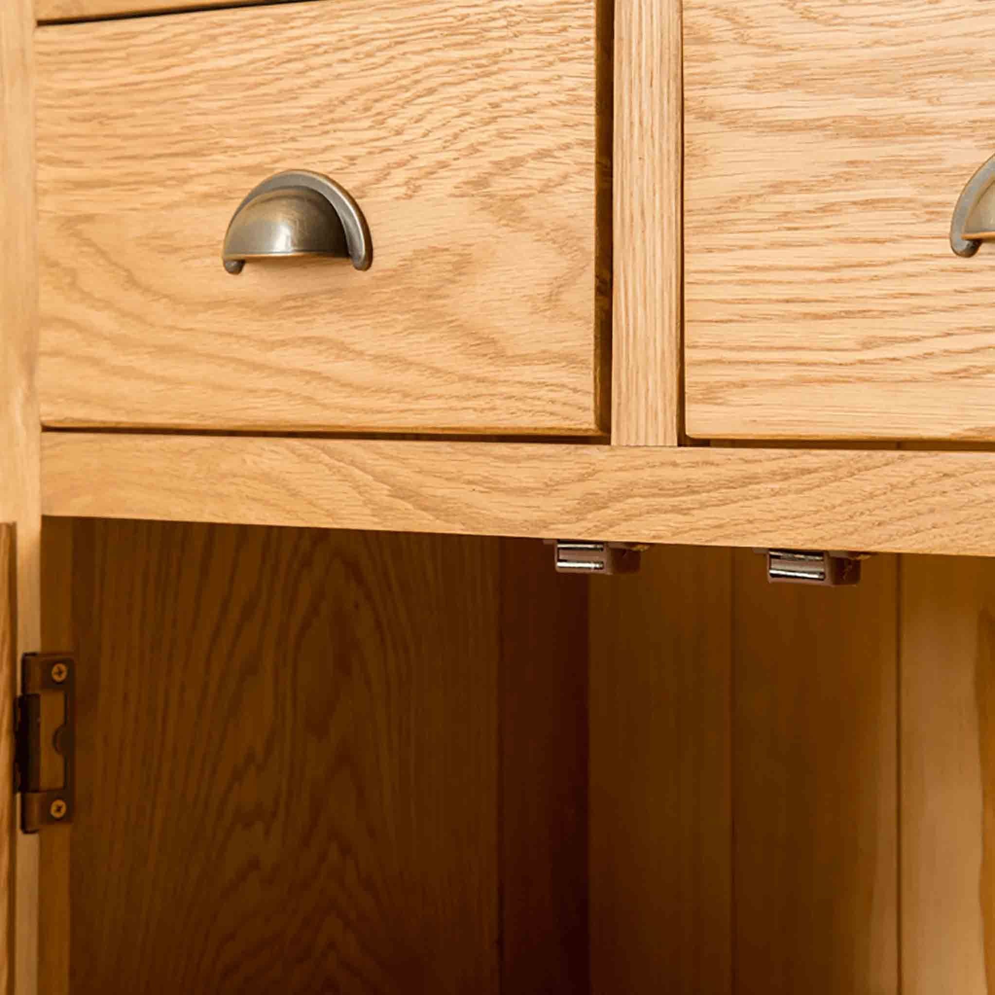 The smaller of the two sideboards available in the Roseland Oak range. Designed to be a practical design for any living space it provides useful storage as well as the perfect space for displaying photos, flowers, treasured mementos. Two large drawers above a roomy cupboard make up the design, great for photo albums, crockery etc. A shelf is mounted half way up in the cupboard and is fixed and non adjustable.