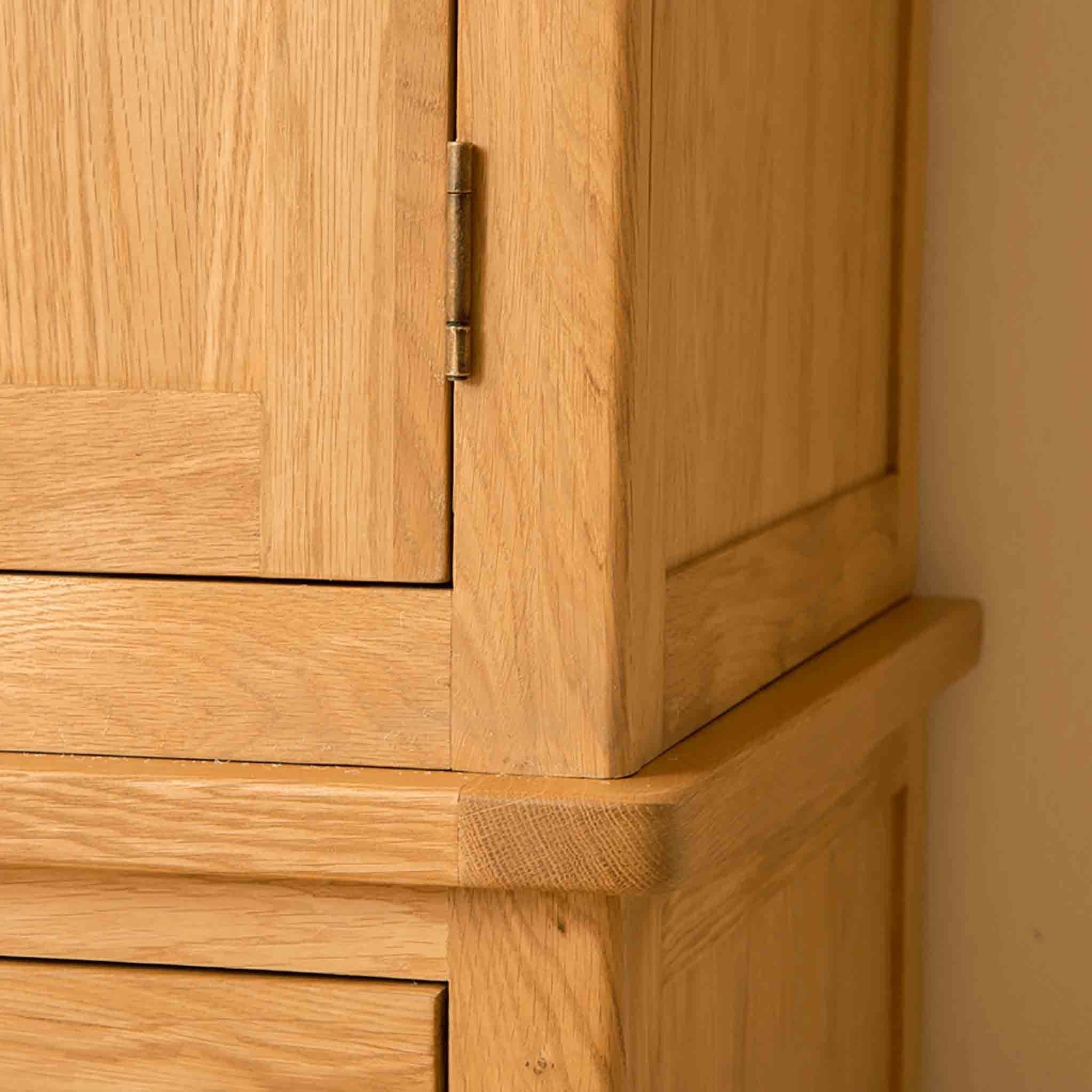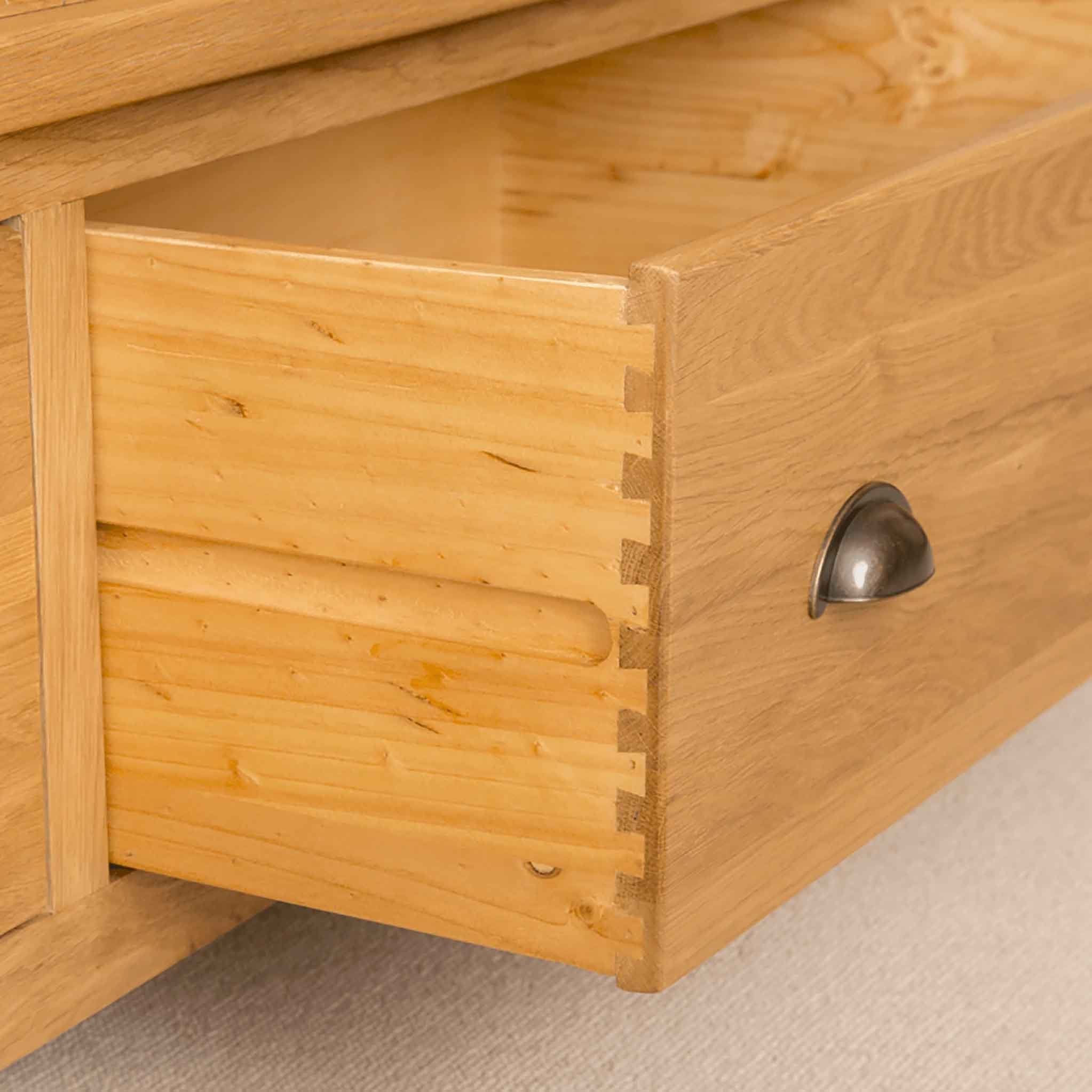 Our Roseland Oak range is an exciting new range for us here at Roseland Furniture. Manufactured for us exclusively, we are pleased to be able to offer the range in both living and bedroom furniture. The pieces are crafted from solid oak and oak veneer with the edges of each item beautifully rounded before being finished in a medium wax to really emphasise the grain of the wood. The shell handles offer a modern twist to the otherwise rustic look. All drawers are crafted with dovetail joints with all drawer boxes made from solid pine