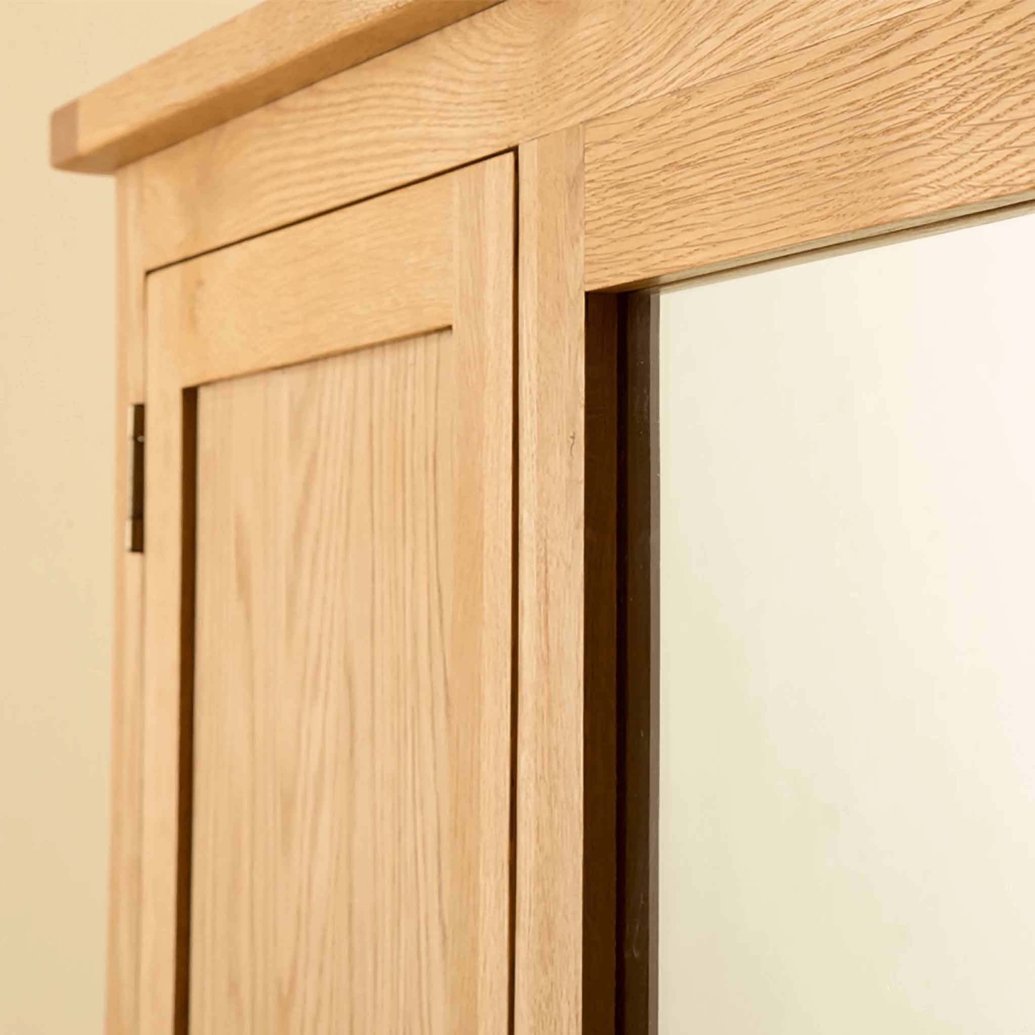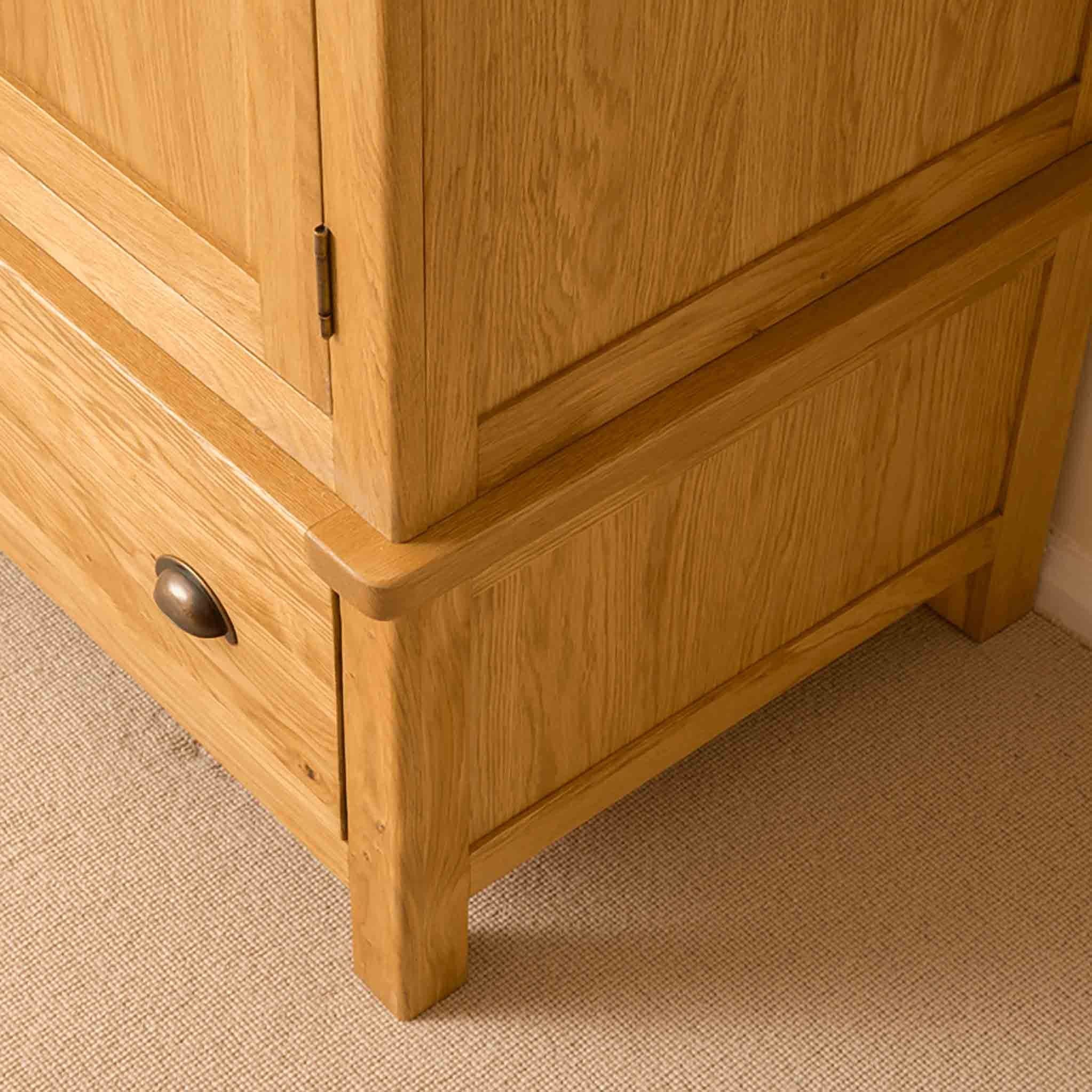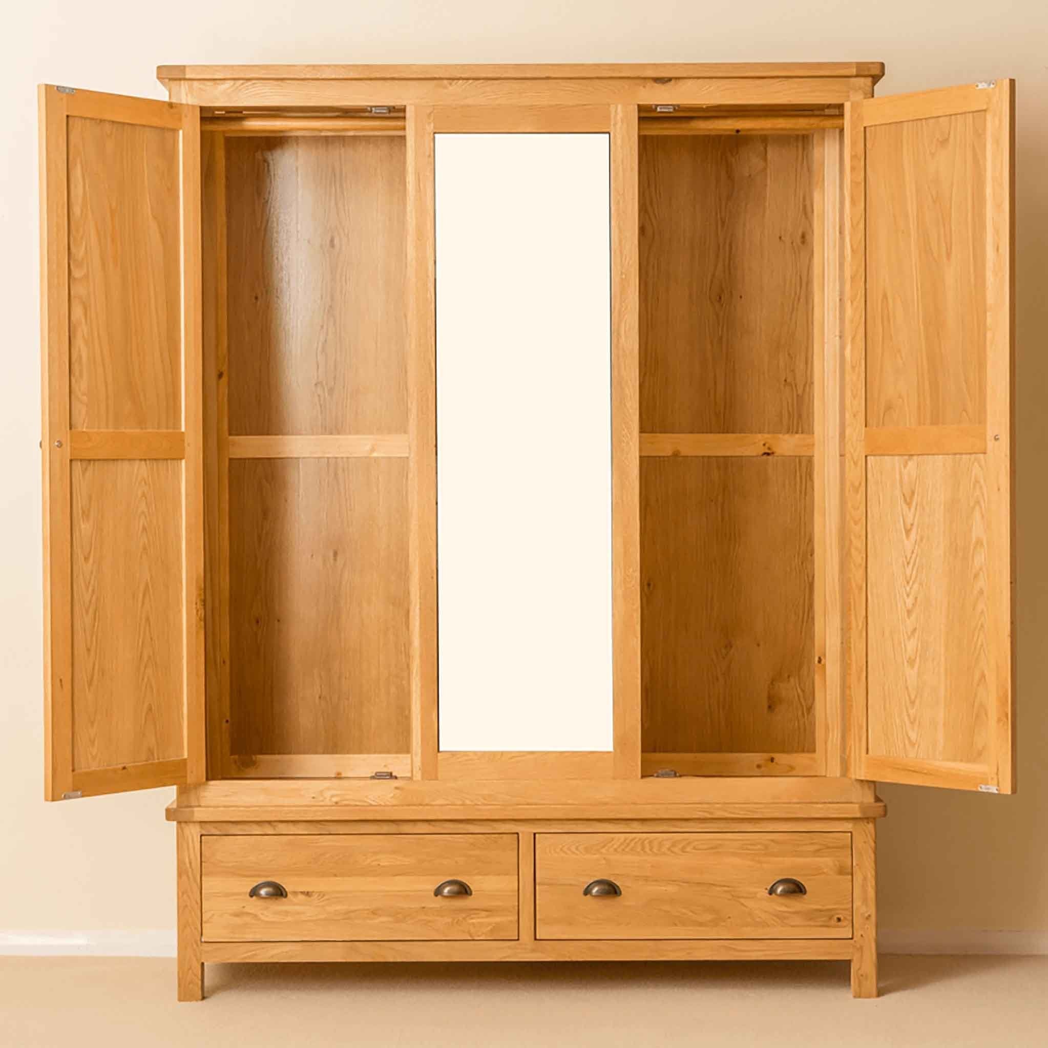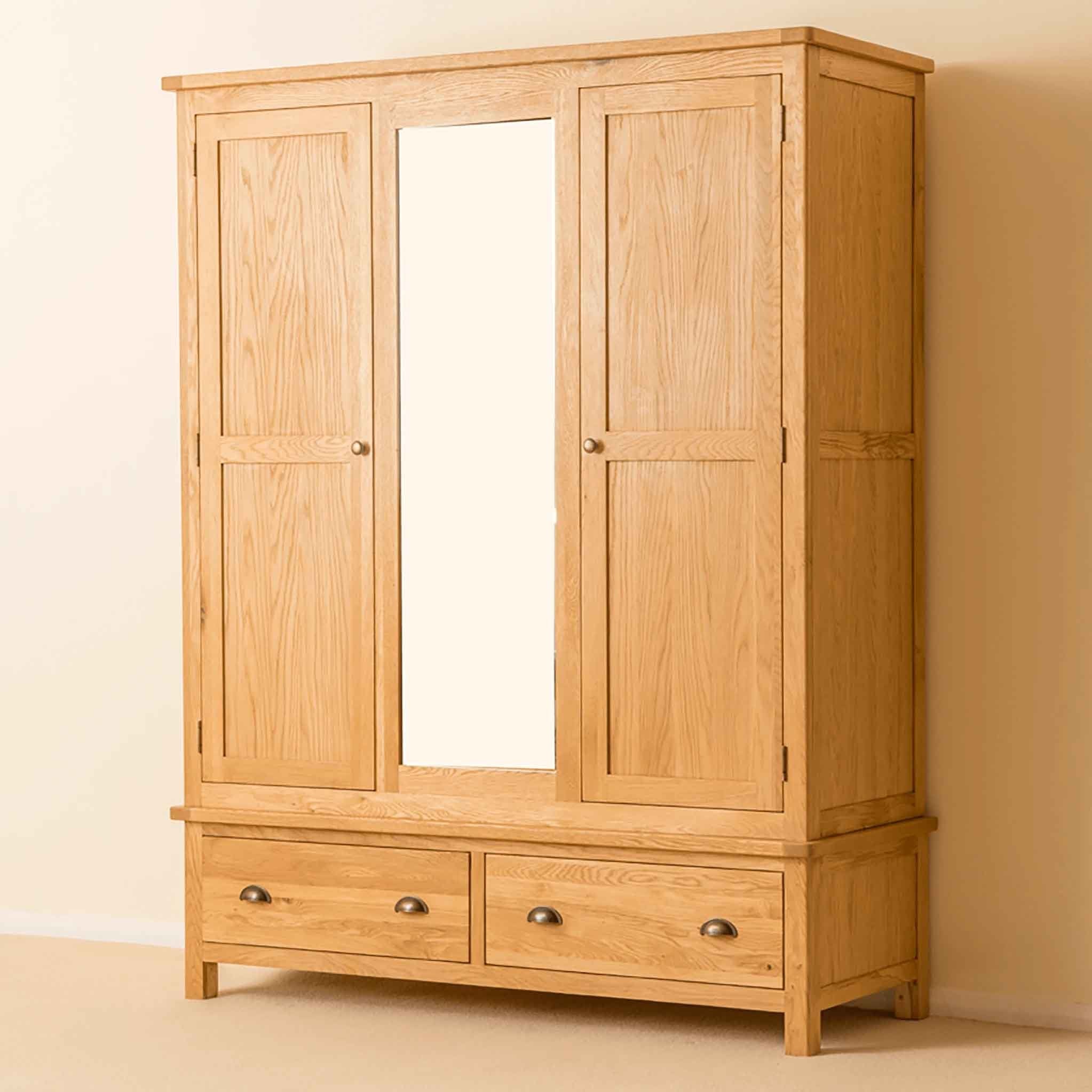 This oak triple wardrobe is part of our exclusive Roseland Oak range. Designed to suit any bedroom it provides fantastic hanging space and useful storage below with two spacious drawers. The front section between the doors is fitted with a high quality mirror. The top section is delivered in panels to allow for ease of delivery (upstairs if needs be). Its not complicated to assemble as the doors are already hung in the front panel and the sides, back and top easily fix to it with the bolts provided.