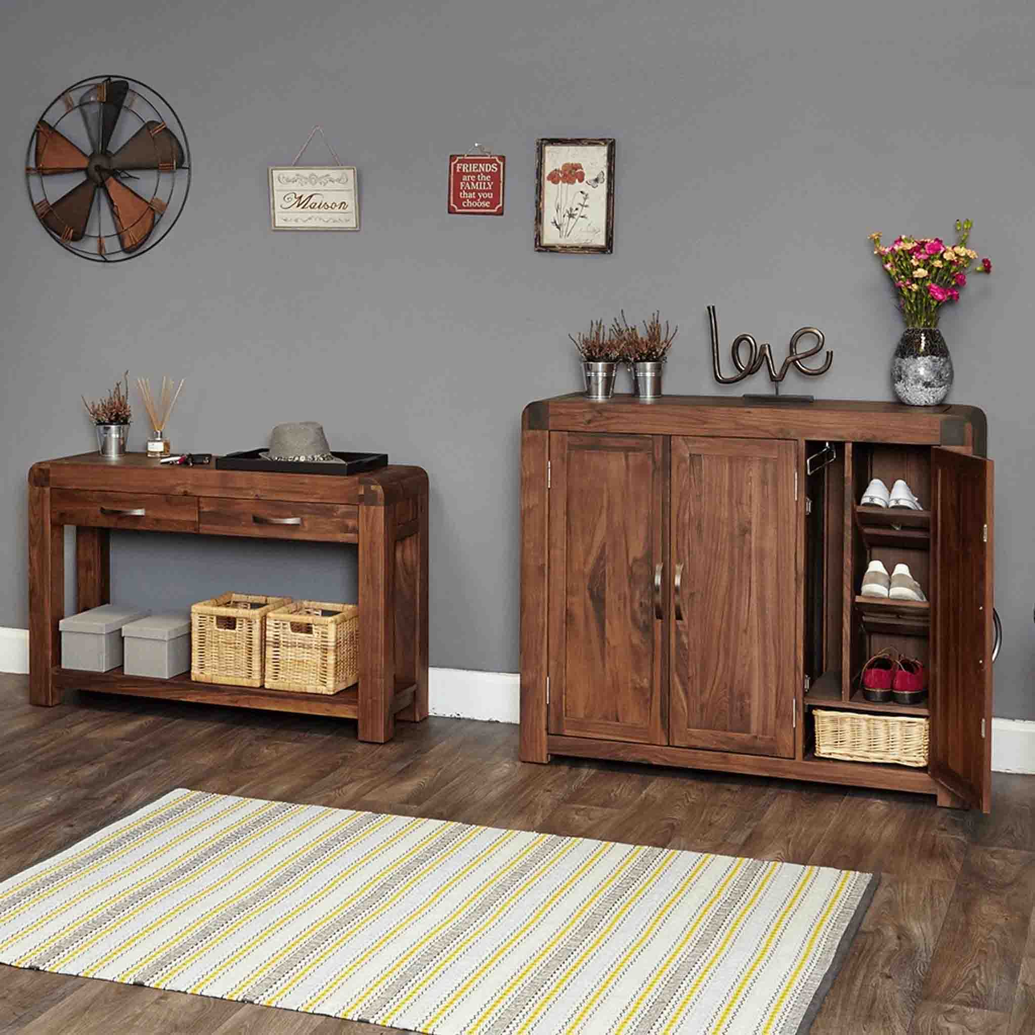 This solid walnut Extra large shoe cupboard is from our Salem range and the perfect addition to your living area. The left-hand cupboard features four shelves, one of which is removable for boot storage. The right-hand cupboard features three shelves and a clever pull-out rail to hang umbrellas.