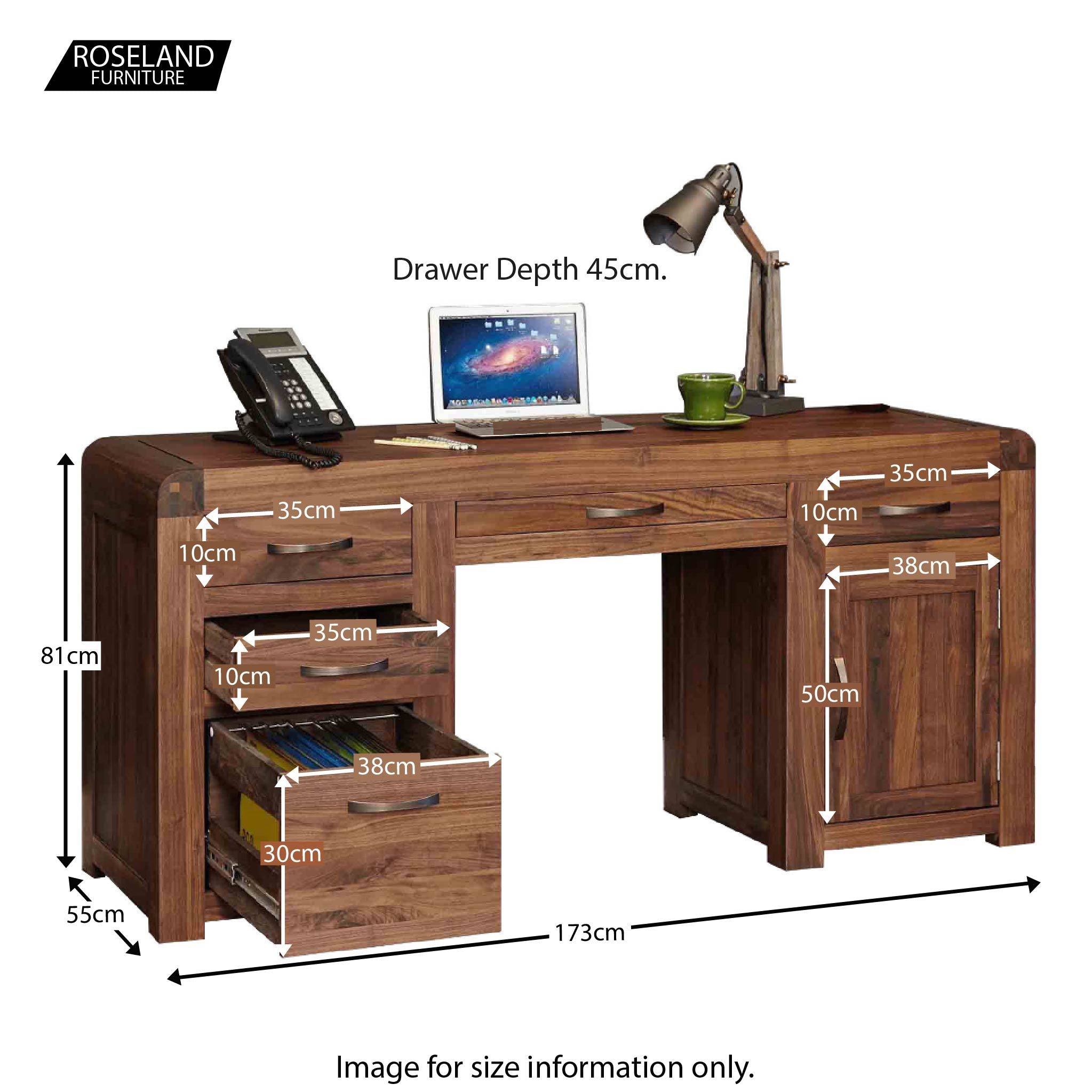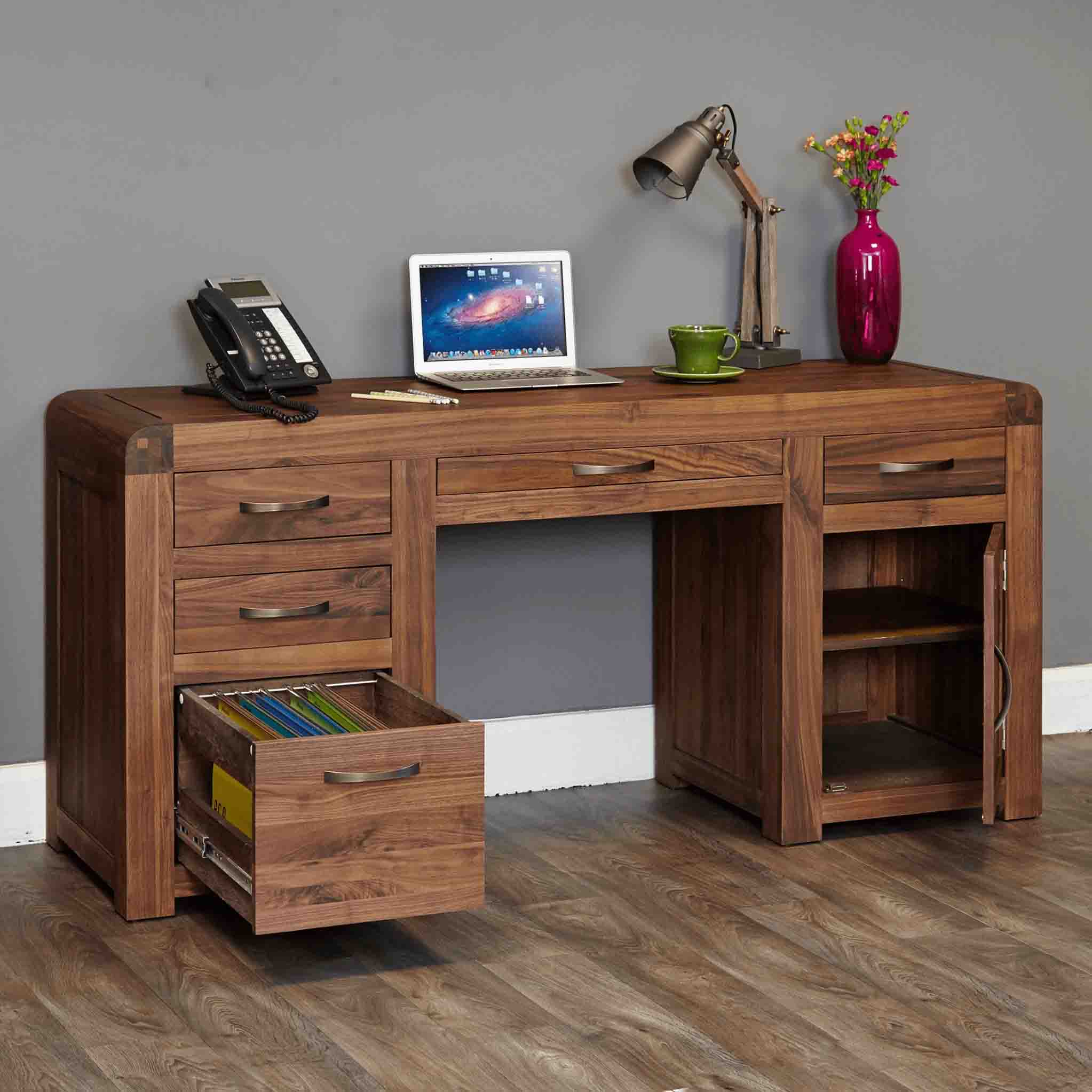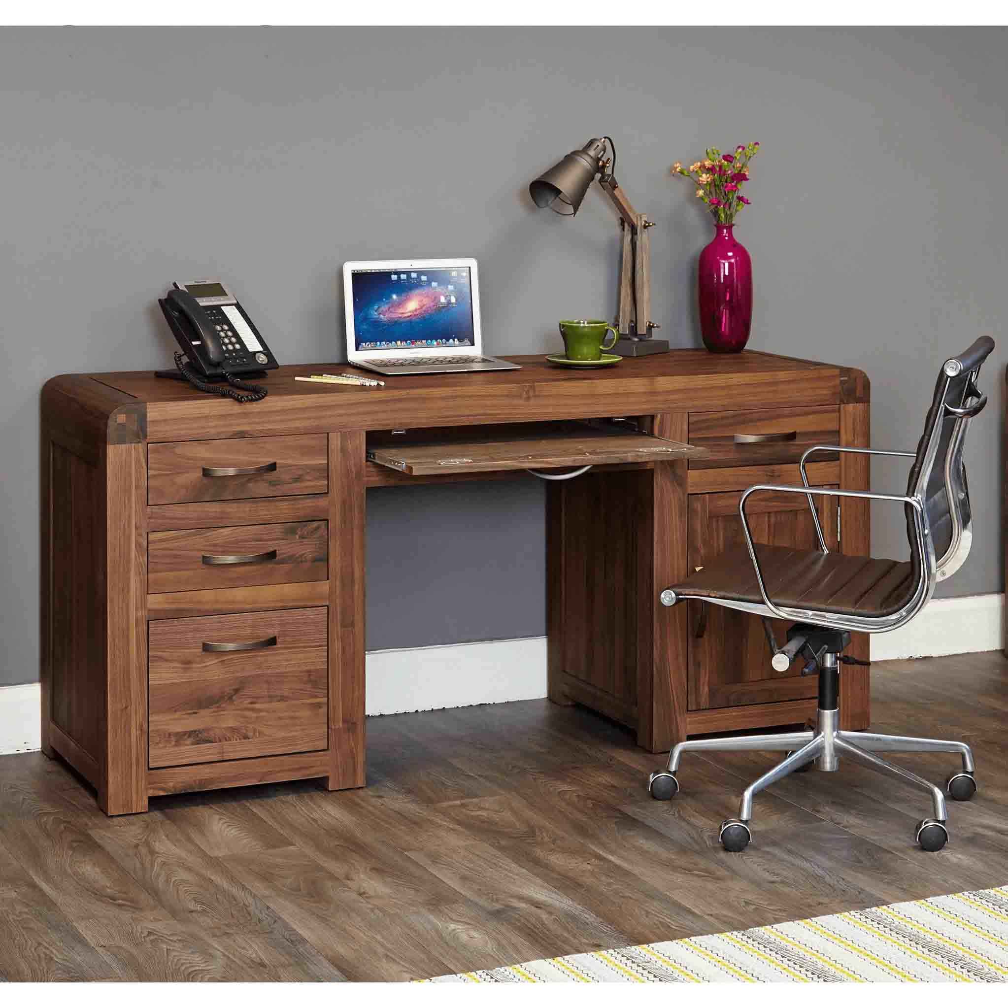 This large twin pedestal solid walnut desk is from our Salem range and is perfect for any home office or study. The upper central drawer has a hinged front and houses your keyboard and mouse. The left two upper drawers provide useful additional storage.