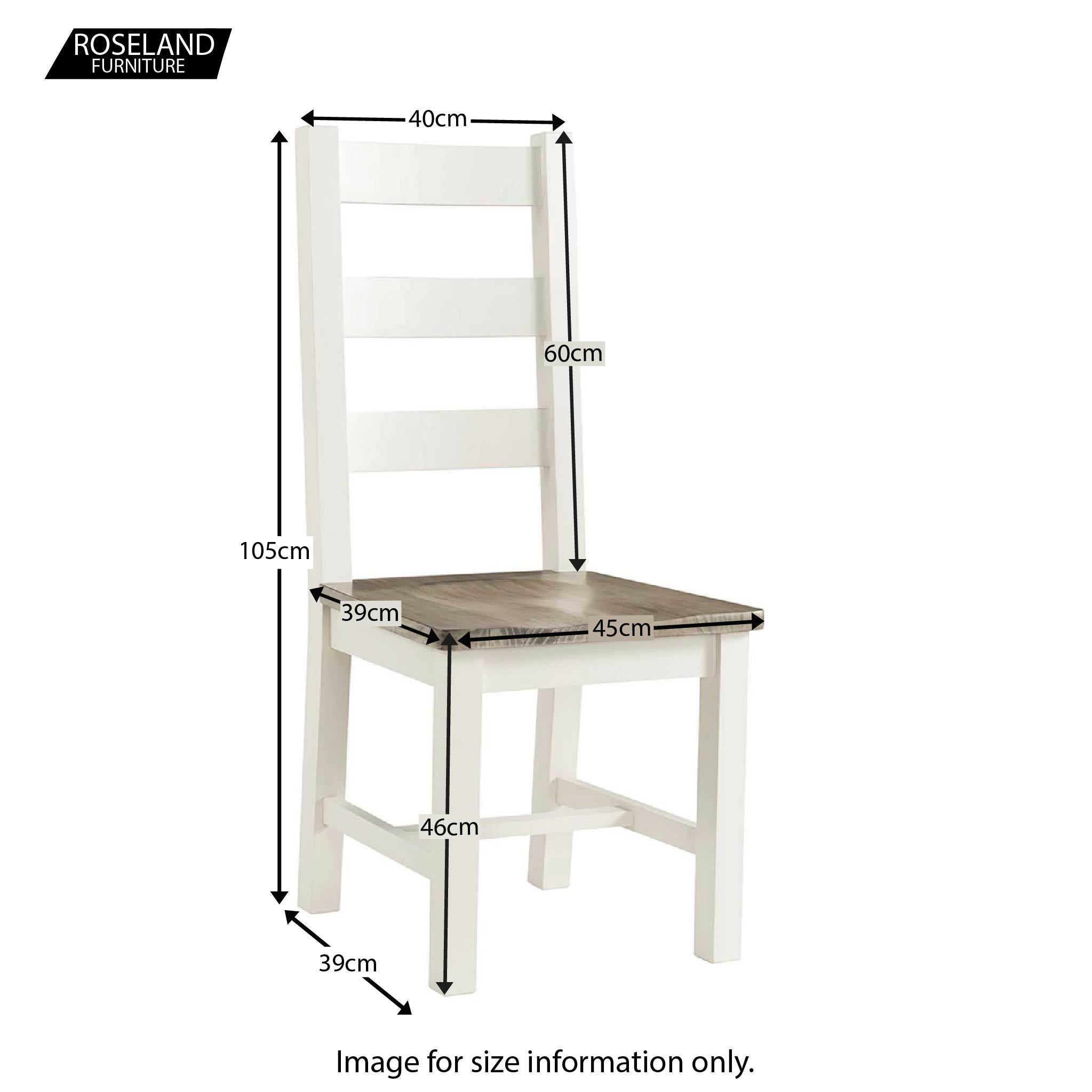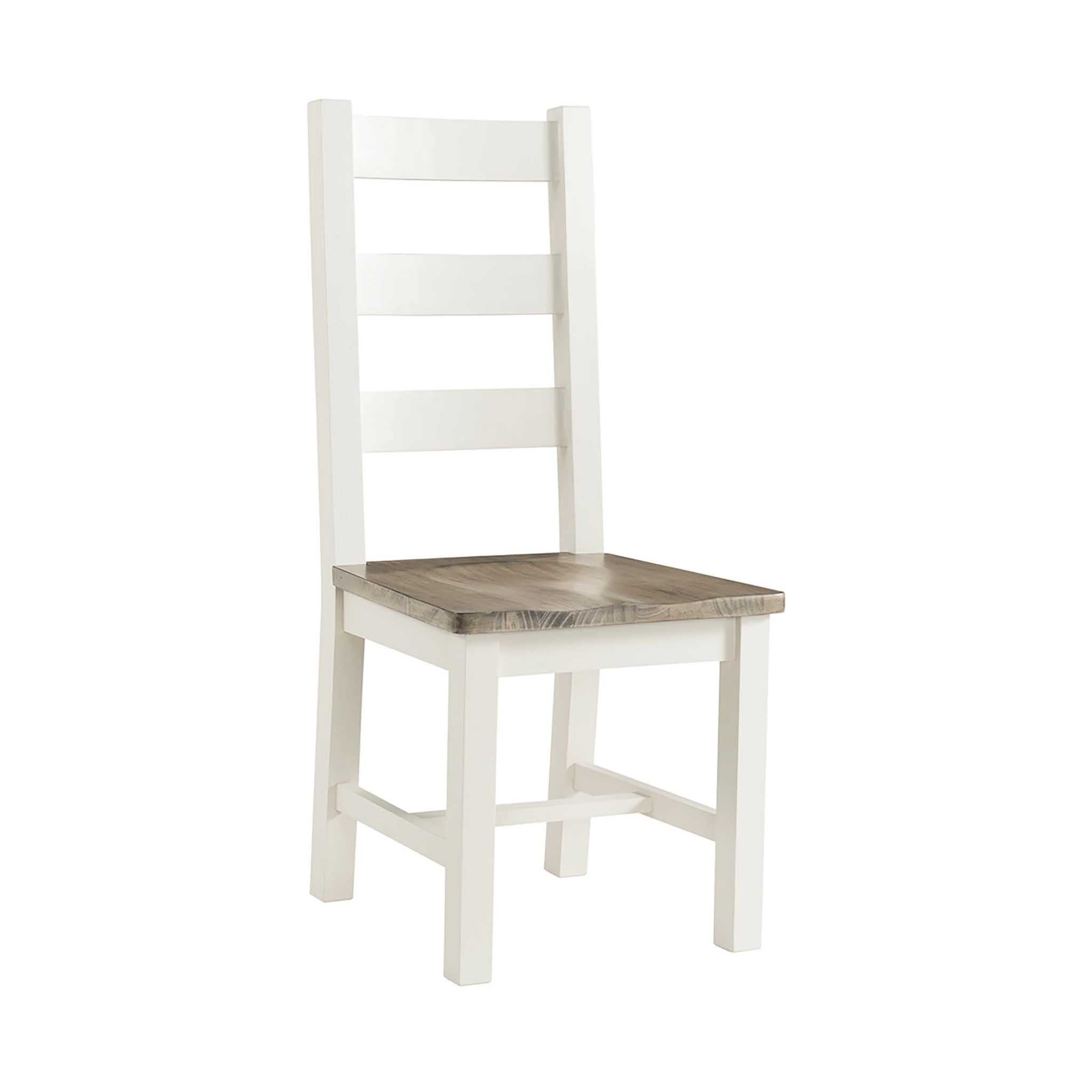Classic chic dining. A great example of a classic ladder back dining chair. Finished in linen white with ash seat, the solid build will last for years. Combine with a St Ives dining table or with a plain wood table to add interest to your dining room/kitchen.