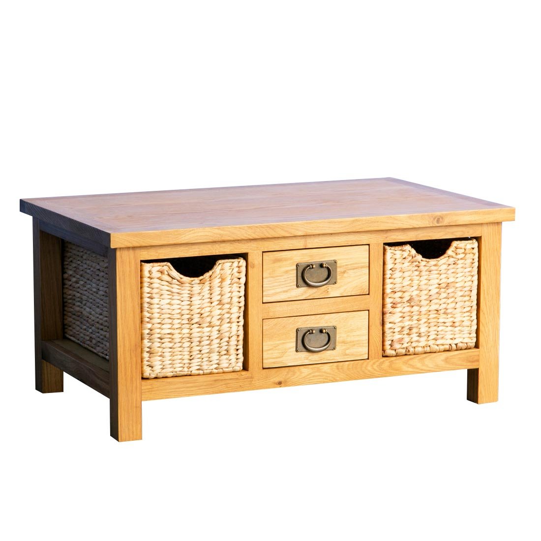 This rustic oak coffee table with storage baskets is part of our Surrey Oak range and crafted from quality oak and selected hardwood. A practical piece for the lounge that provides a useful table surface and storage below with its two spacious drawers and 2 water hyacinth deep woven baskets. Both the drawers and baskets can conveniently be accessed from both sides.