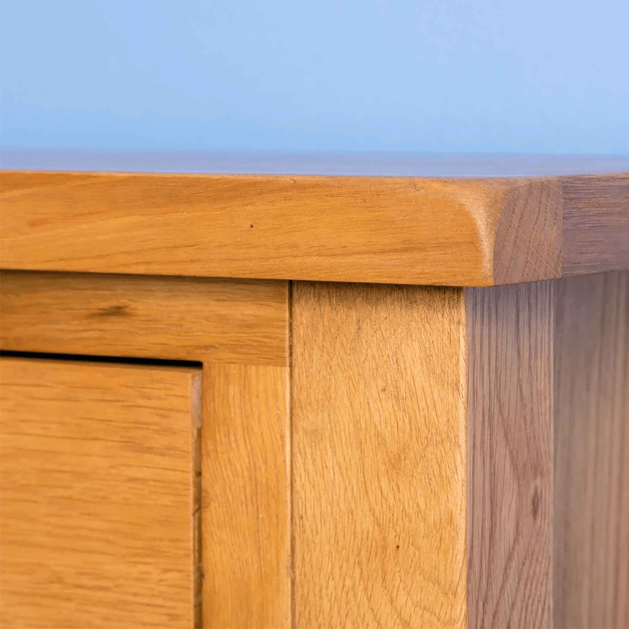 The rounded edges of each piece add charm to the warm rustic design. All drawers in the Surrey oak range are crafted with dovetail joints and feature traditional metal bronze effect drop-down handles.