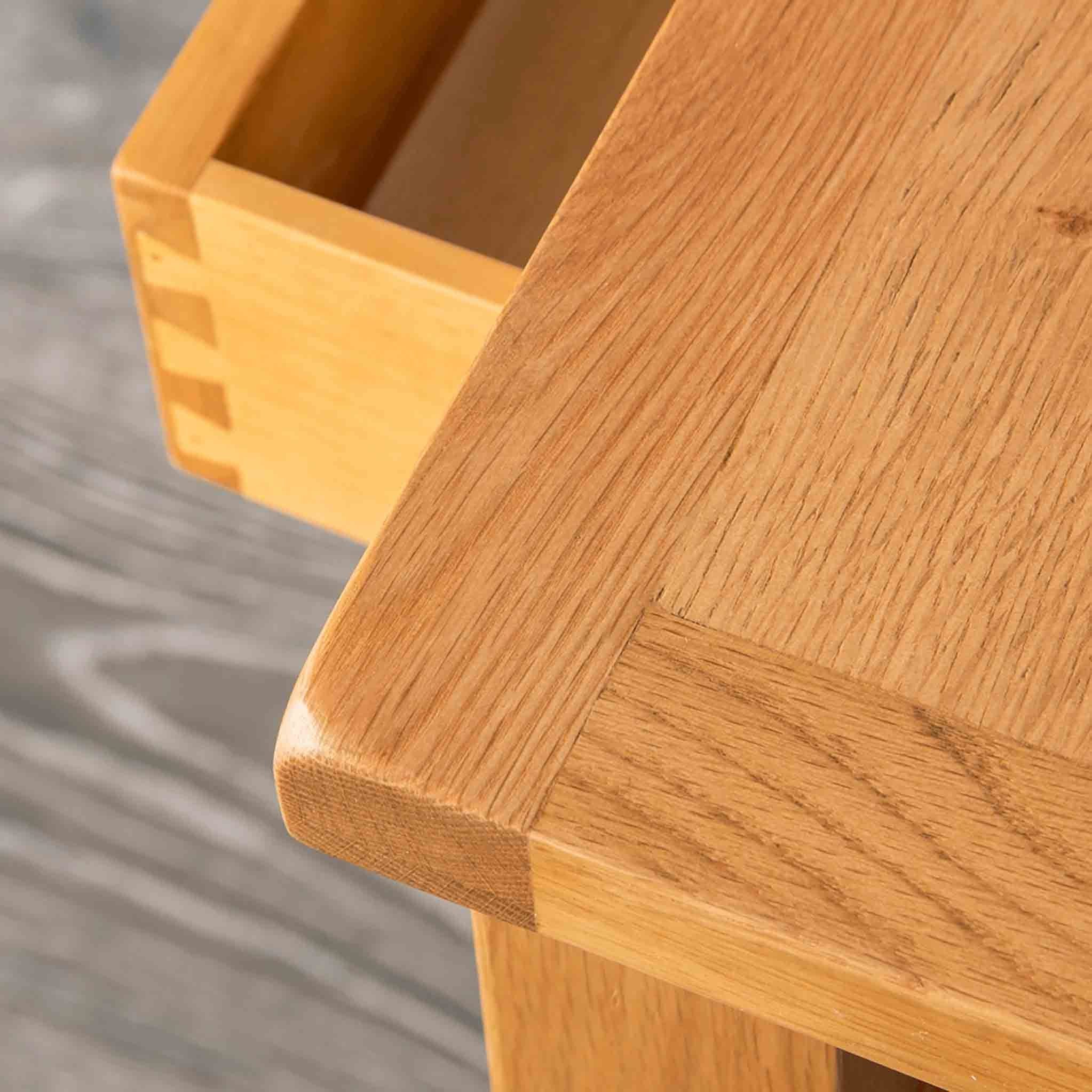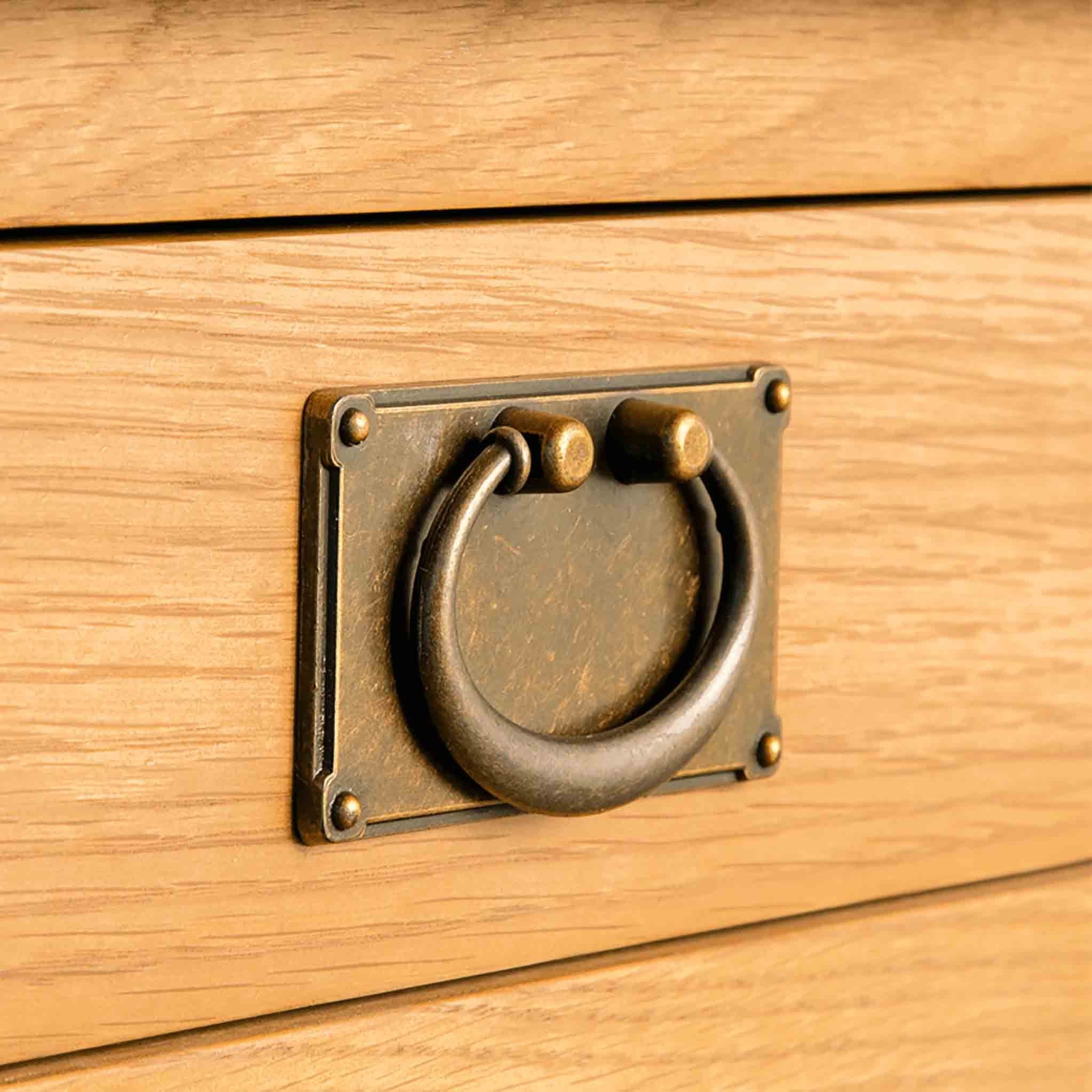The rounded edges of each piece add charm to the warm rustic design. All drawers in the Surrey oak range are crafted with dovetail joints and features a traditional metal bronze effect drop-down handle.