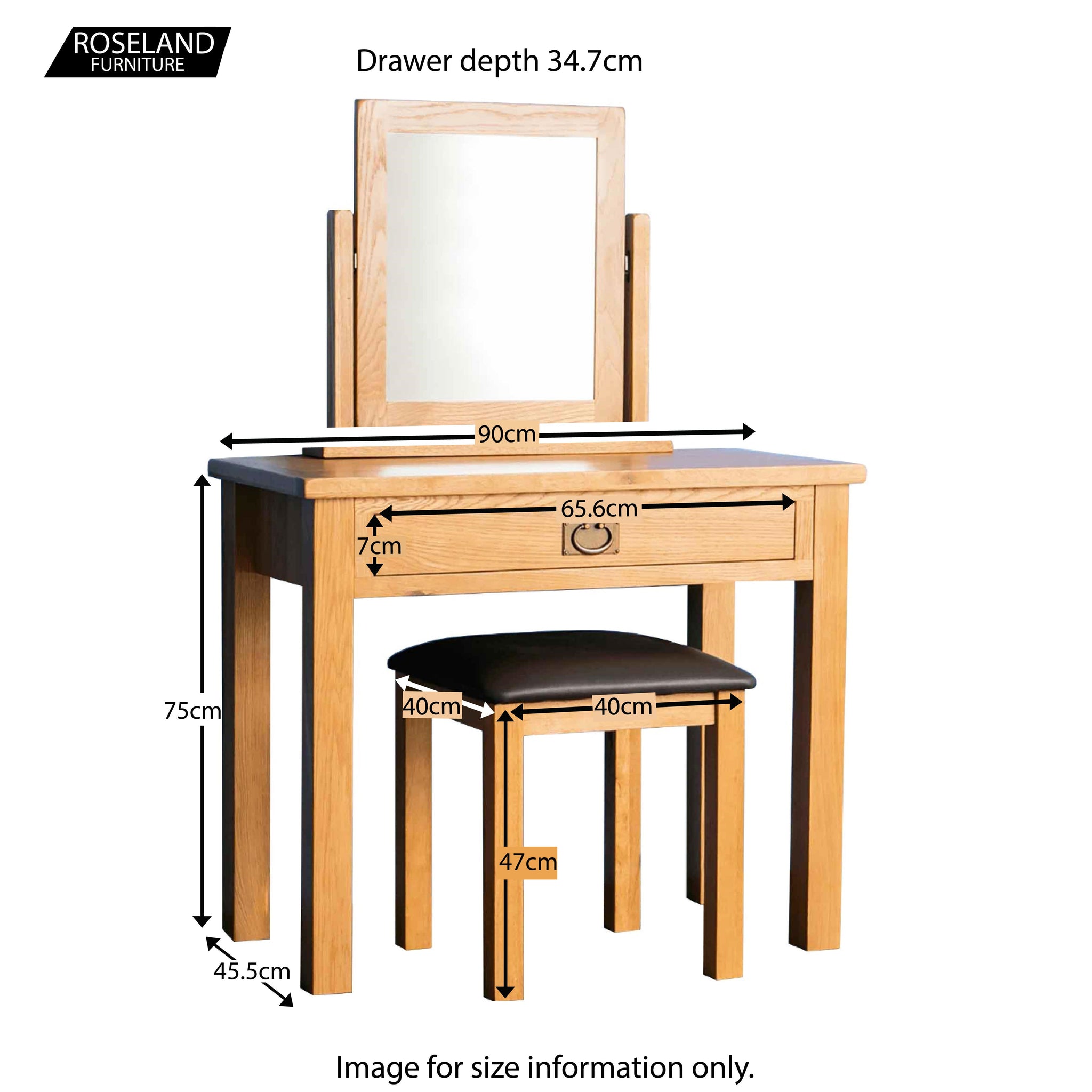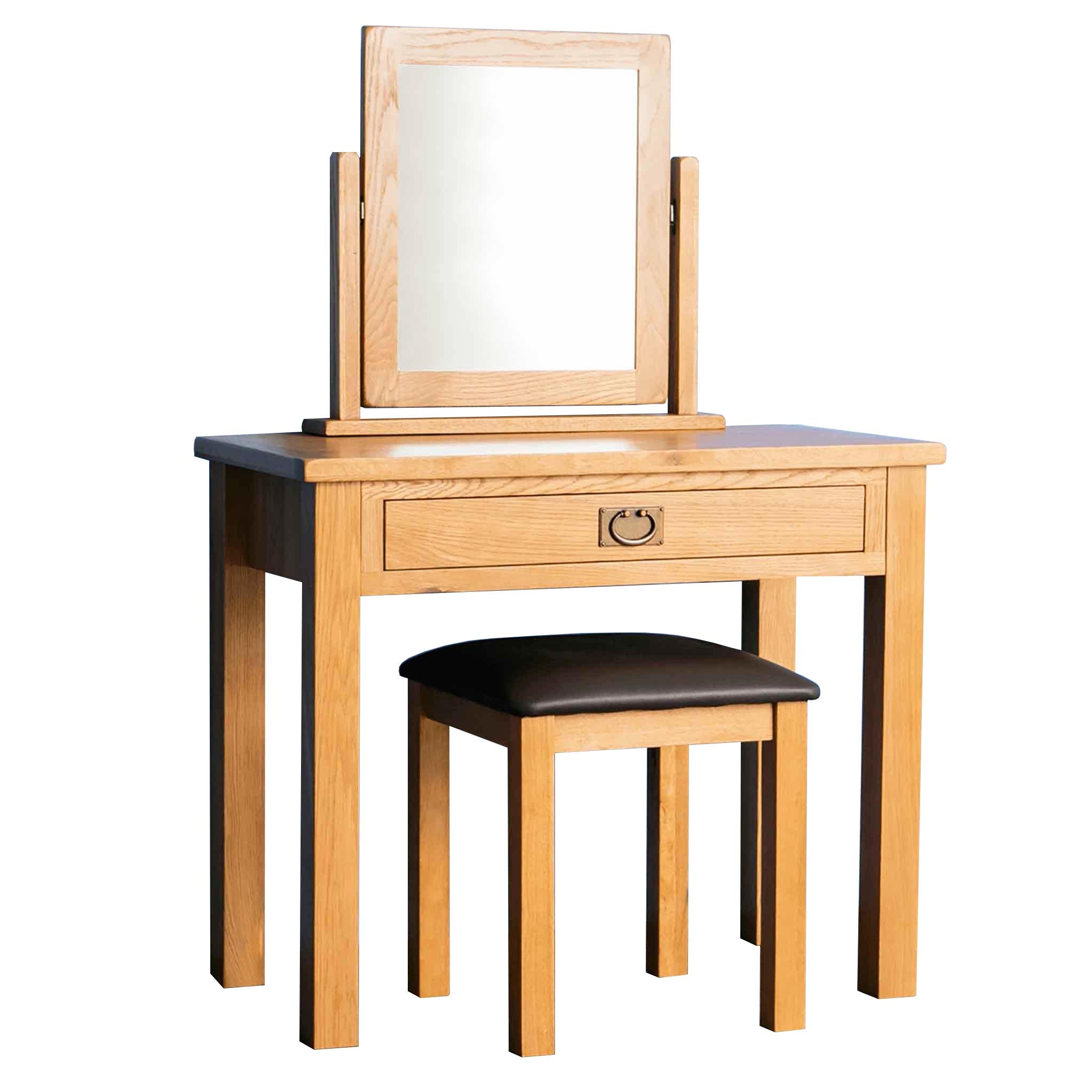- This modern oak dressing table set includes a dressing table, stool, and swivel mirror.