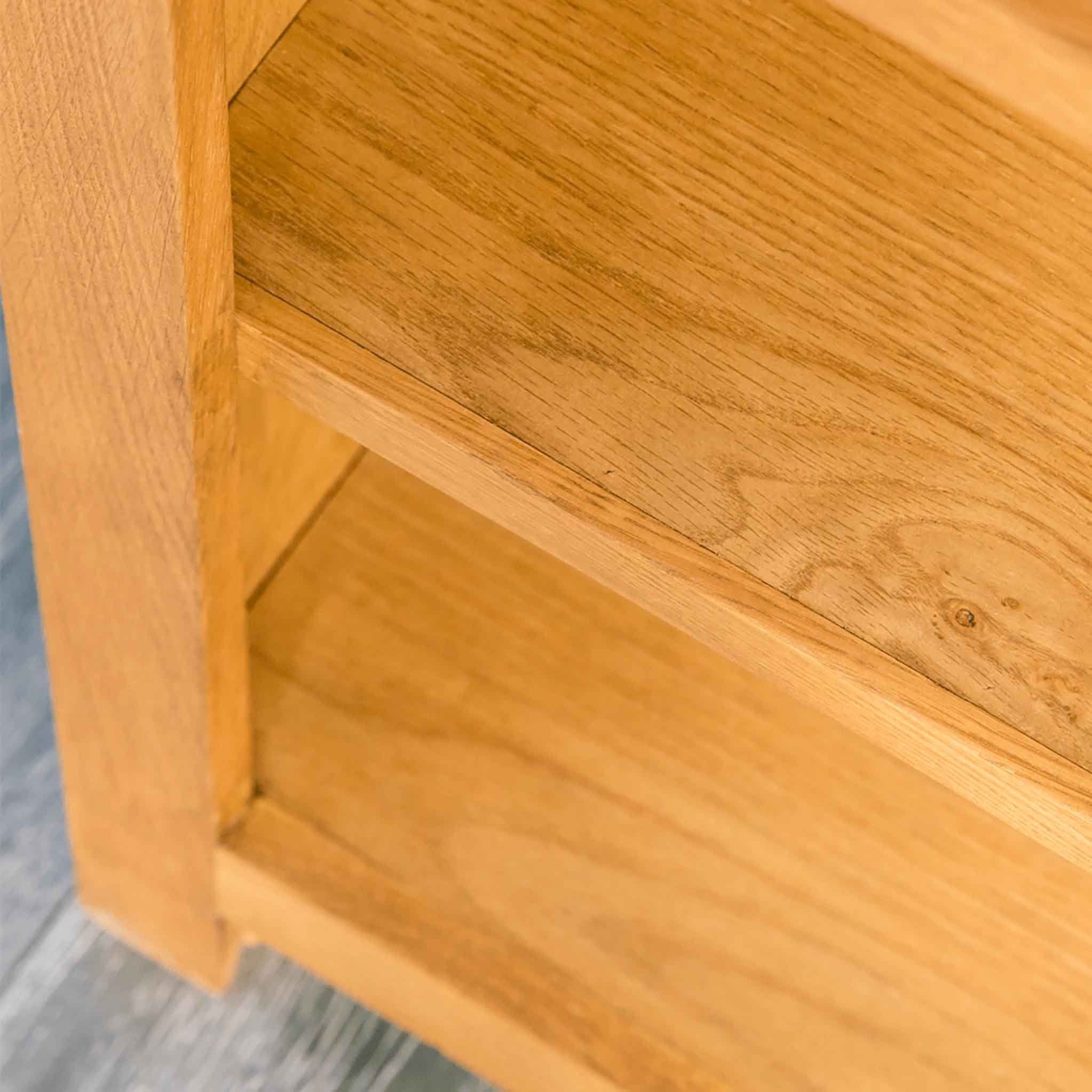 - It's a sturdy shelving unit - beautifully constructed from solid oak, solid wood, and finished in a waxed, rounded-edged, real oak top.