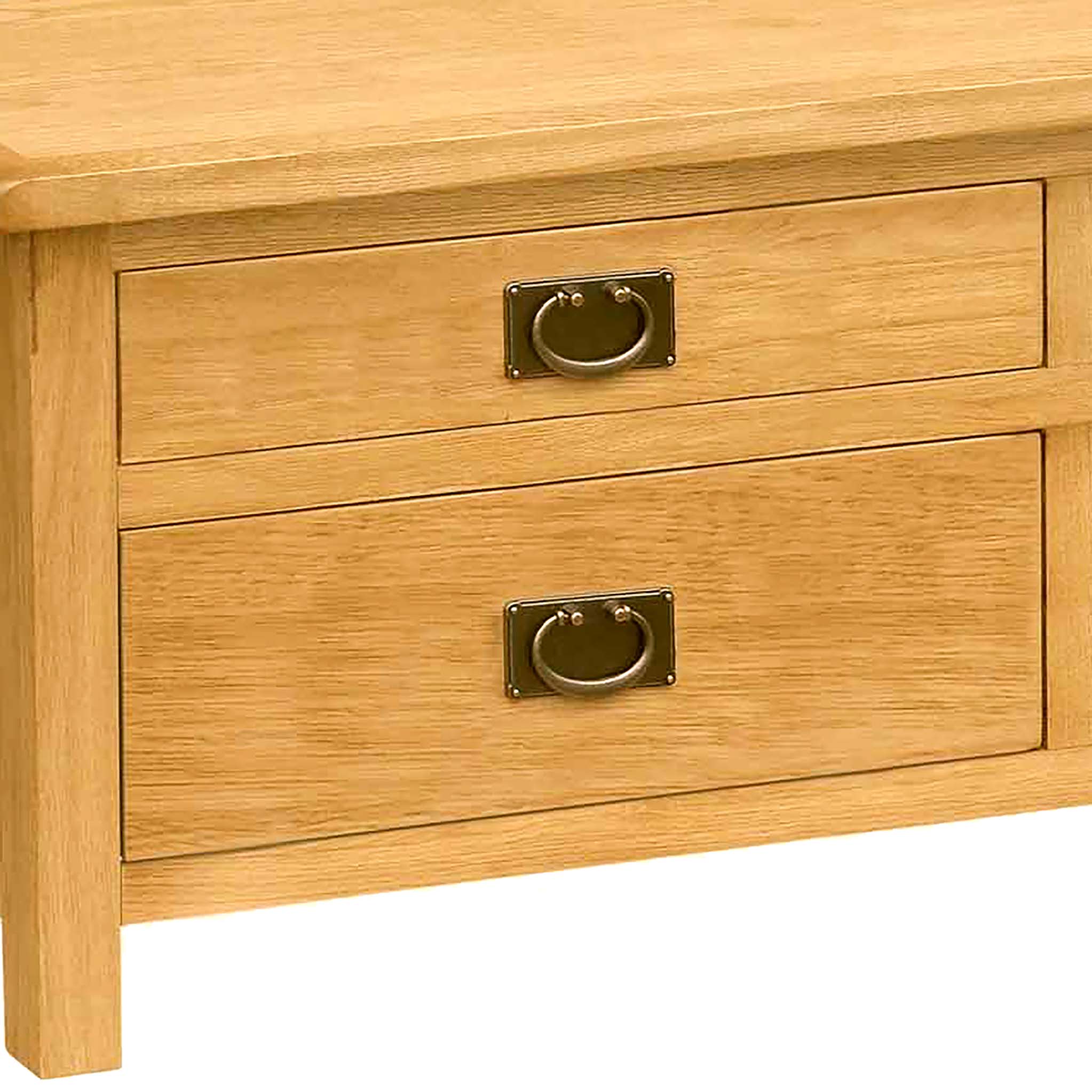 The rounded edges of each piece add charm to the warm rustic design. All drawers in the Surrey oak range are crafted with dovetail joints and feature traditional metal bronze effect drop-down handles.