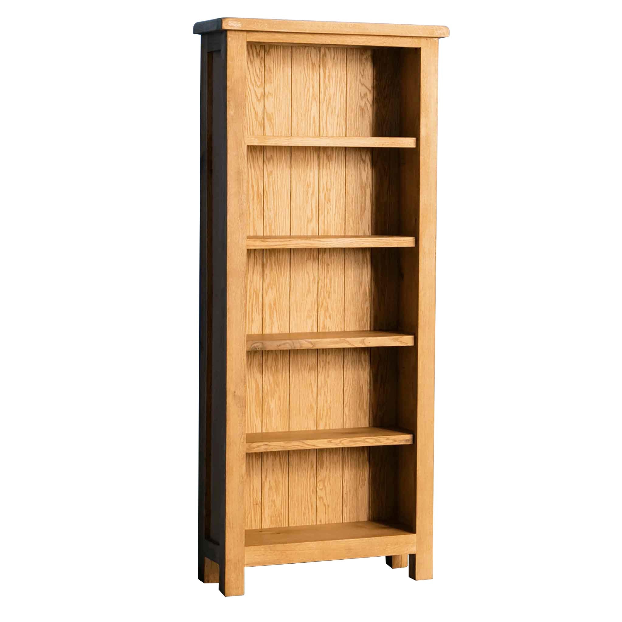 This tall, rustic, narrow oak bookcase is part of our Surrey Oak range and crafted from quality oak and selected hardwood. Designed to provide useful storage with its 5 tall shelves it's narrow design means it can always be incorporated into a hall if space is of the essence. The shelves are fixed and therefore nonadjustable and the rounded edges of each piece add charm to the warm rustic design.