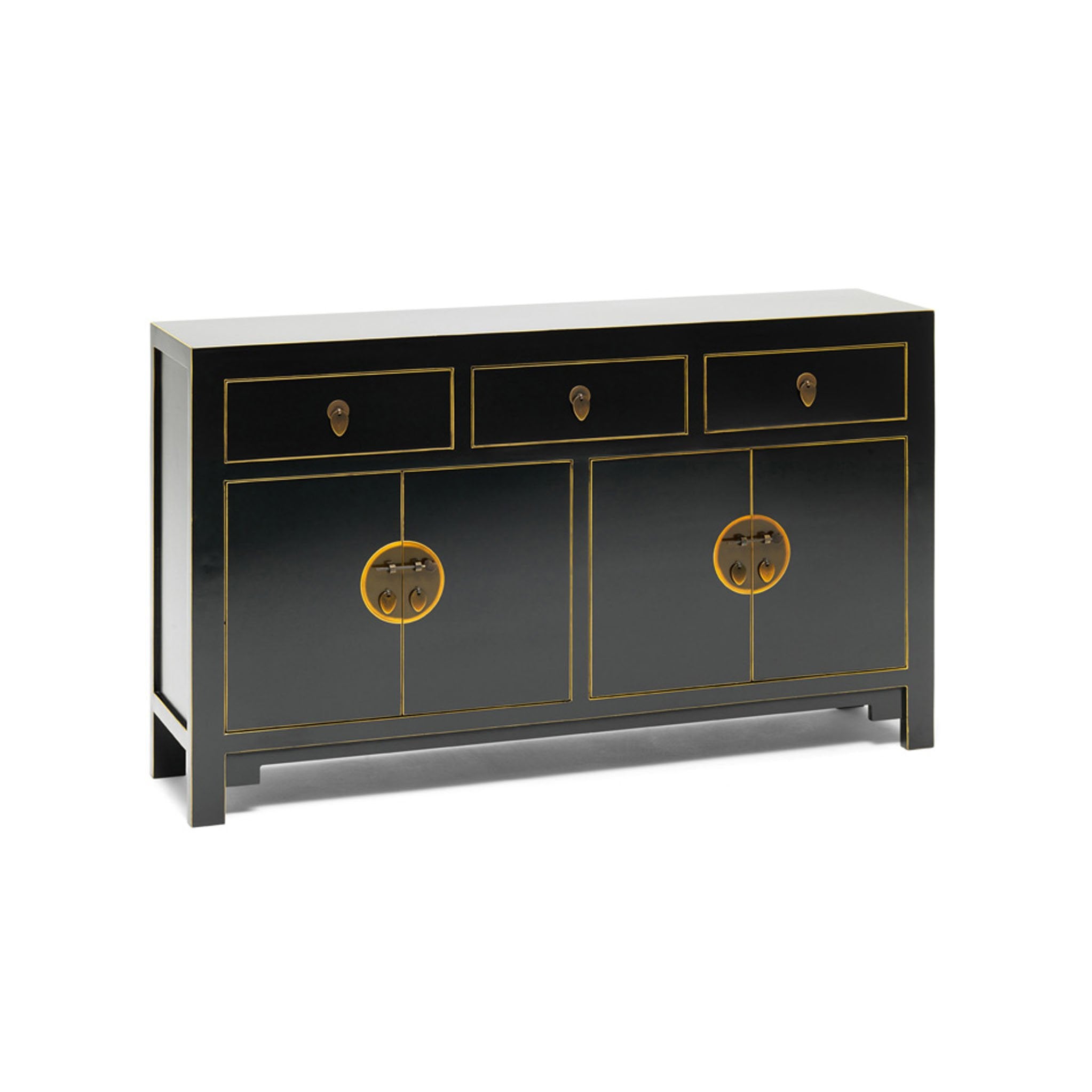 This beautiful gloss black sideboard will add some real character to the room. Crafted to an exceptionally high standard, it's finished with a rich gloss black paint and gold gilt edging. With three drawers and four doors (with an internal shelf), this sideboard also provides a generous amount of storage space.