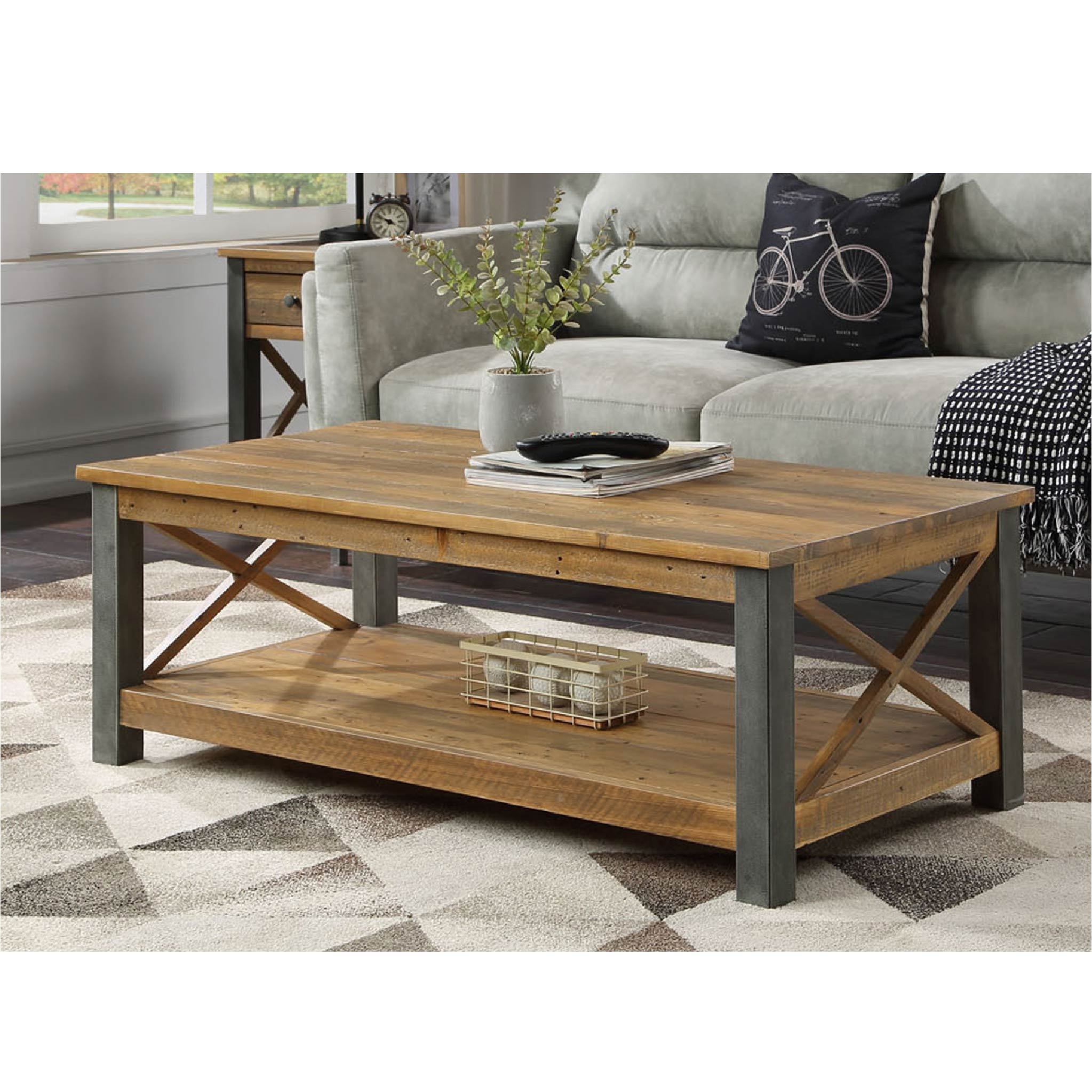 This charming, large coffee table features a practical open lower storage shelf and stylish cross-sectioned ends. A stunning, rustic coffee table that would not only stand out as a focal piece in a contemporary living space but would also look fantastic in a modern industrial styled bar or cafe.