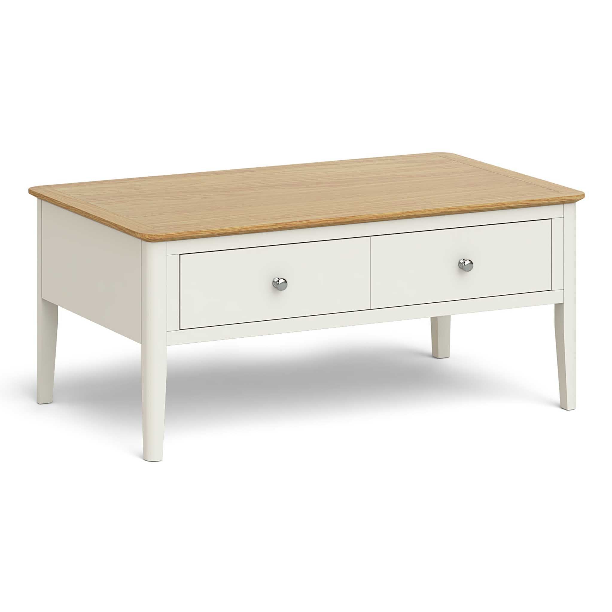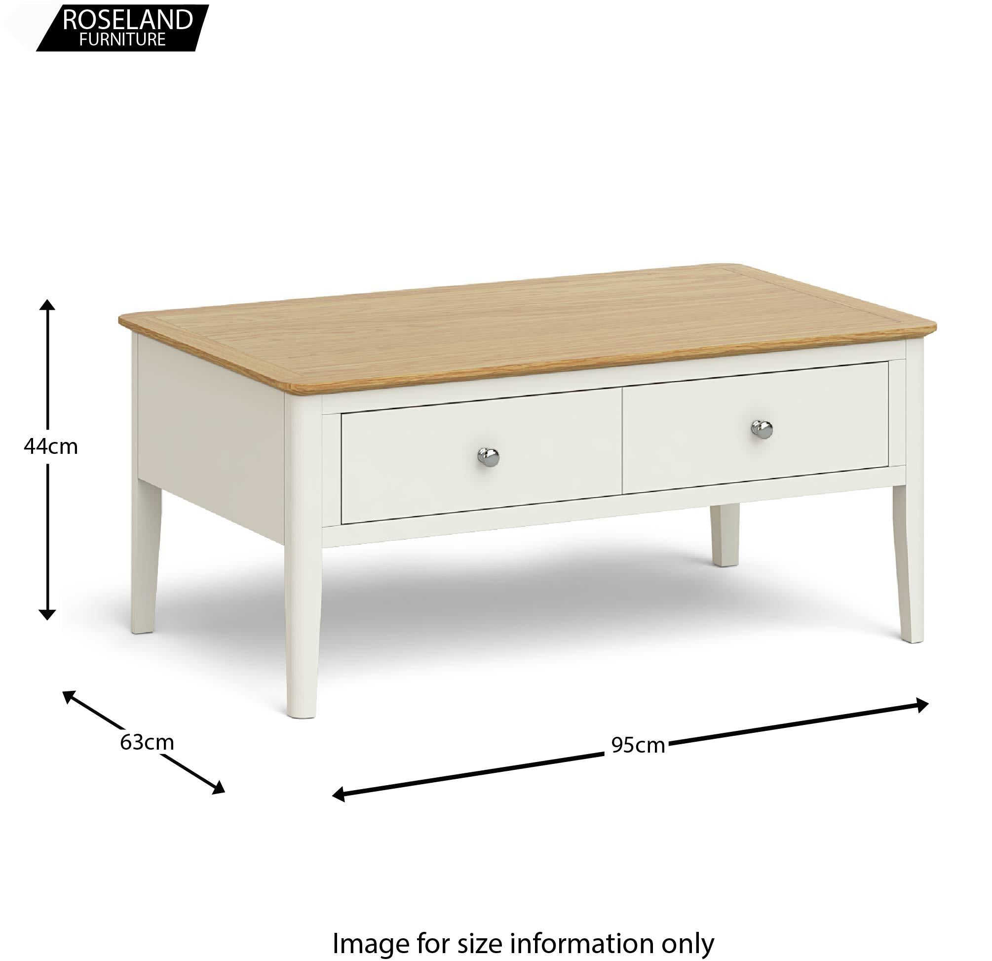 The Windsor Cream Coffee Table has a contemporary look and feel about it, comes in a soft satin easy to clean finish which is then crowned off with a rich warm coloured, lightly lacquered oak top with solid oak edging, creating an air of quality and character to your room. The large, single drawer provides ample storage space, whilst the oak top with solid oak frame makes for a stunning centrepiece to the room.