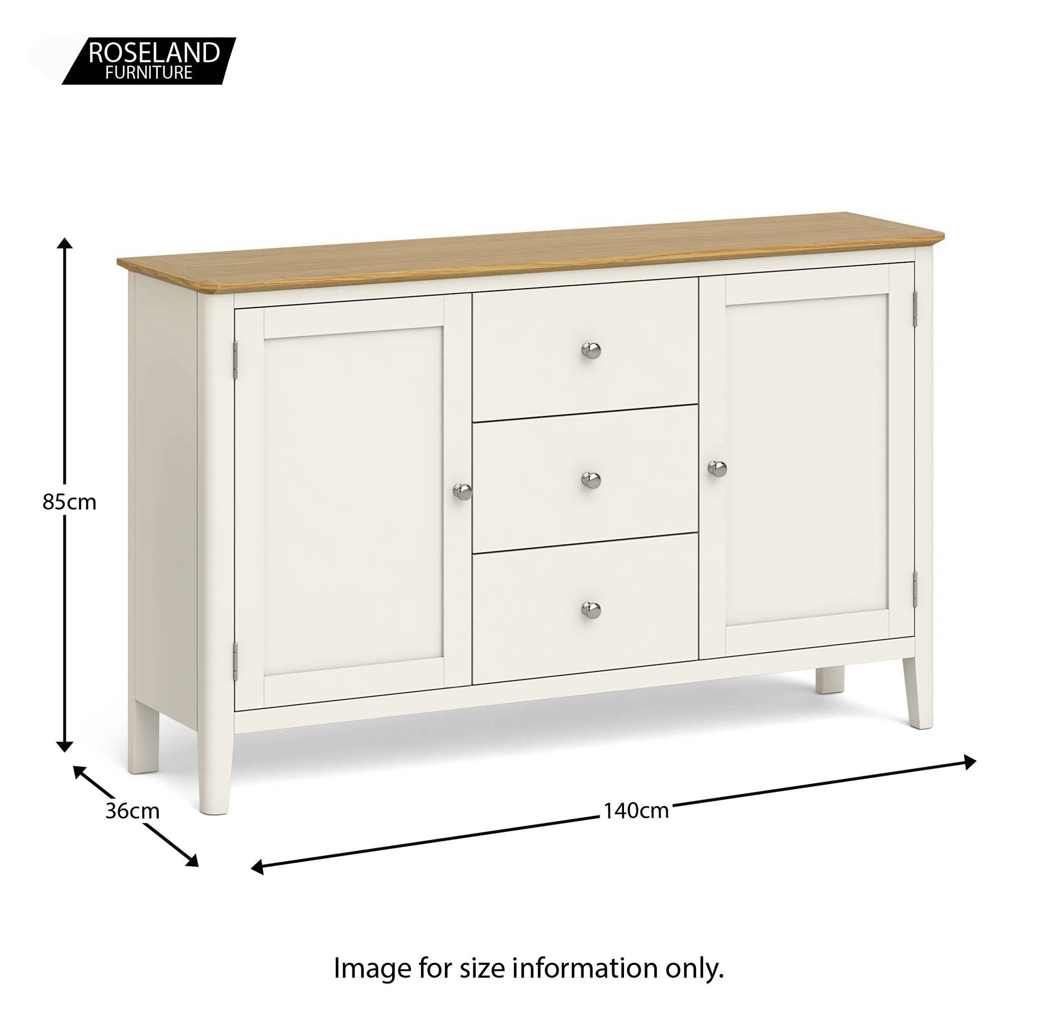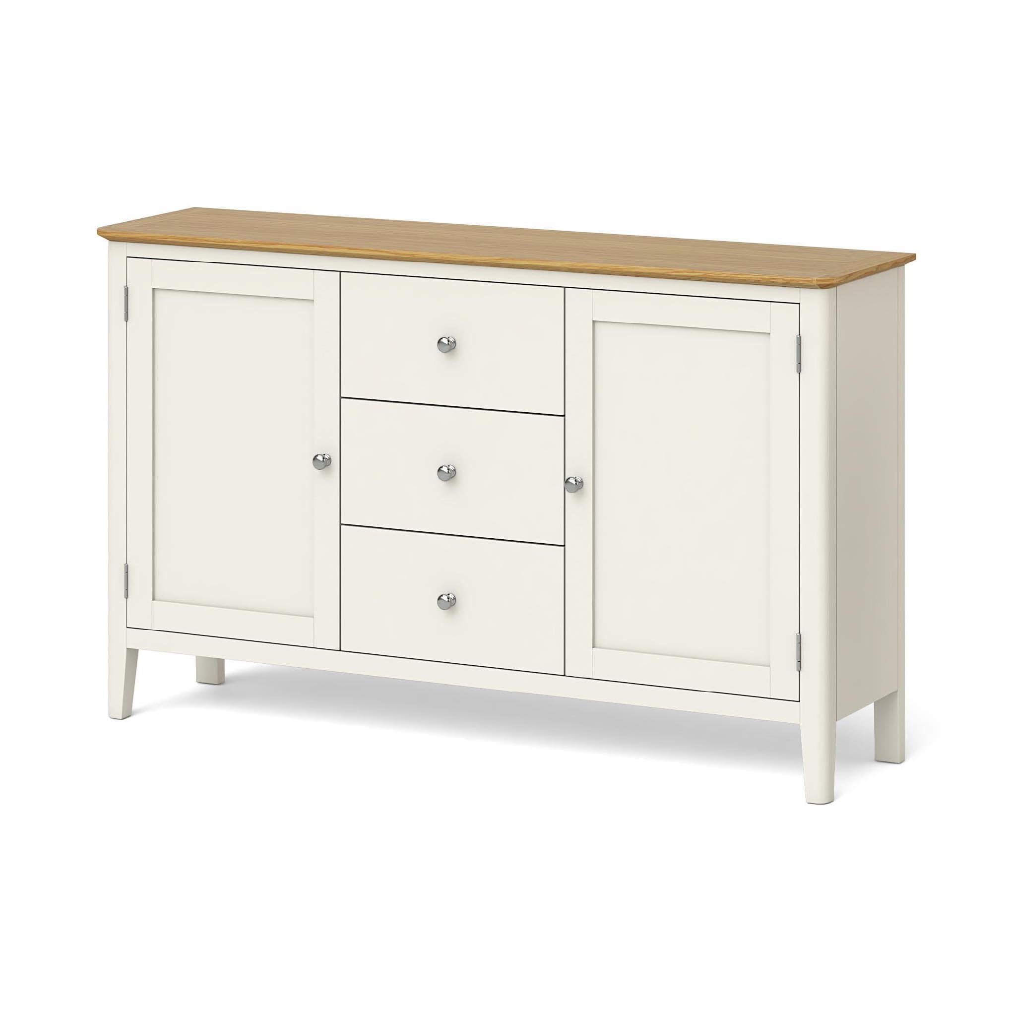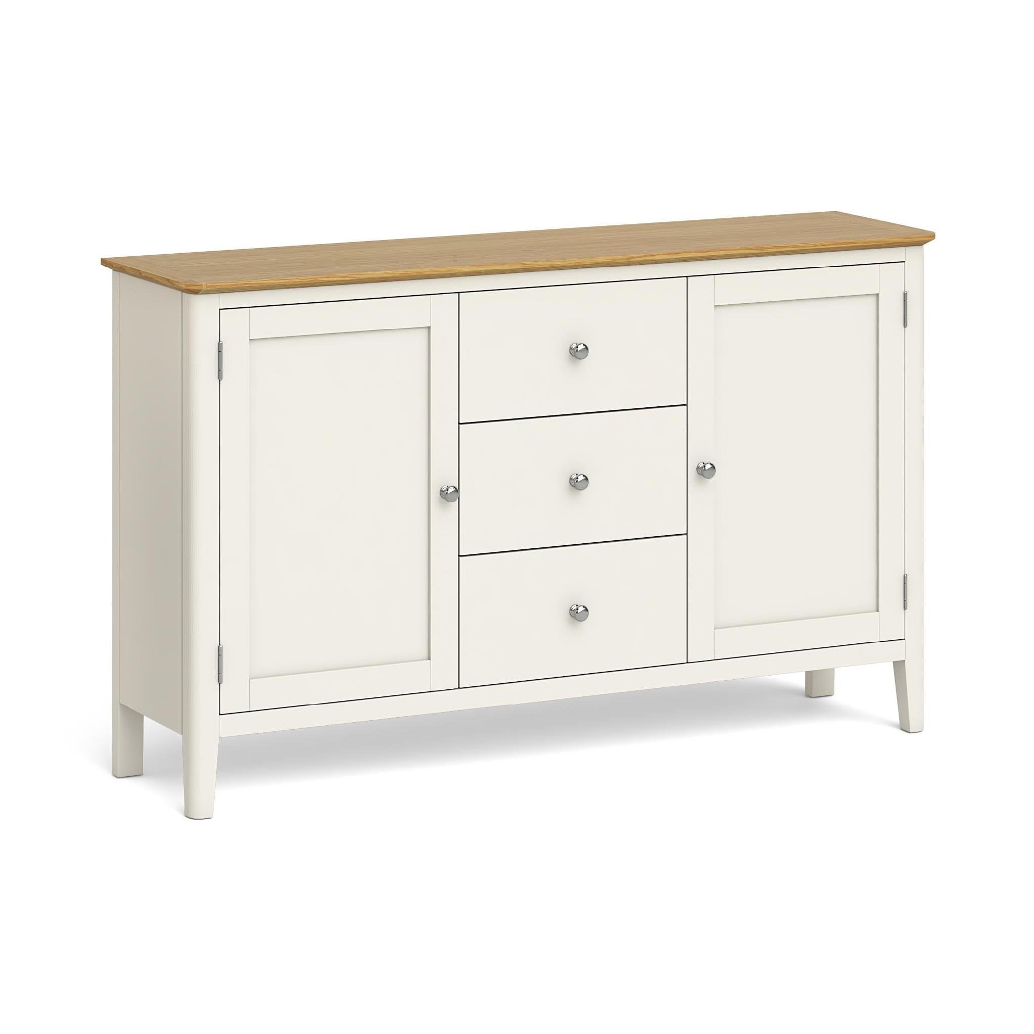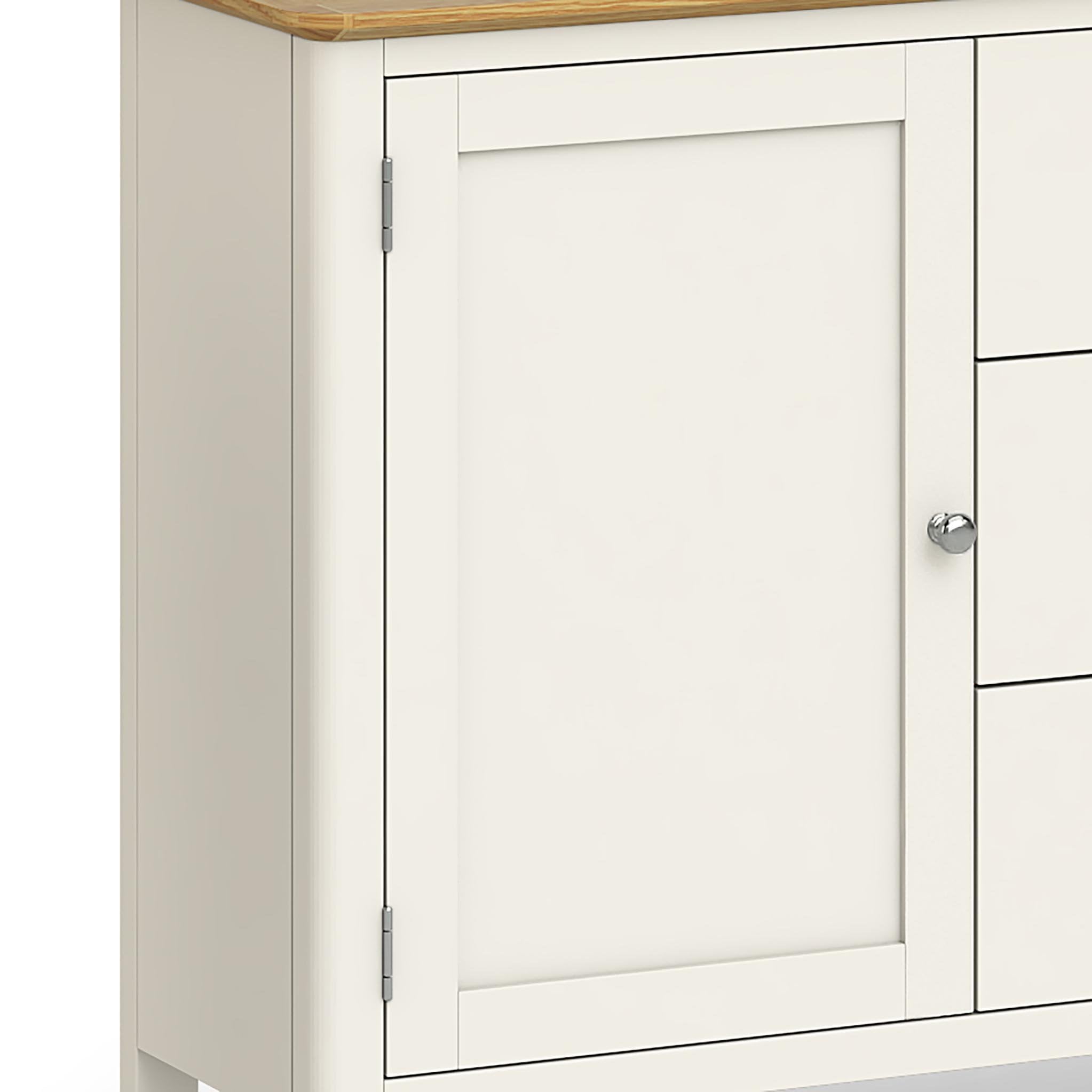 The Windsor Cream large sideboard is a beautiful and versatile piece of furniture that will bring character to any room. It's perfect for the living room or dining room and has two large cupboards and three deep drawers, which bring bags of storage. Its oak top with solid oak edges brings a classic, timeless look and the satin painted cream sides are light and airy.