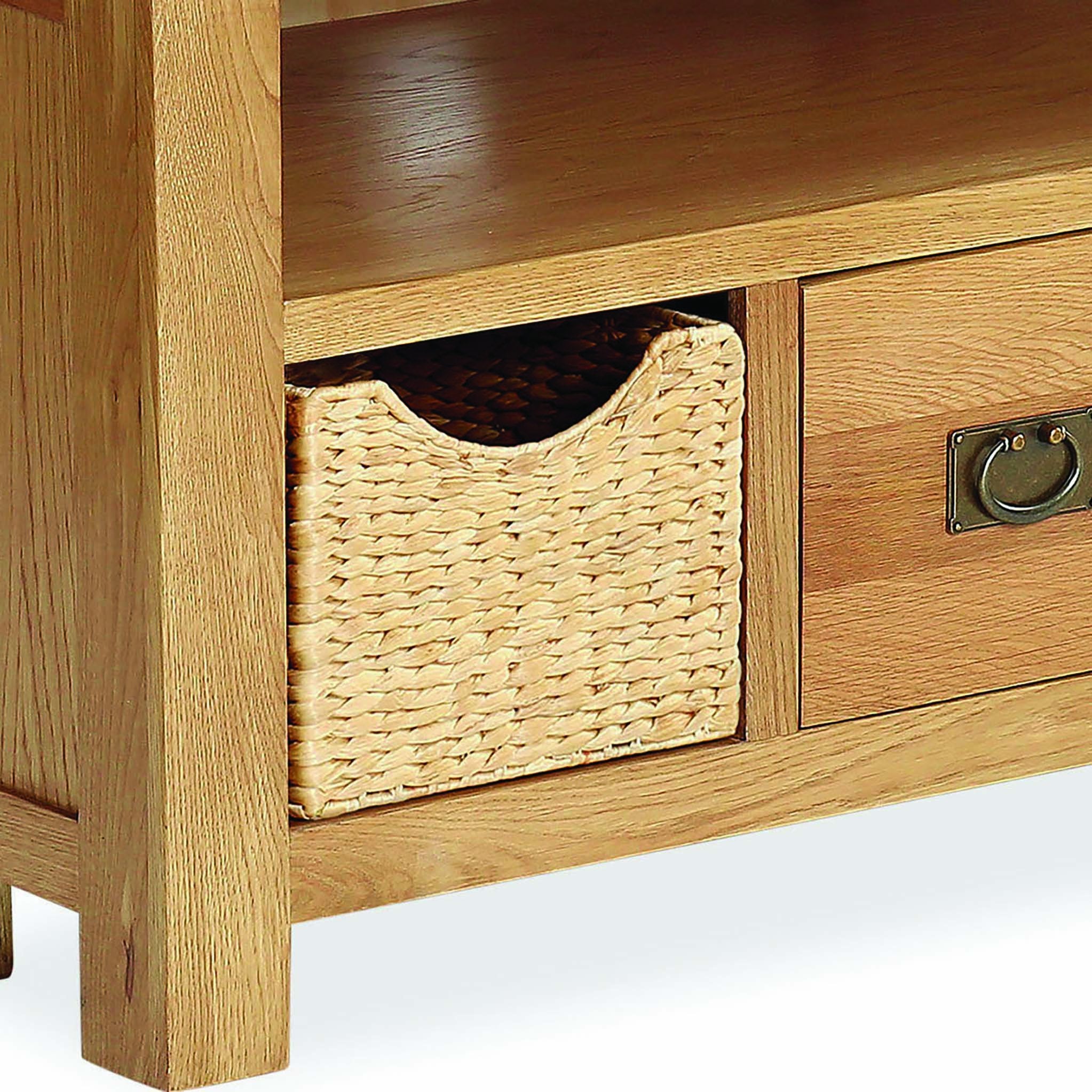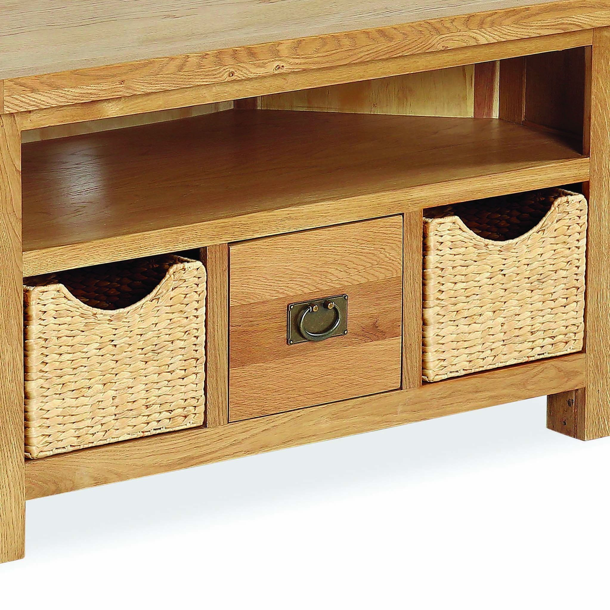 This corner TV stand with two baskets and drawer provides plenty of storage space for spare remotes, manuals etc. The shelf has a cable hole to keep everything neat and tidy.