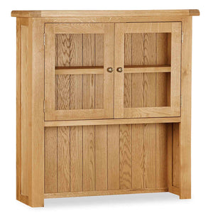 This Zelah small hutch is a fantastic feature to the home looking great in any dining area or kitchen. With two glass door cabinets for that extra bit of storage space, you need providing a simple, classic, country look. Handmade from high-quality oak the Zelah range adds a rustic touch to any room. Combine with the Zelah Oak Small Sideboard to make a stunning small dresser.